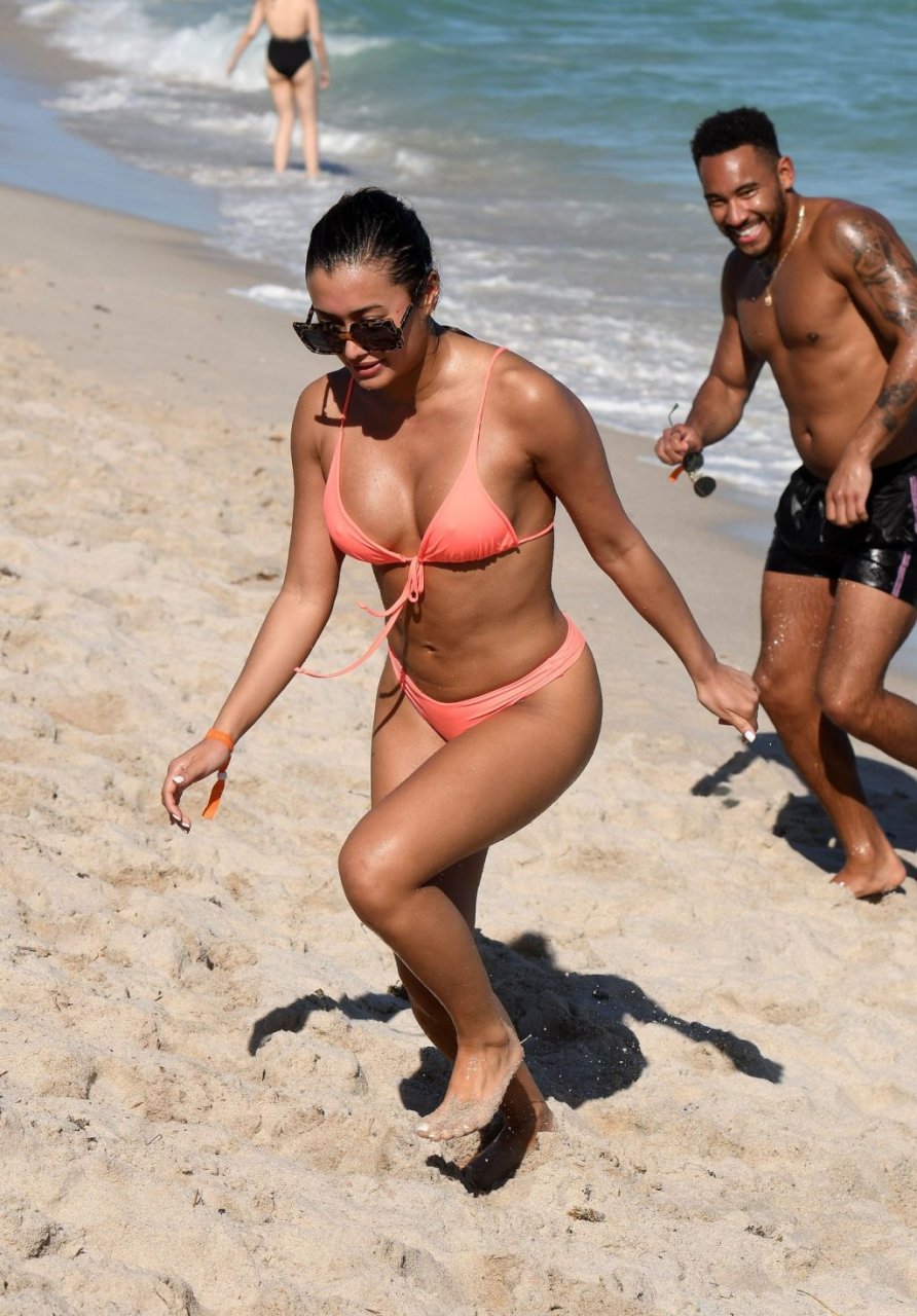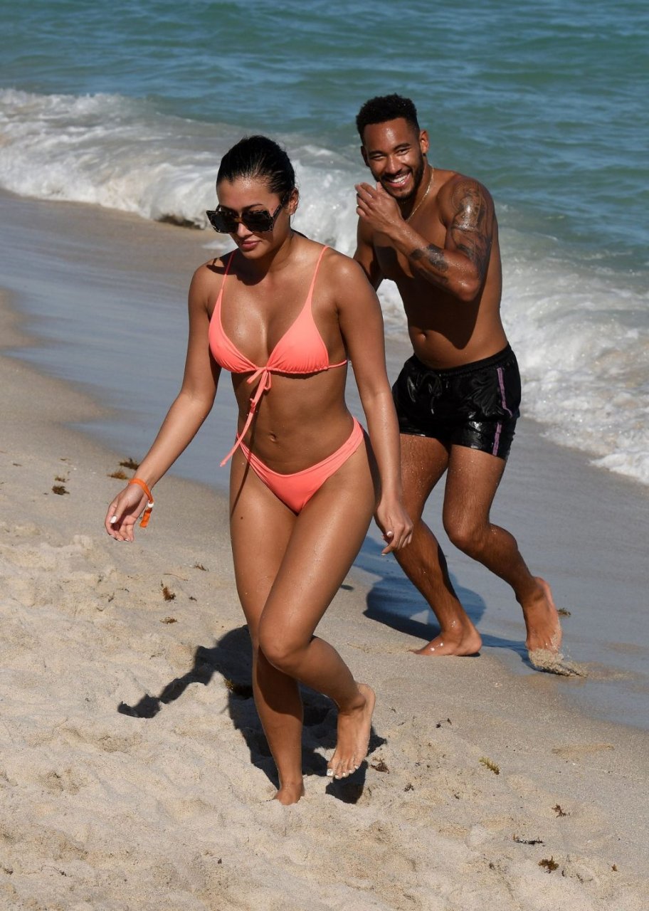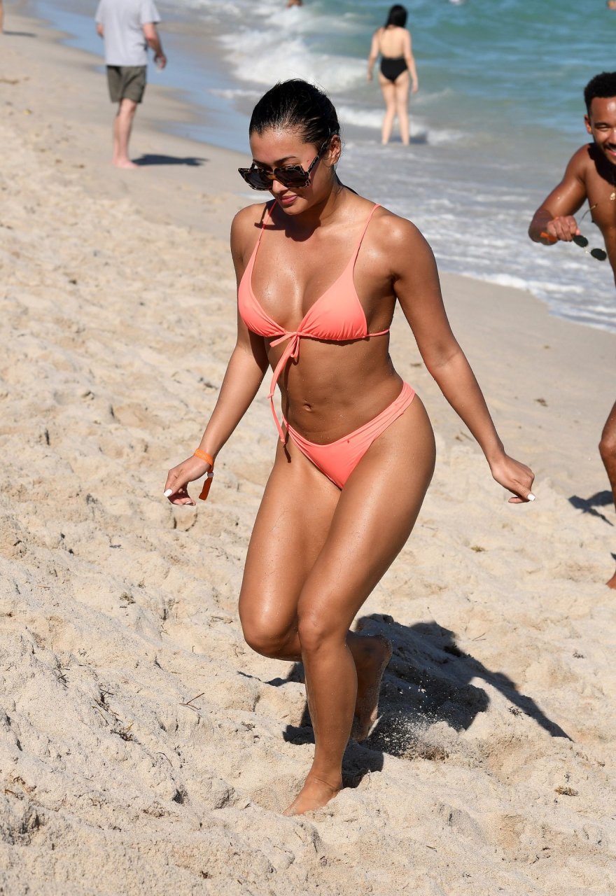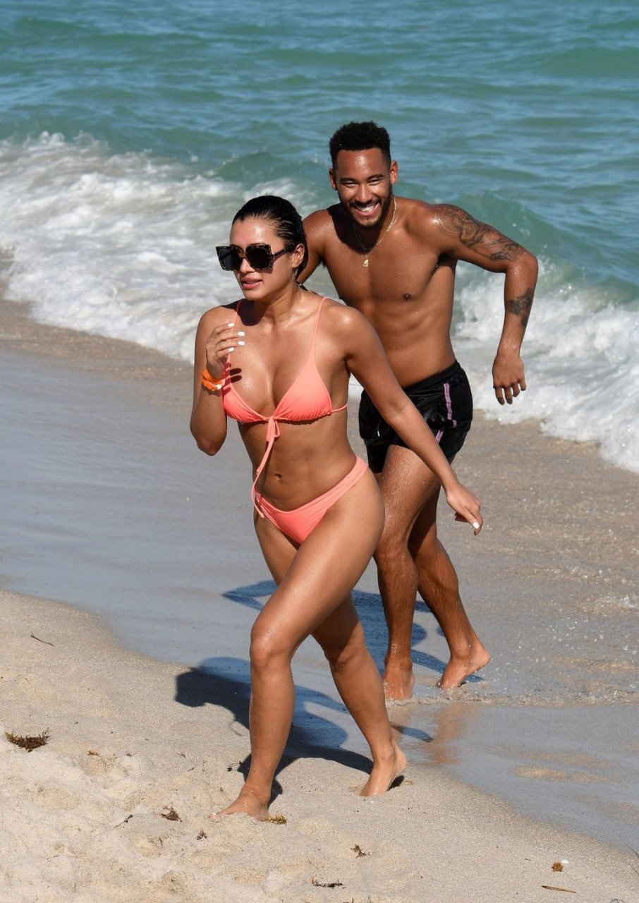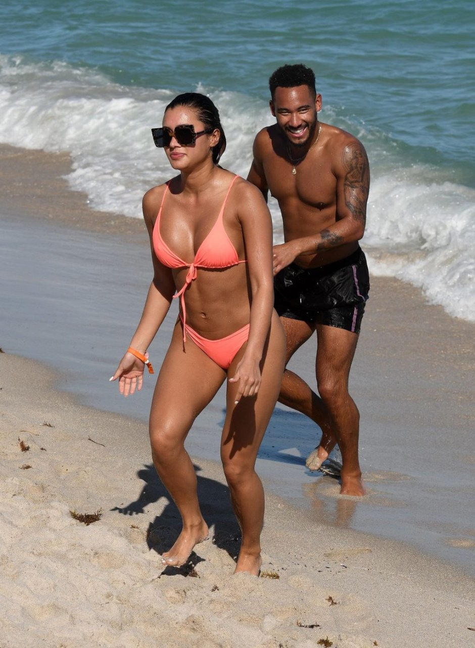 Kazimir “Kaz” Crossley de Love Island lleva un bikini color durazno mientras disfruta de la playa con su novio Josh Denzel en Miami, 01/02/2019.