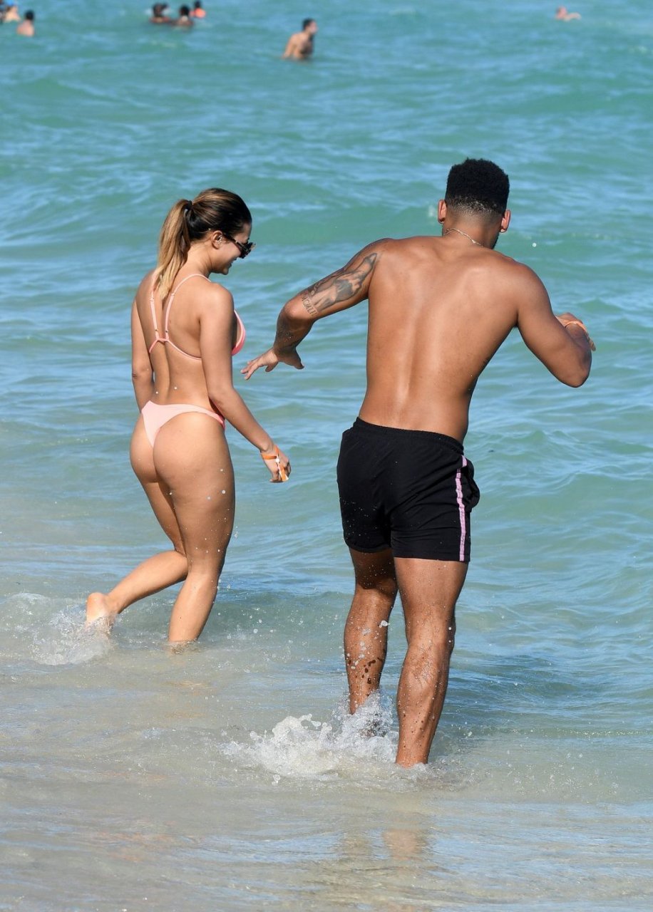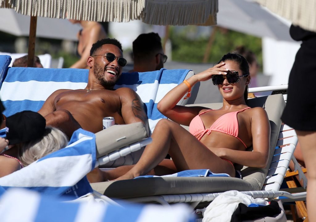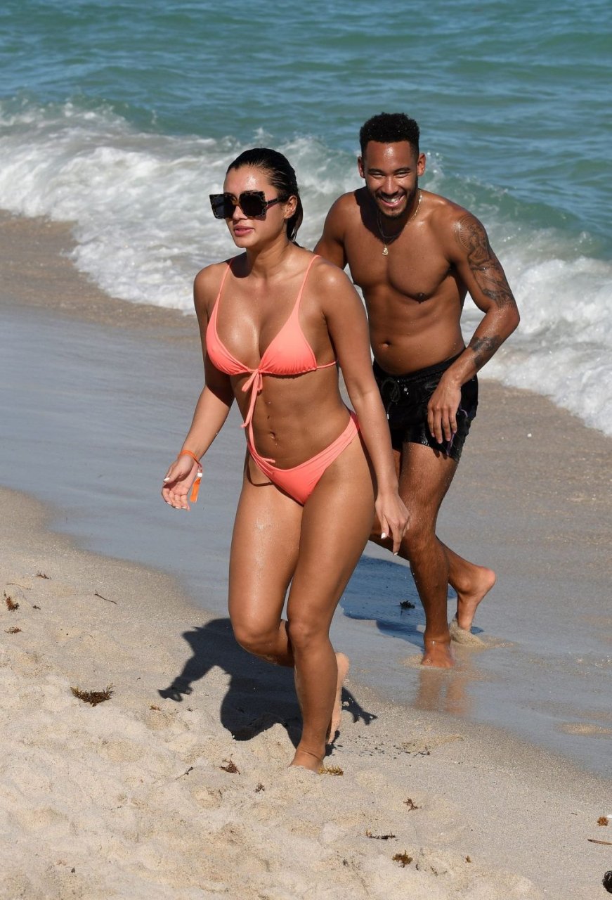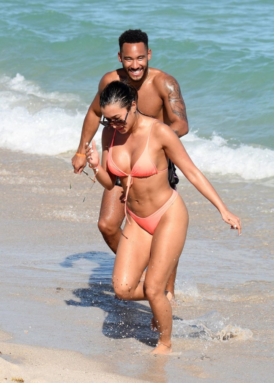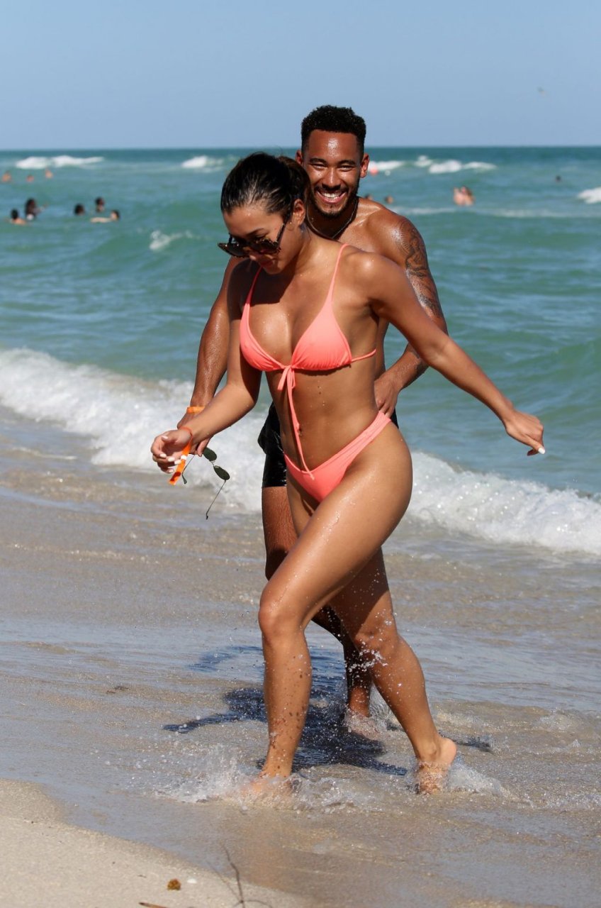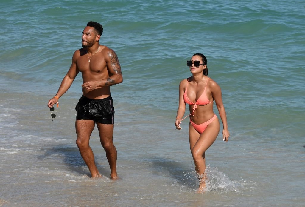 Kazimir “Kaz” Crossley de Love Island lleva un bikini color durazno mientras disfruta de la playa con su novio Josh Denzel en Miami, 01/02/2019.