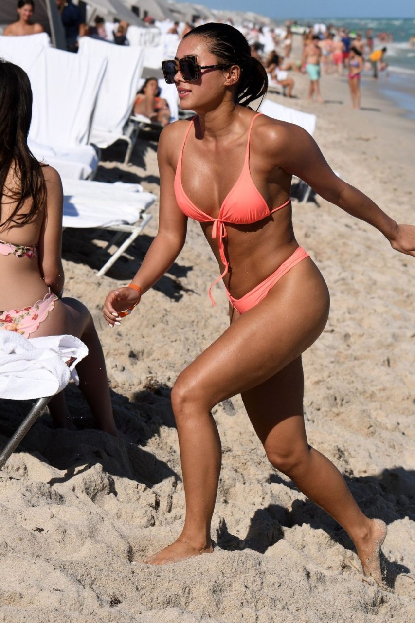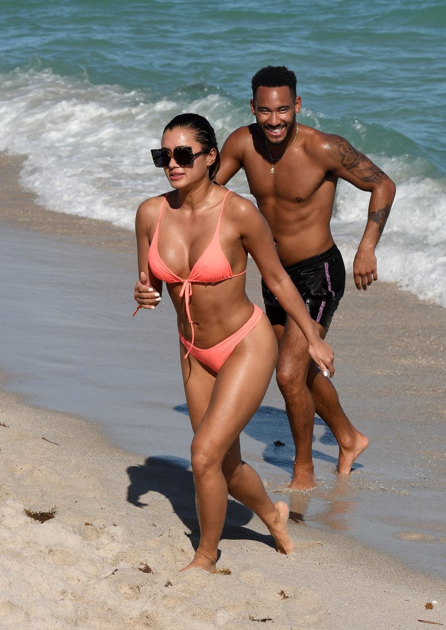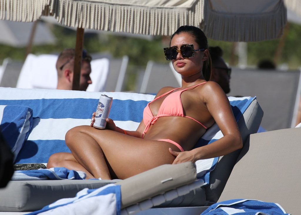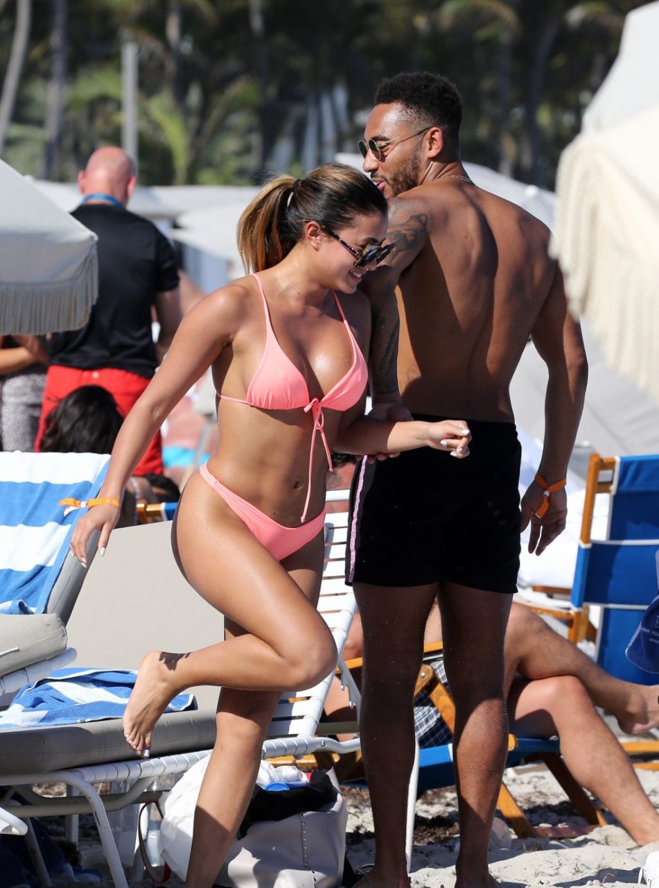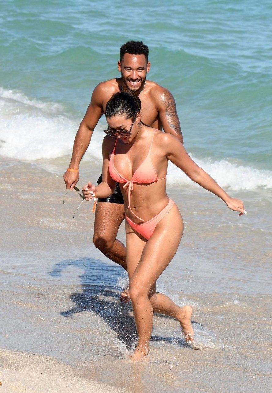 Kazimir “Kaz” Crossley de Love Island lleva un bikini color durazno mientras disfruta de la playa con su novio Josh Denzel en Miami, 01/02/2019.