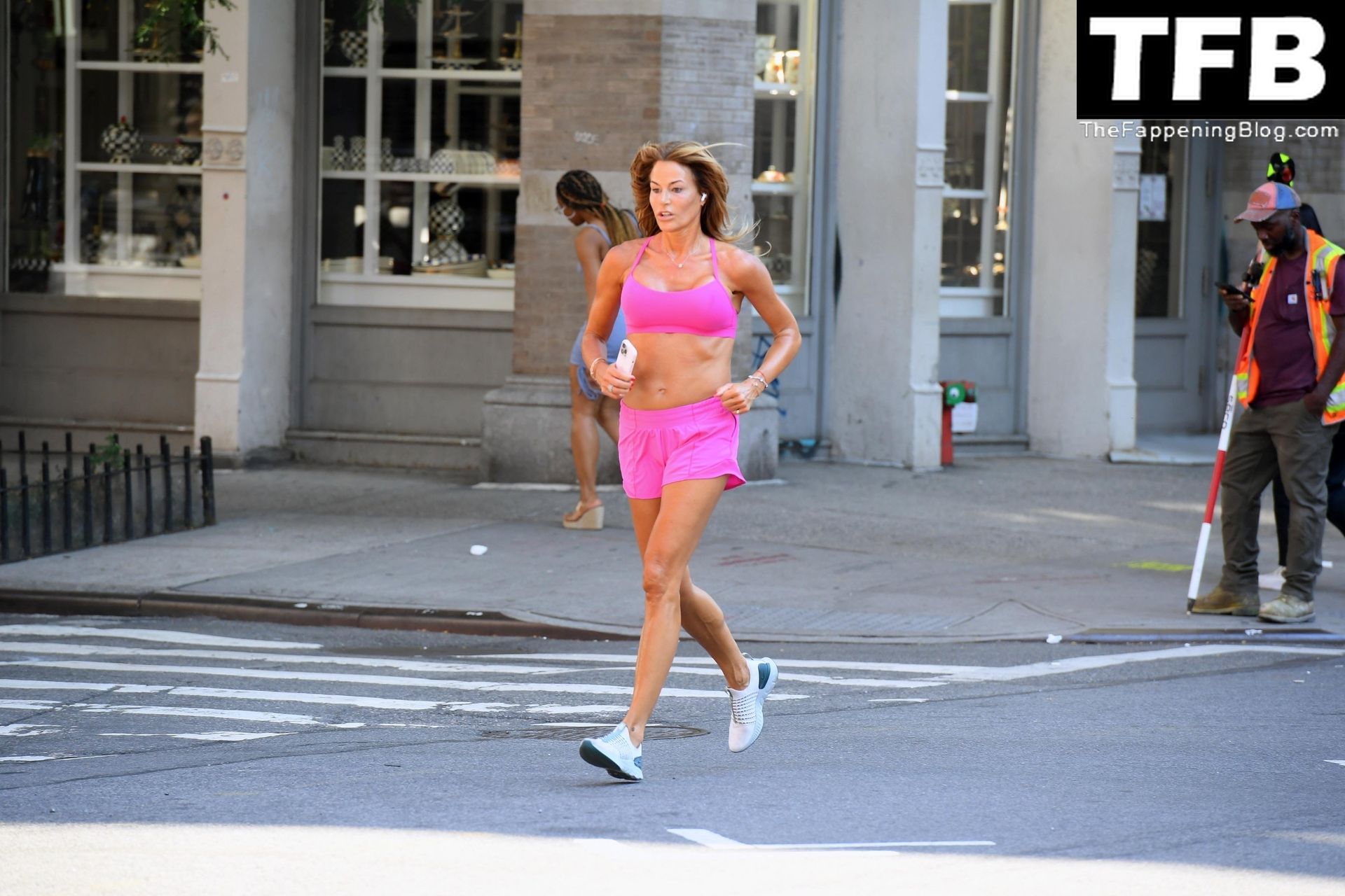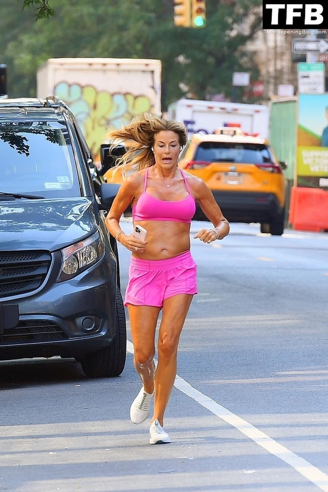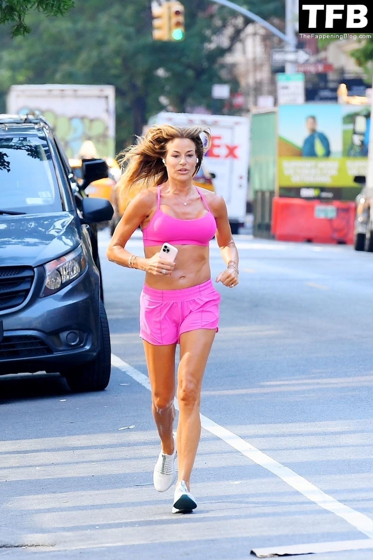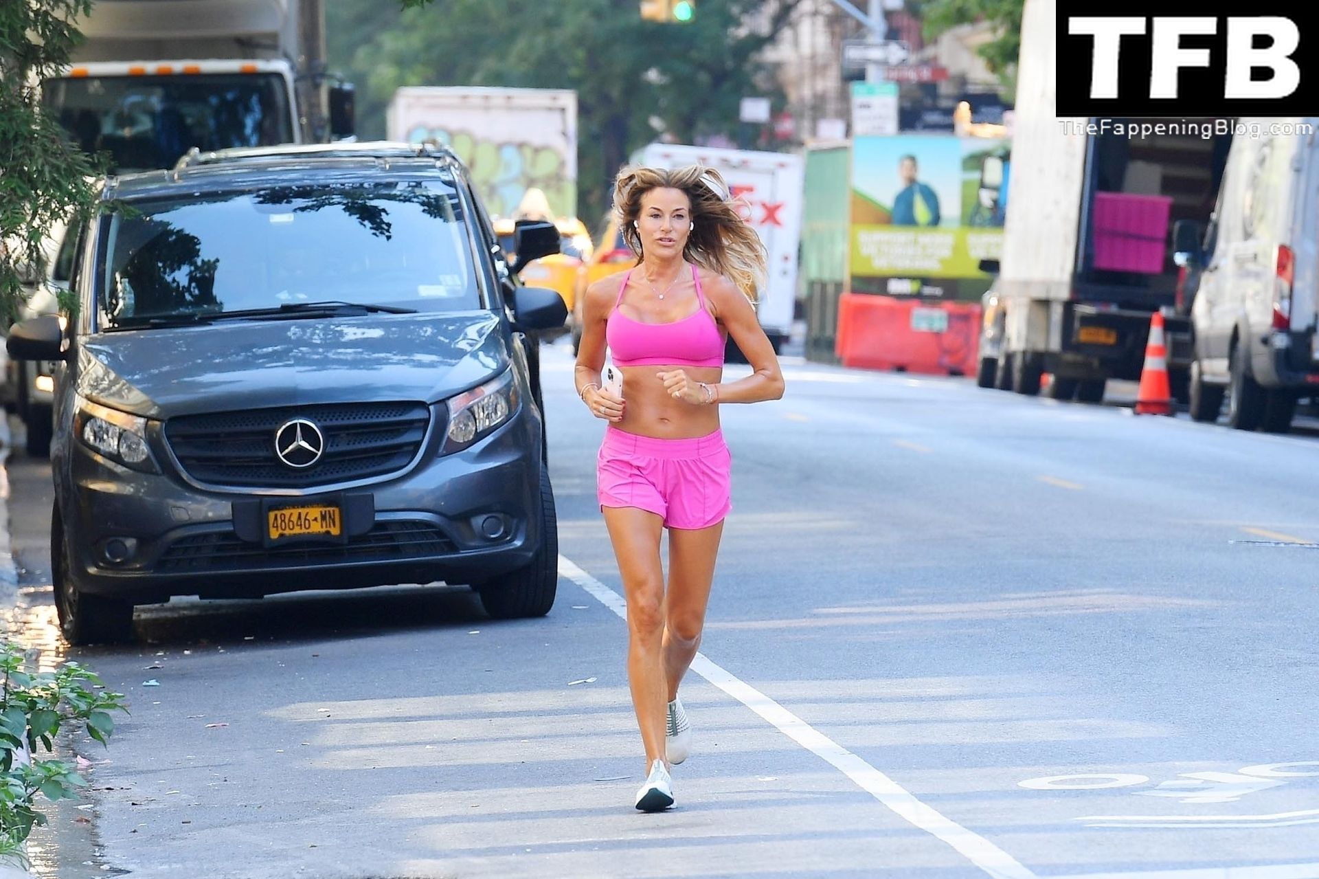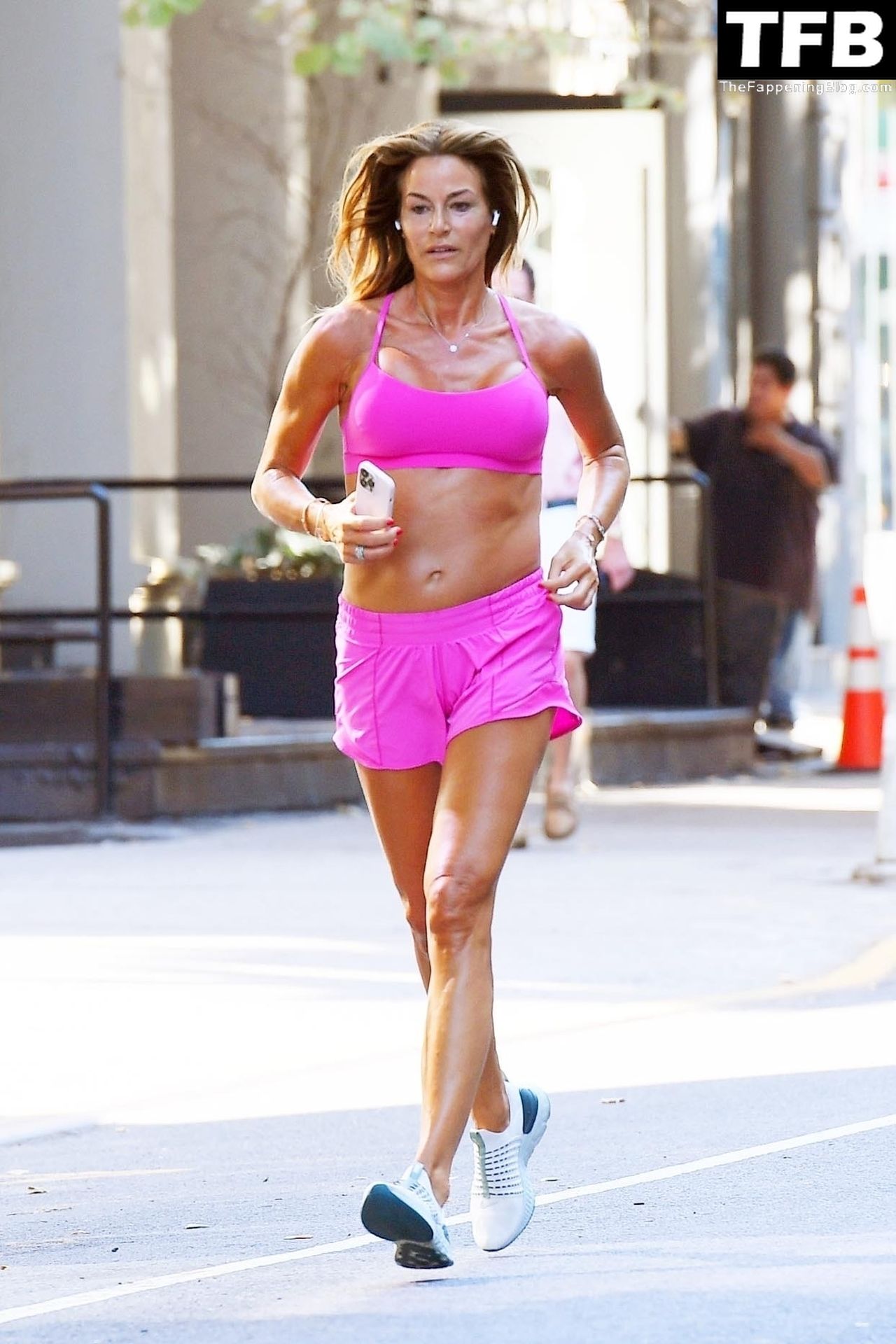 Kelly Bensimon está activa y en movimiento haciendo una carrera matutina por la ciudad de Nueva York con sus abdominales a la vista, 20/07/2022.. Kelly no pudo evitar sonreír a nuestras cámaras mientras pintaba la ciudad de rosa con un conjunto deportivo rosa fuerte.