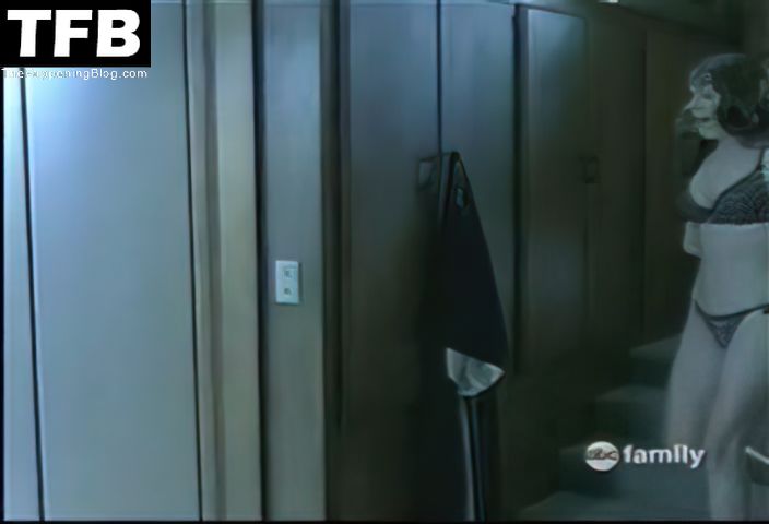 Kelly Brook entra en una habitación en cámara lenta vistiendo solo un sujetador y bragas y luego se pone una bata.