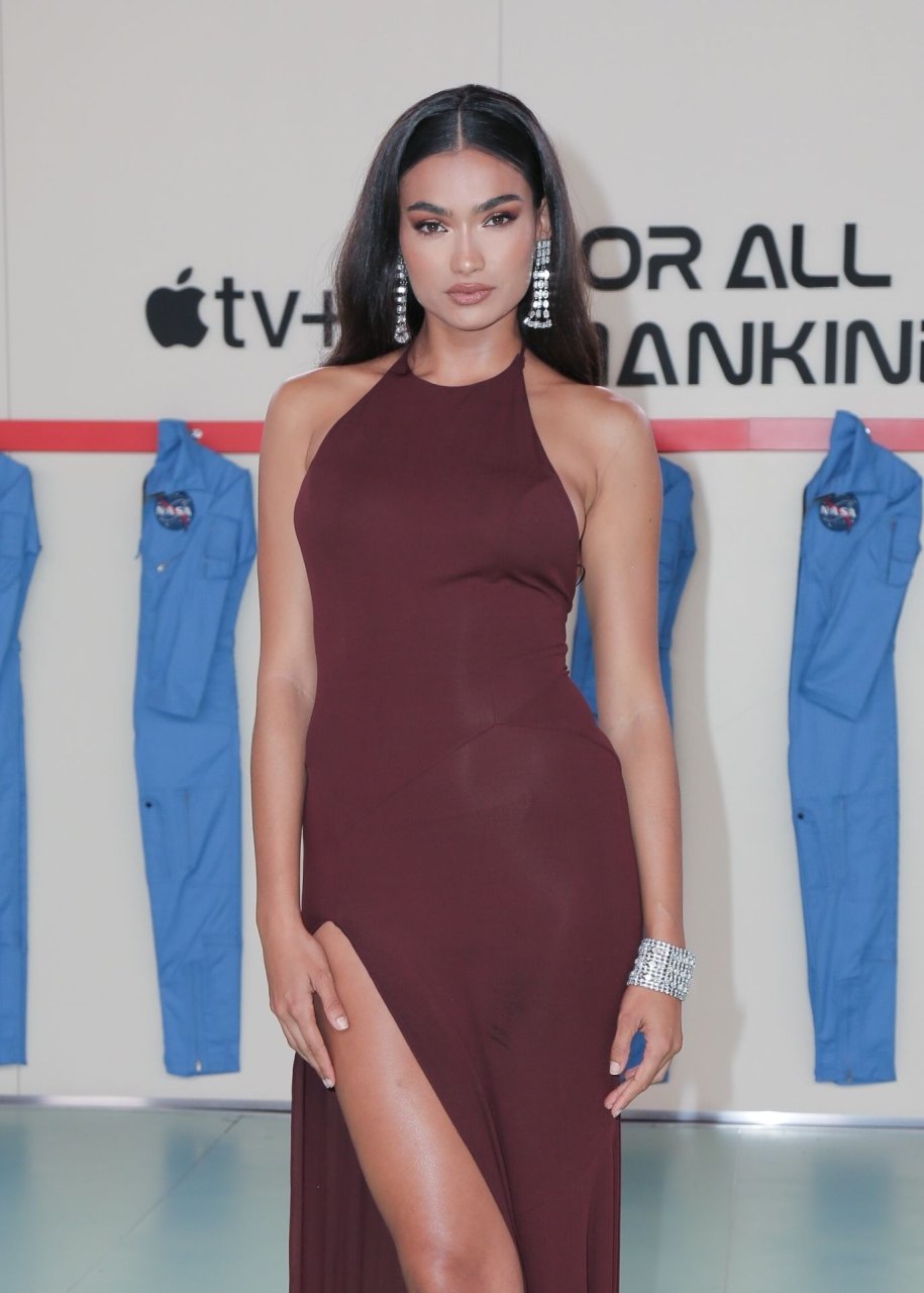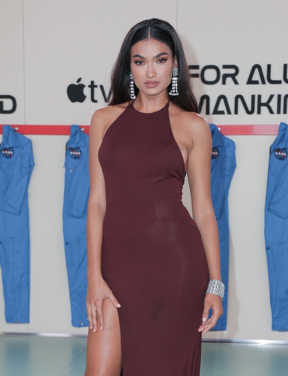 La modelo de piernas largas Kelly Gale fue vista con un vestido cherry junto a Joel Kinnaman en el estreno mundial de “For All Mankind” de Apple TV+ en el Regency Village Theatre en Westwood, 15/10/2019.