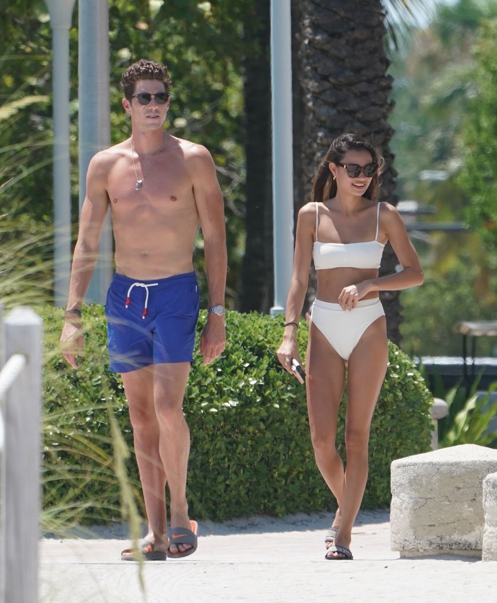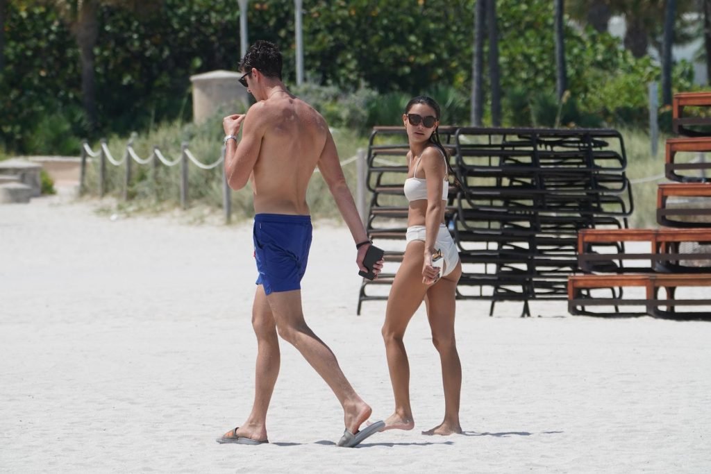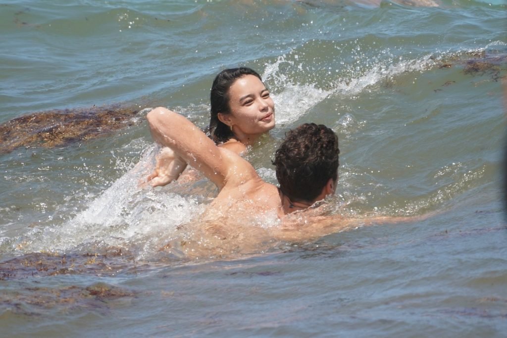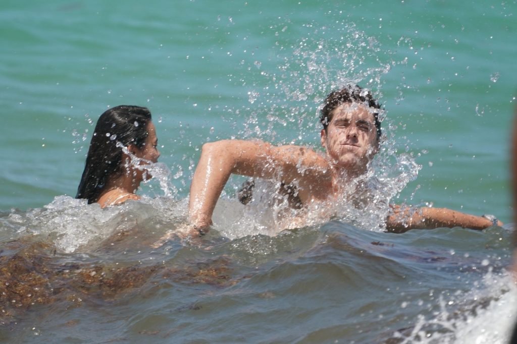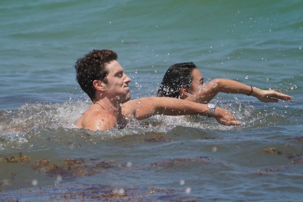El olímpico estadounidense Conor Dwyer nada con su novia y modelo de SI Swimsuit Kelsey Merritt en la playa de Miami Beach, 12/05/2019.