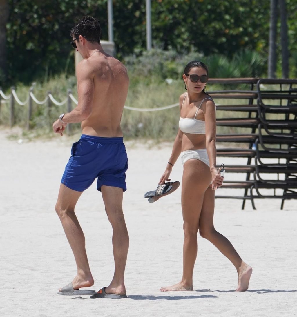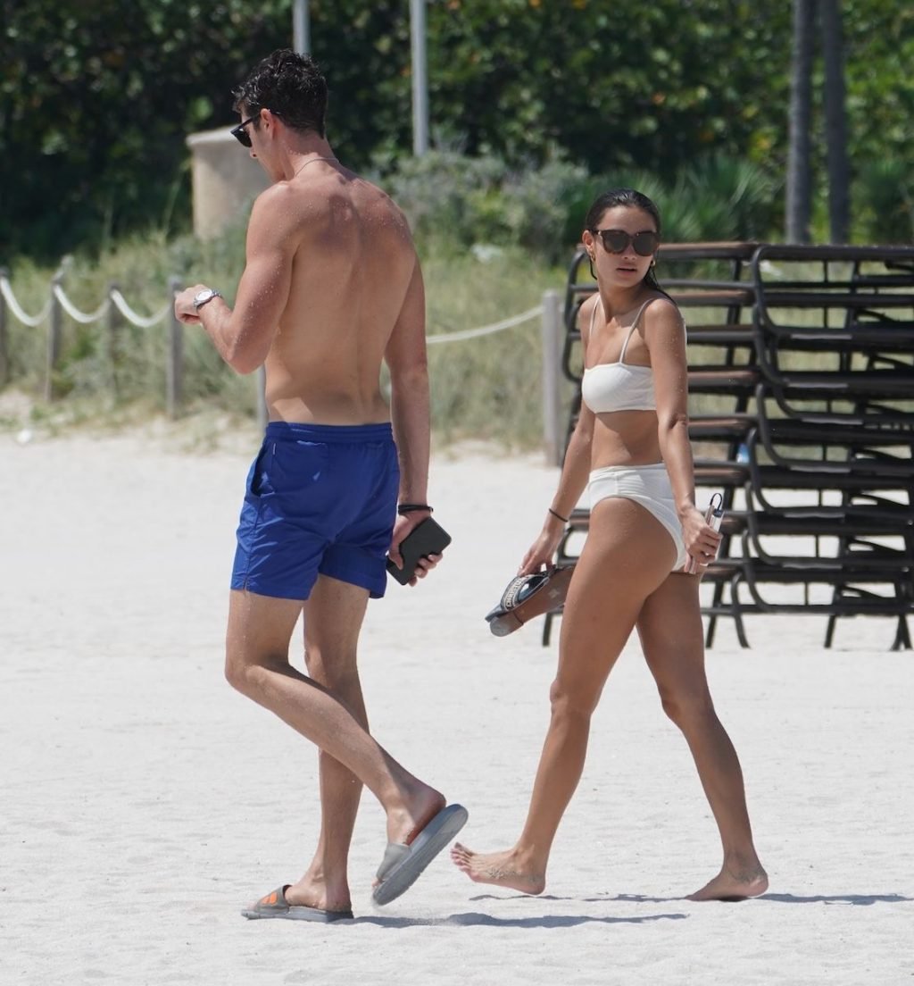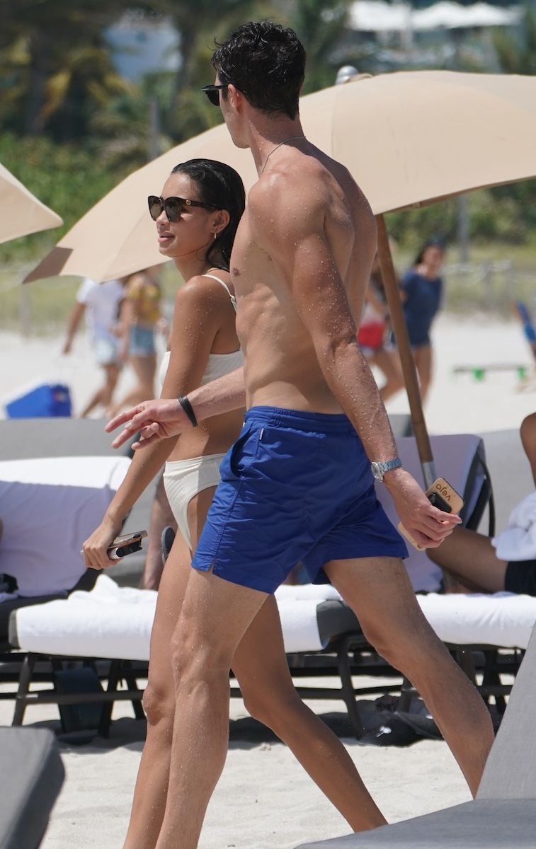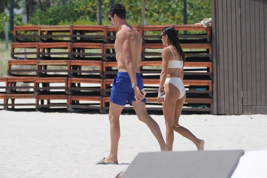 El olímpico estadounidense Conor Dwyer nada con su novia y modelo de SI Swimsuit Kelsey Merritt en la playa de Miami Beach, 12/05/2019.