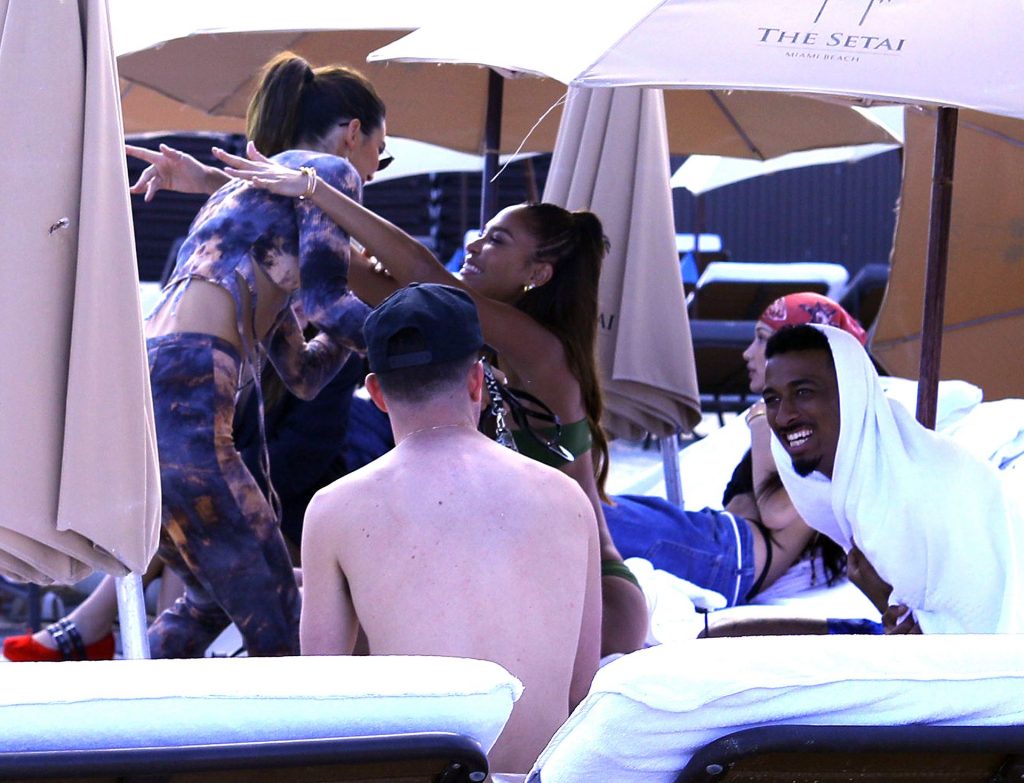 Kendall Jenner se sienta encima de Bella Hadid mientras disfrutan de un día en la playa juntas durante Art Basel en Miami, mostrando sus tonificados cuerpos en bikini, 12/04/2019.