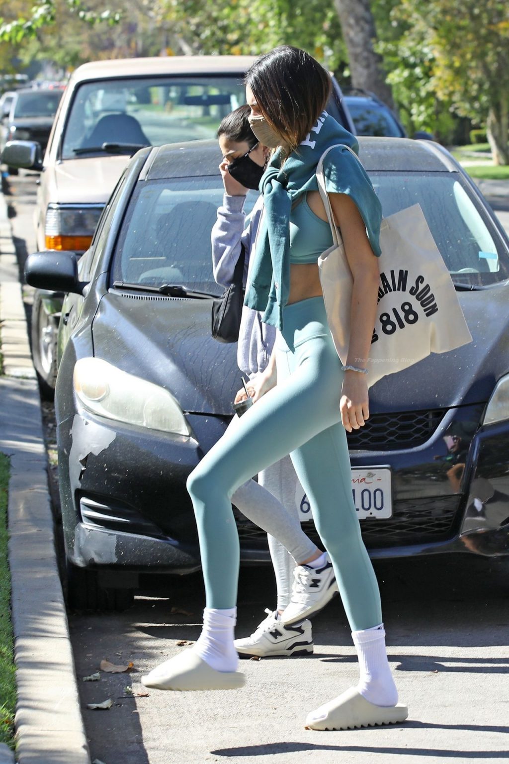 Modelo Kendall Jenner es vista usando Yeezy Slides ‘Bone’ y un conjunto de entrenamiento colorido, saliendo de su clase matutina de Pilates en West Hollywood, 27/03/2021.