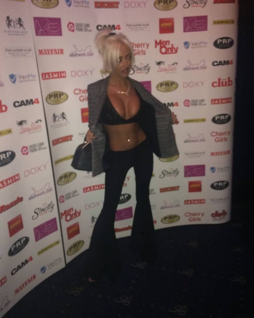 Kerrie-Lee Cowan muestra sus grandes pechos falsos en los Paul Raymond Awards 2017 en Londres, 11/09/2017. Kerrie-Lee Cowan es una modelo adulta inglesa.