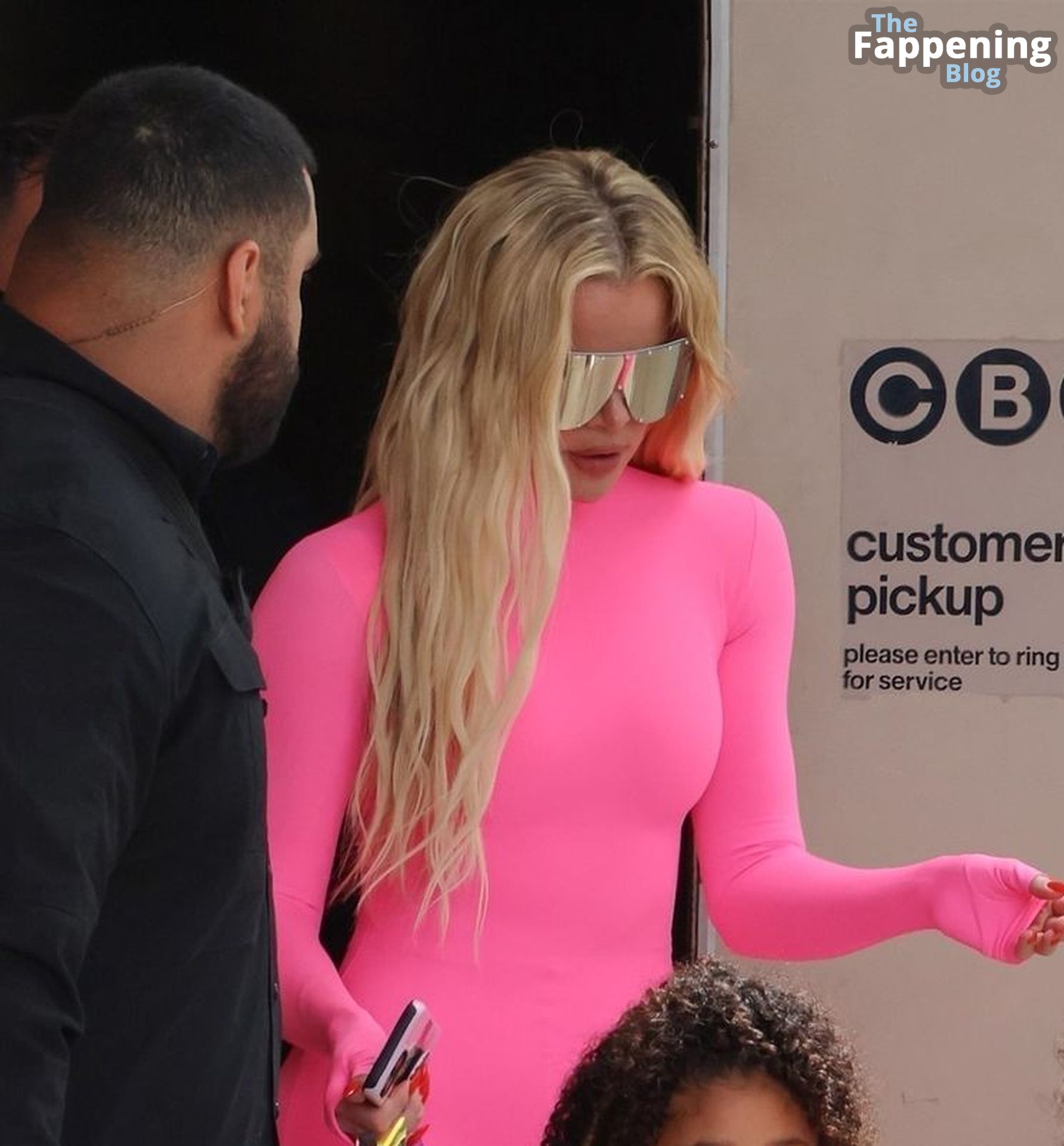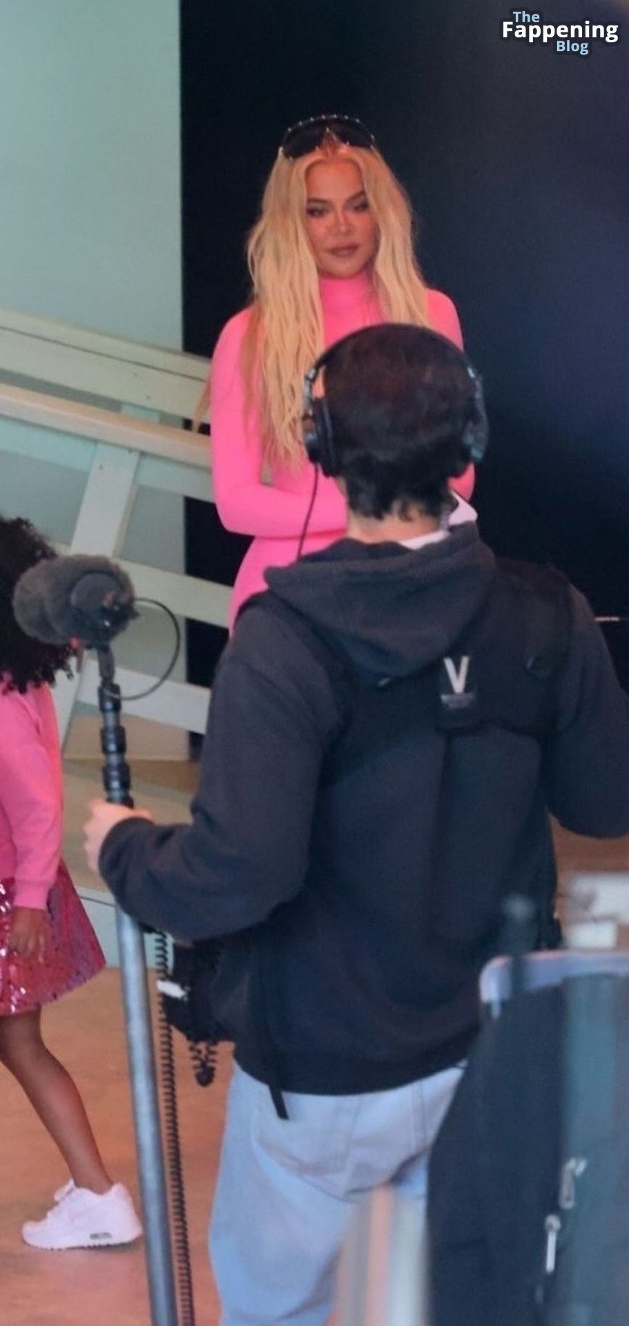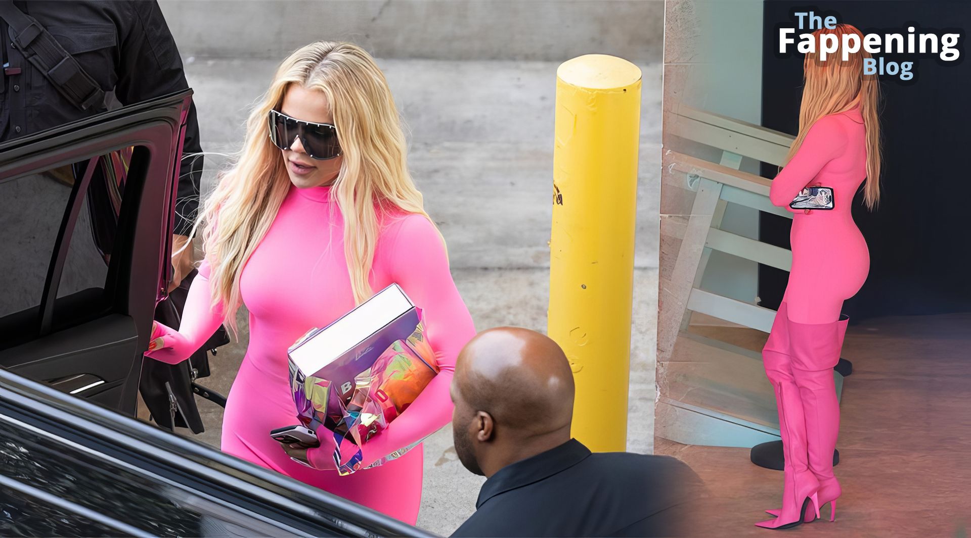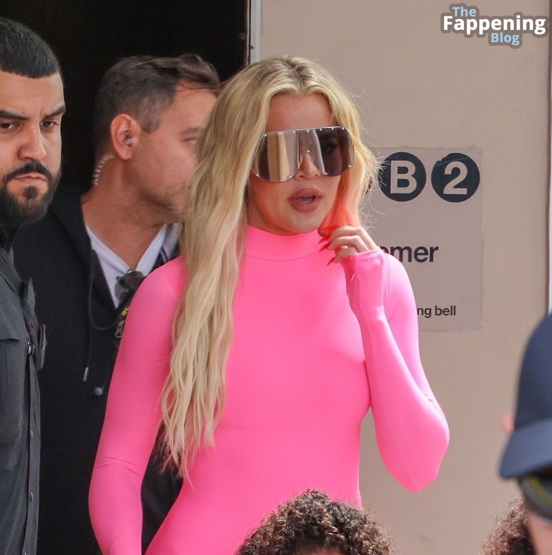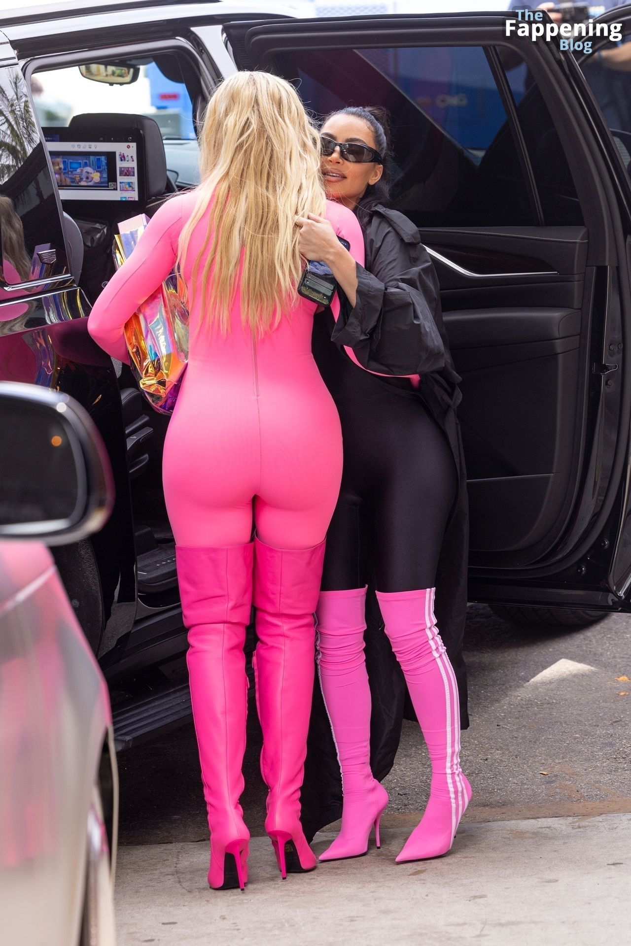 Khloe luce un conjunto rosa de pies a cabeza, y sus hijos están todos coordinados en el mismo color. Mientras tanto, Kim se estiliza con un elegante atuendo negro y muestra su apoyo a su hermana mientras se van del lugar.