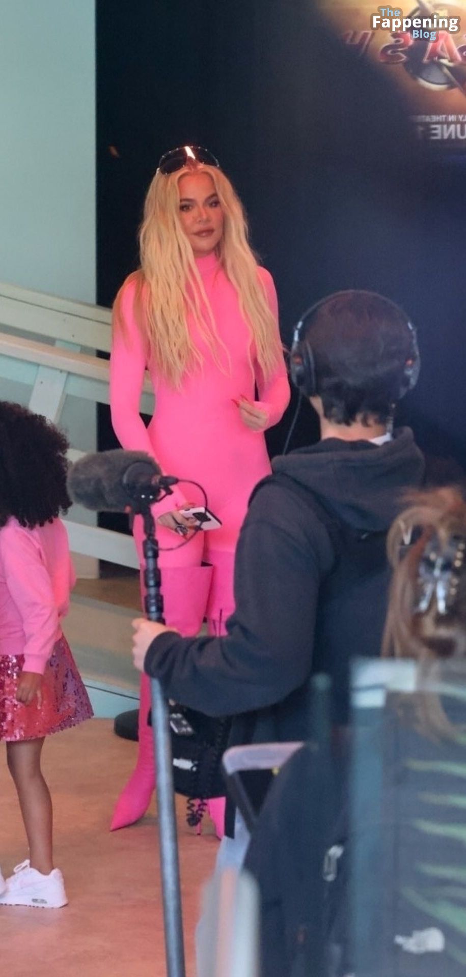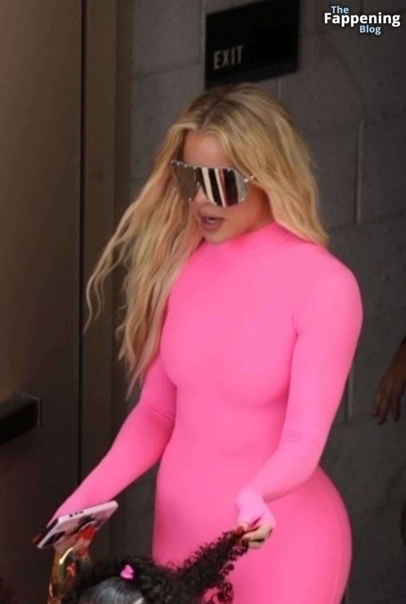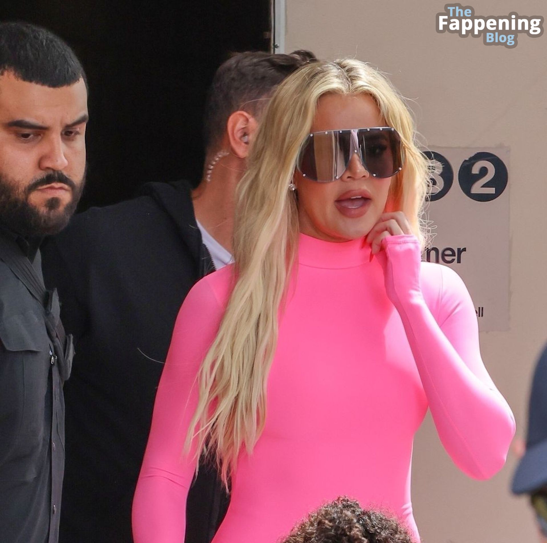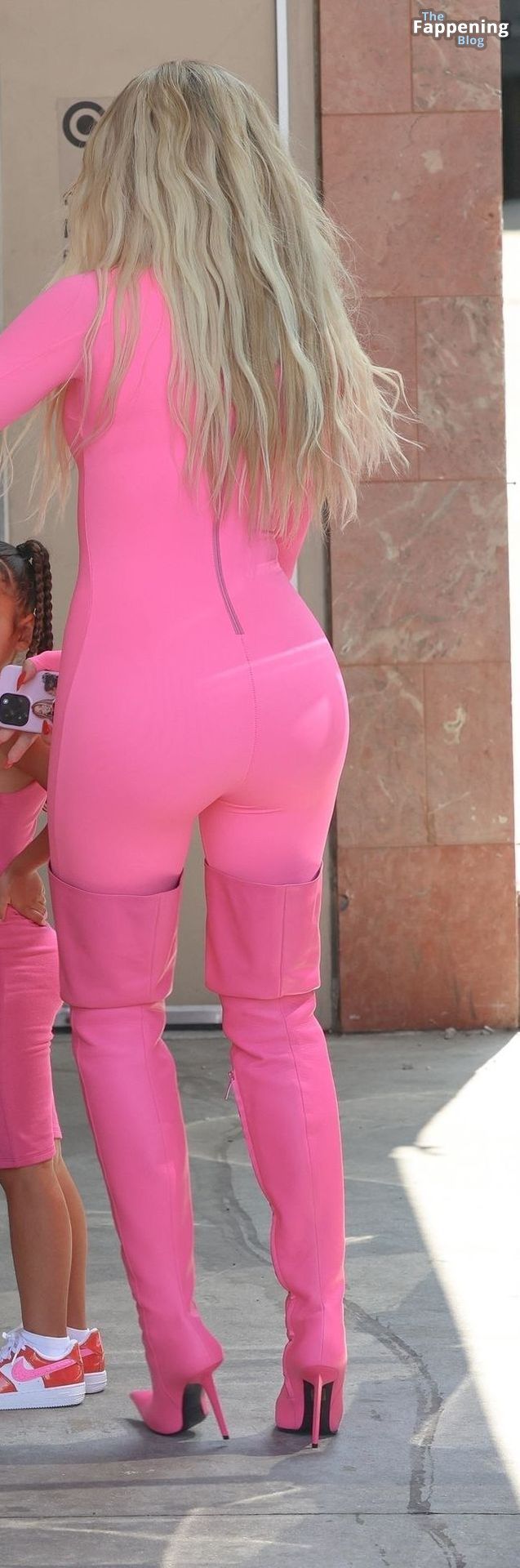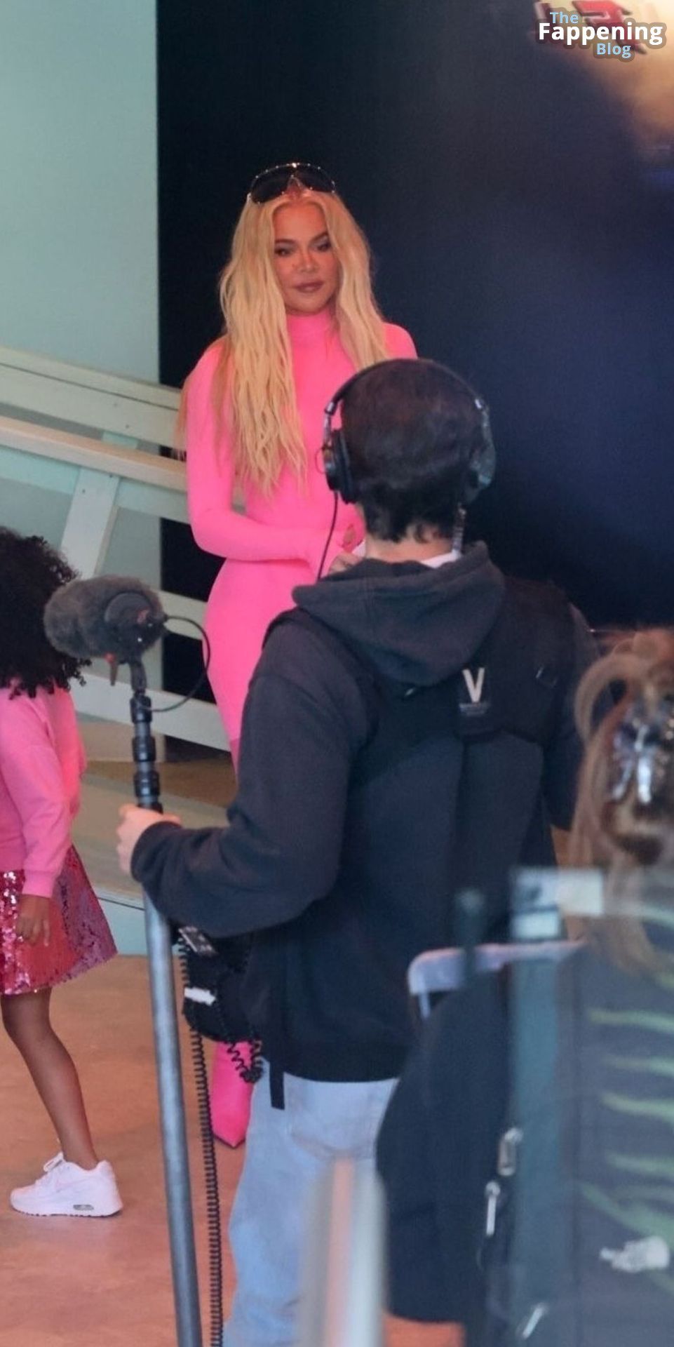 Khloe luce un conjunto rosa de pies a cabeza, y sus hijos están todos coordinados en el mismo color. Mientras tanto, Kim se estiliza con un elegante atuendo negro y muestra su apoyo a su hermana mientras se van del lugar.
