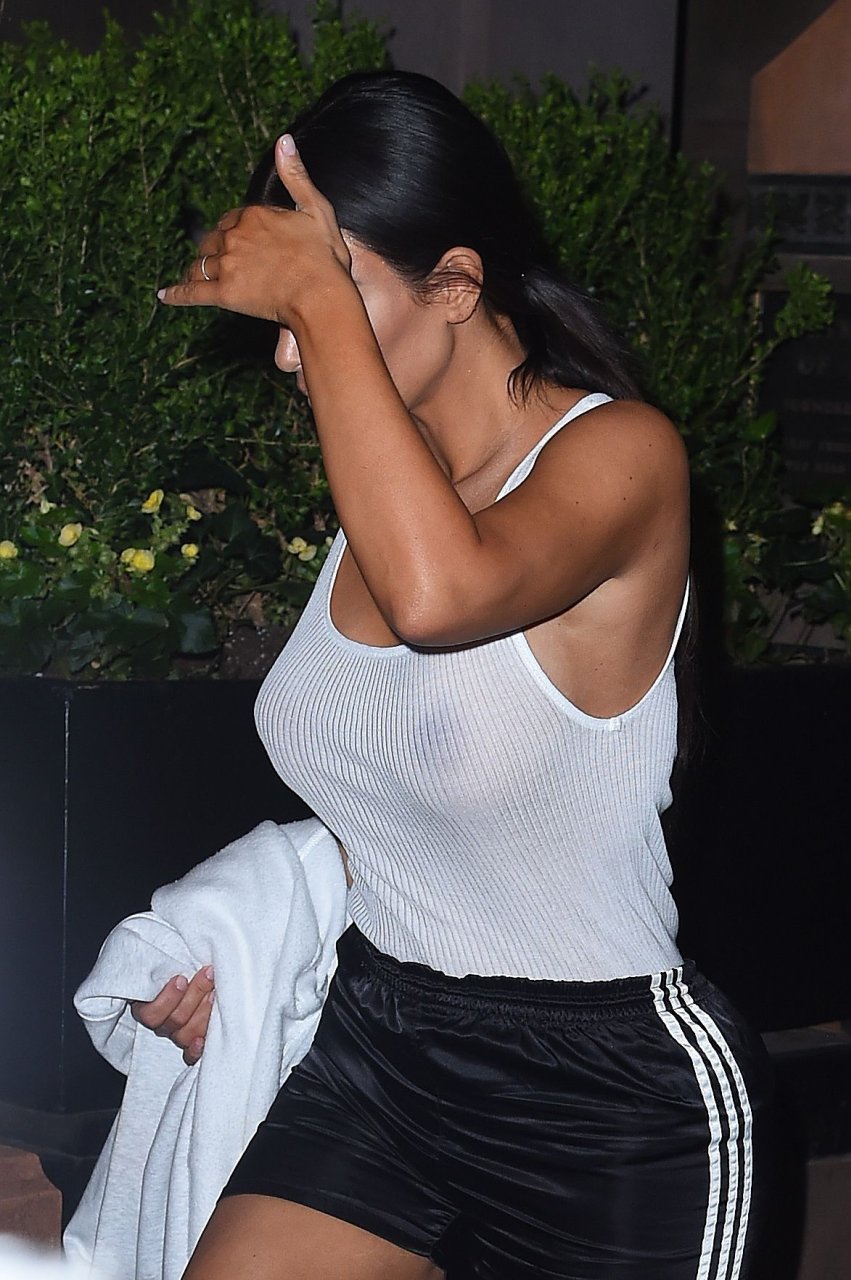 Kim Kardashian sin sostén sale de una sesión de fotos en NYC, 11/07/2017. La estrella de la televisión reality lleva shorts de Adidas y una camiseta blanca sin mangas combinada con tacones.