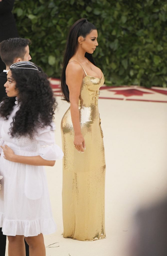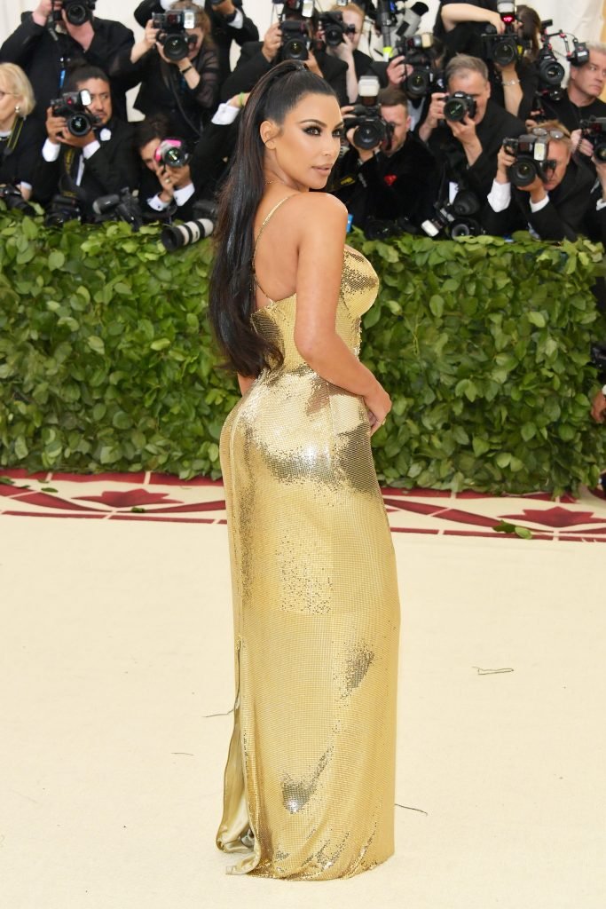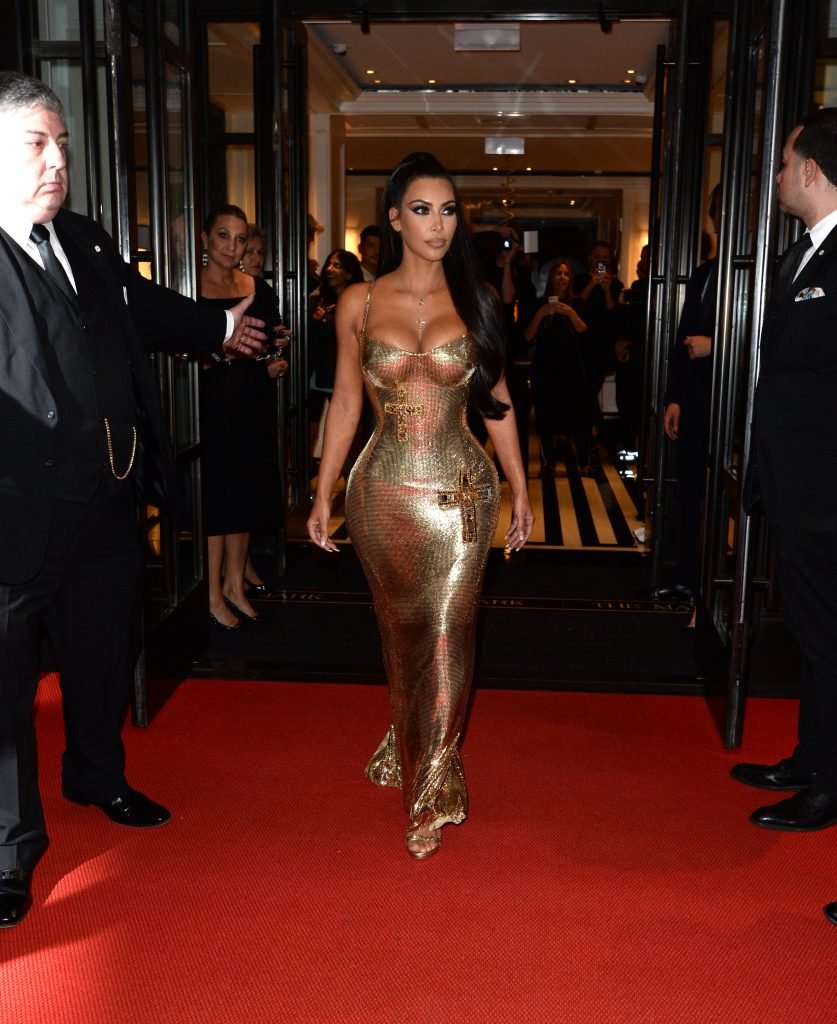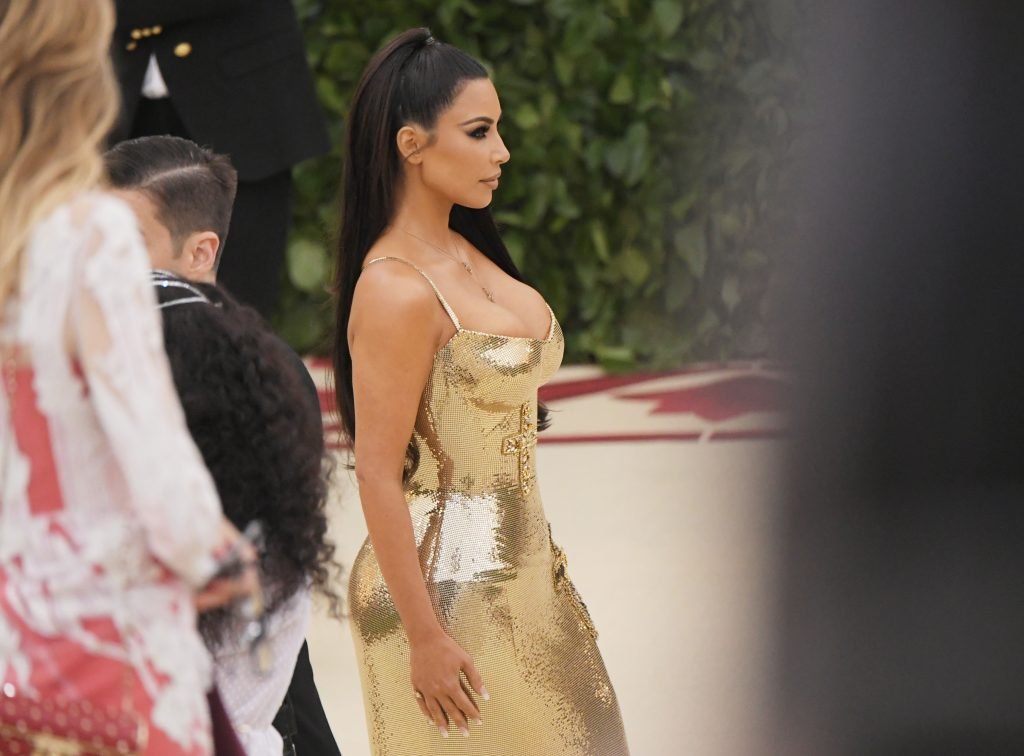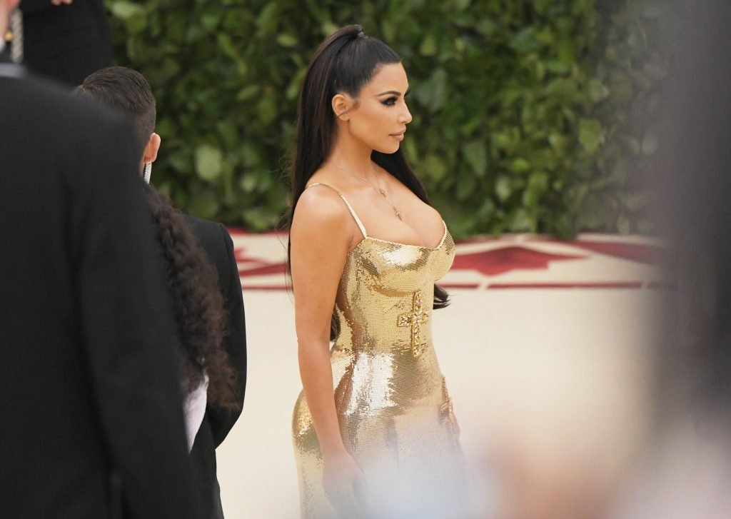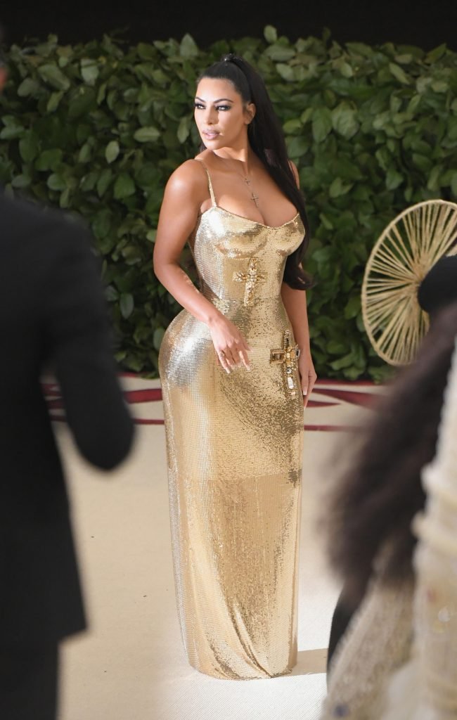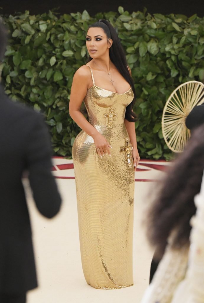Kim Kardashian sorprendió a todos cuando asistió a la Gala del Instituto de Vestuario MET en Nueva York, 07/05/2018. La estrella de reality TV de 37 años llevaba un vestido dorado con cruces, destacando sus pechos falsos.
