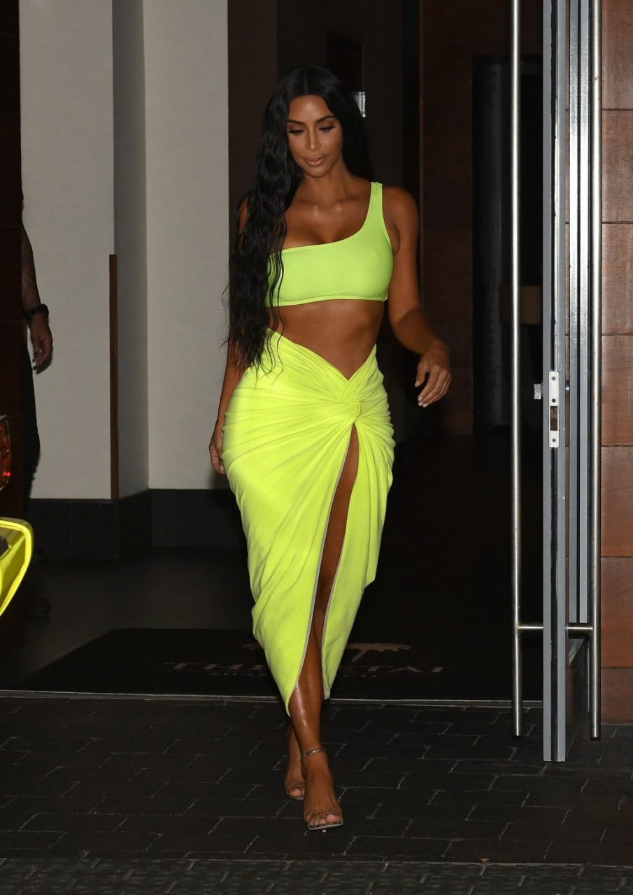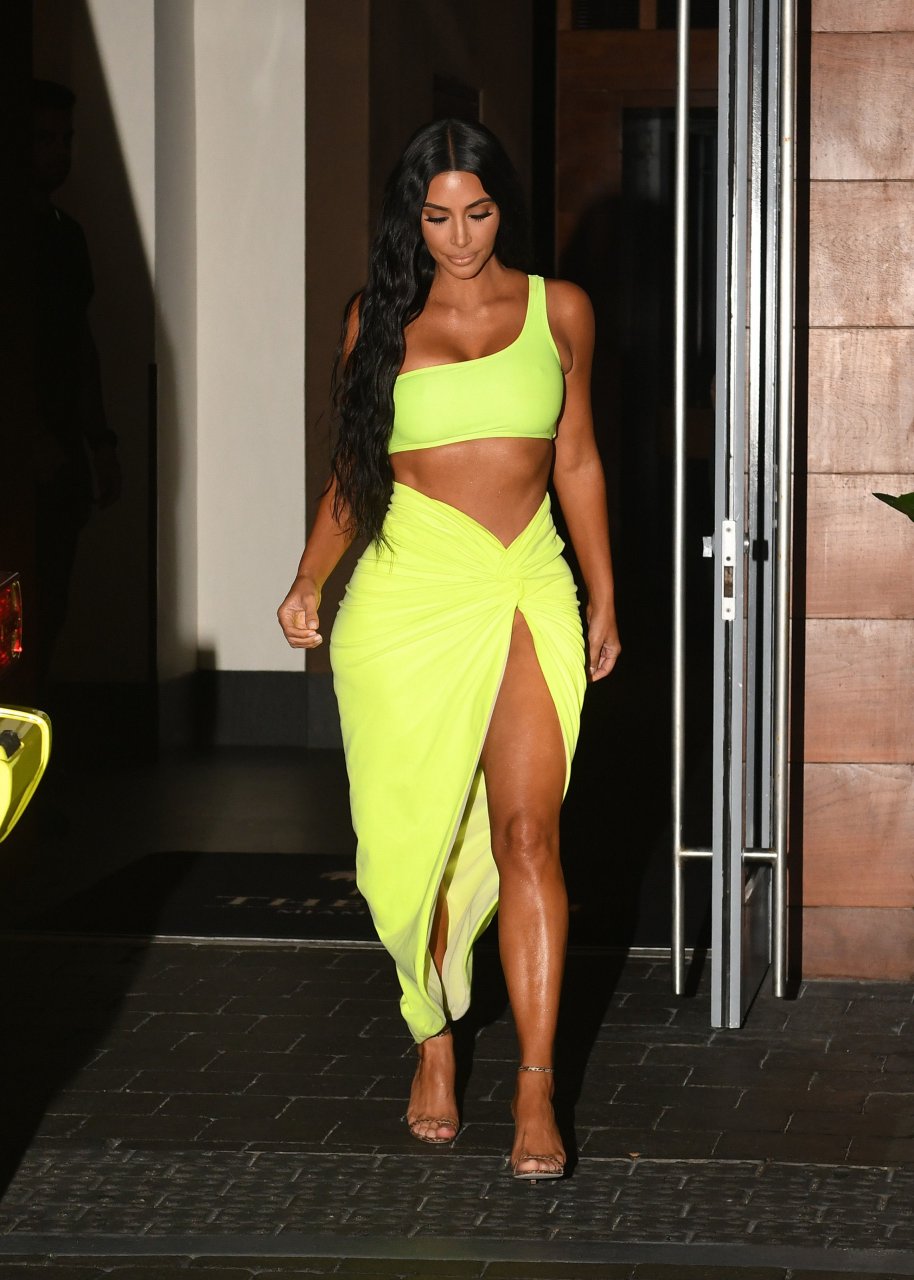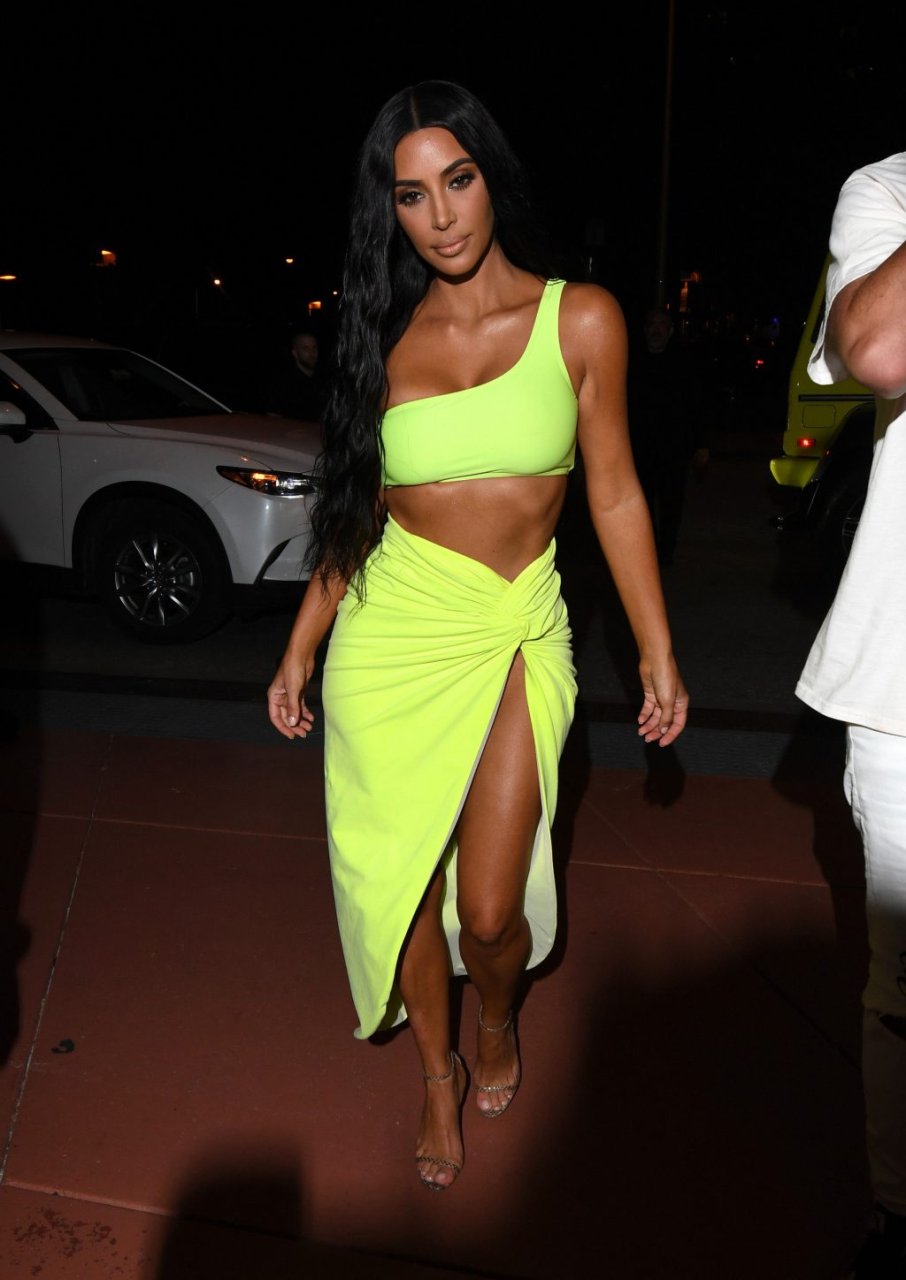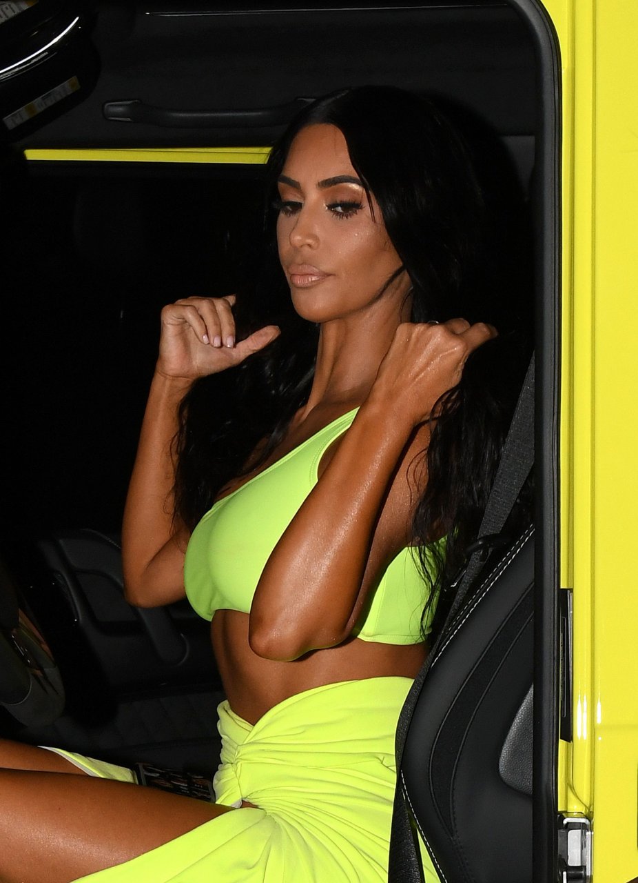 Kim Kardashian lleva una falda envolvente de neón amarillo reveladora con un top corto a juego con su Mercedes mientras sale de fiesta con sus amigos Larsa Pippen y Jonathan Cheban en Miami, 17/08/2018.
