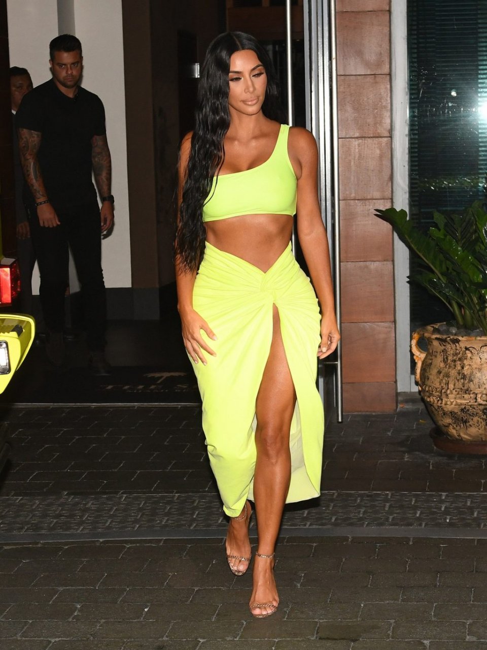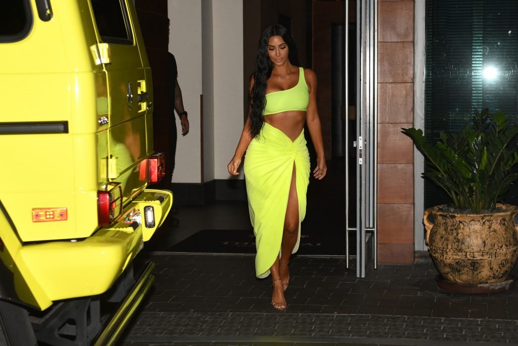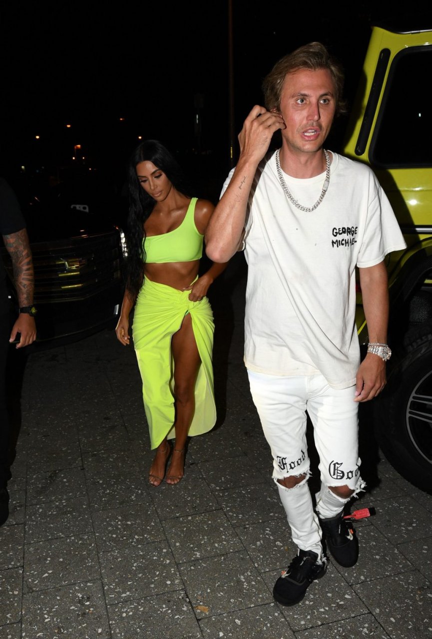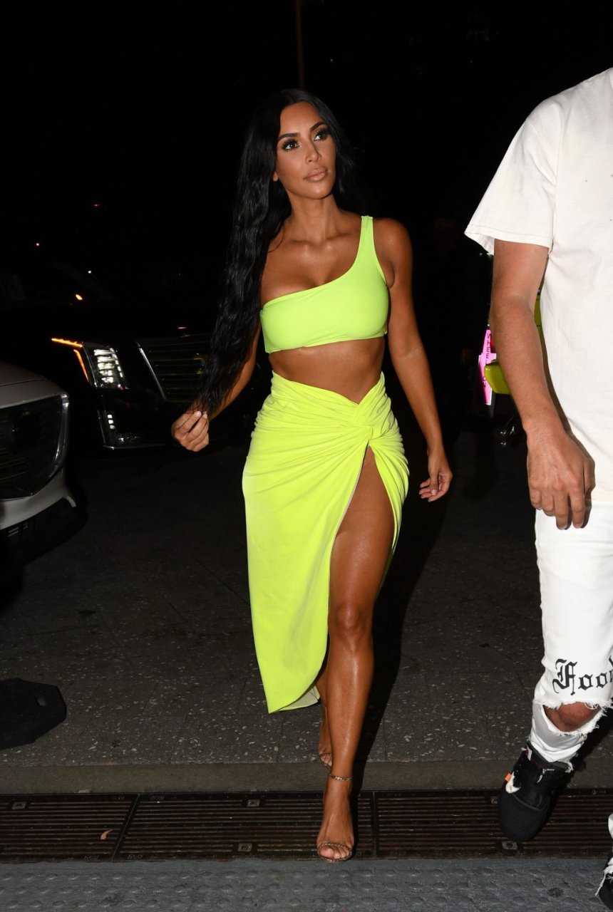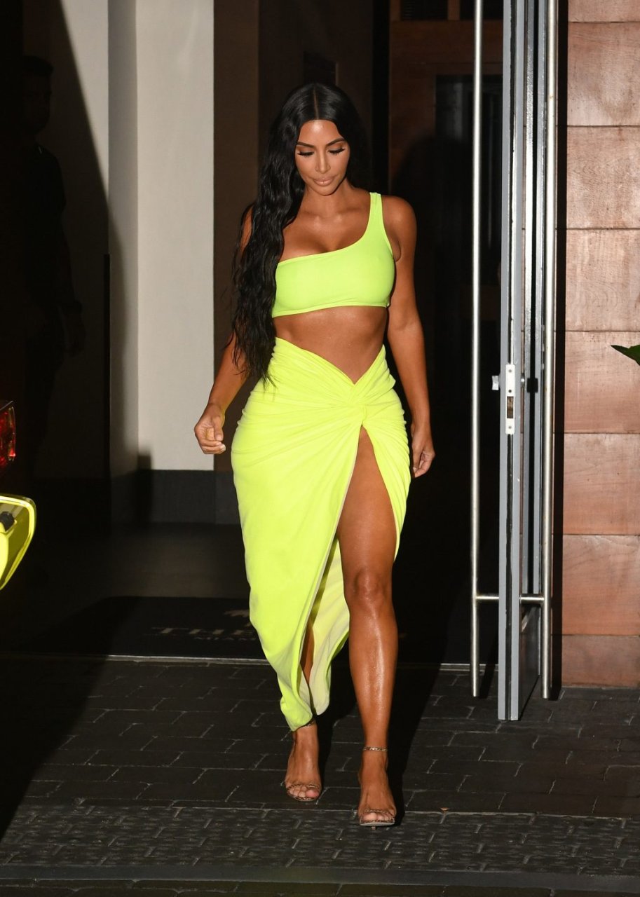Kim Kardashian lleva una falda envolvente de neón amarillo reveladora con un top corto a juego con su Mercedes mientras sale de fiesta con sus amigos Larsa Pippen y Jonathan Cheban en Miami, 17/08/2018.