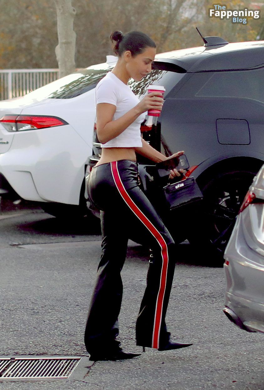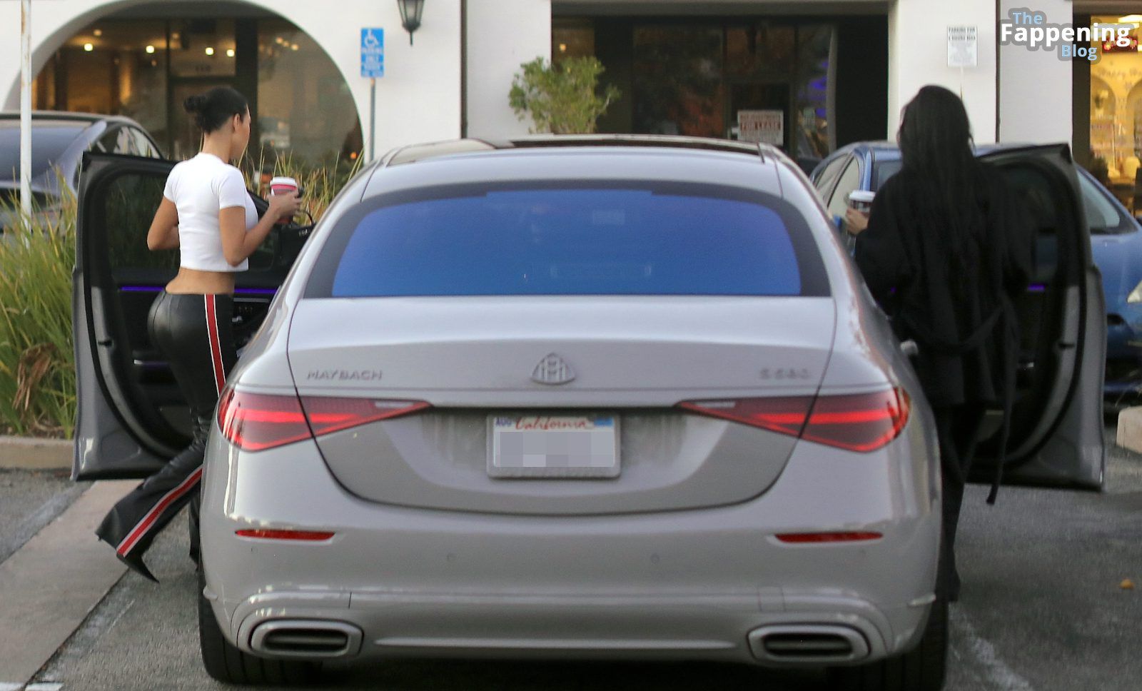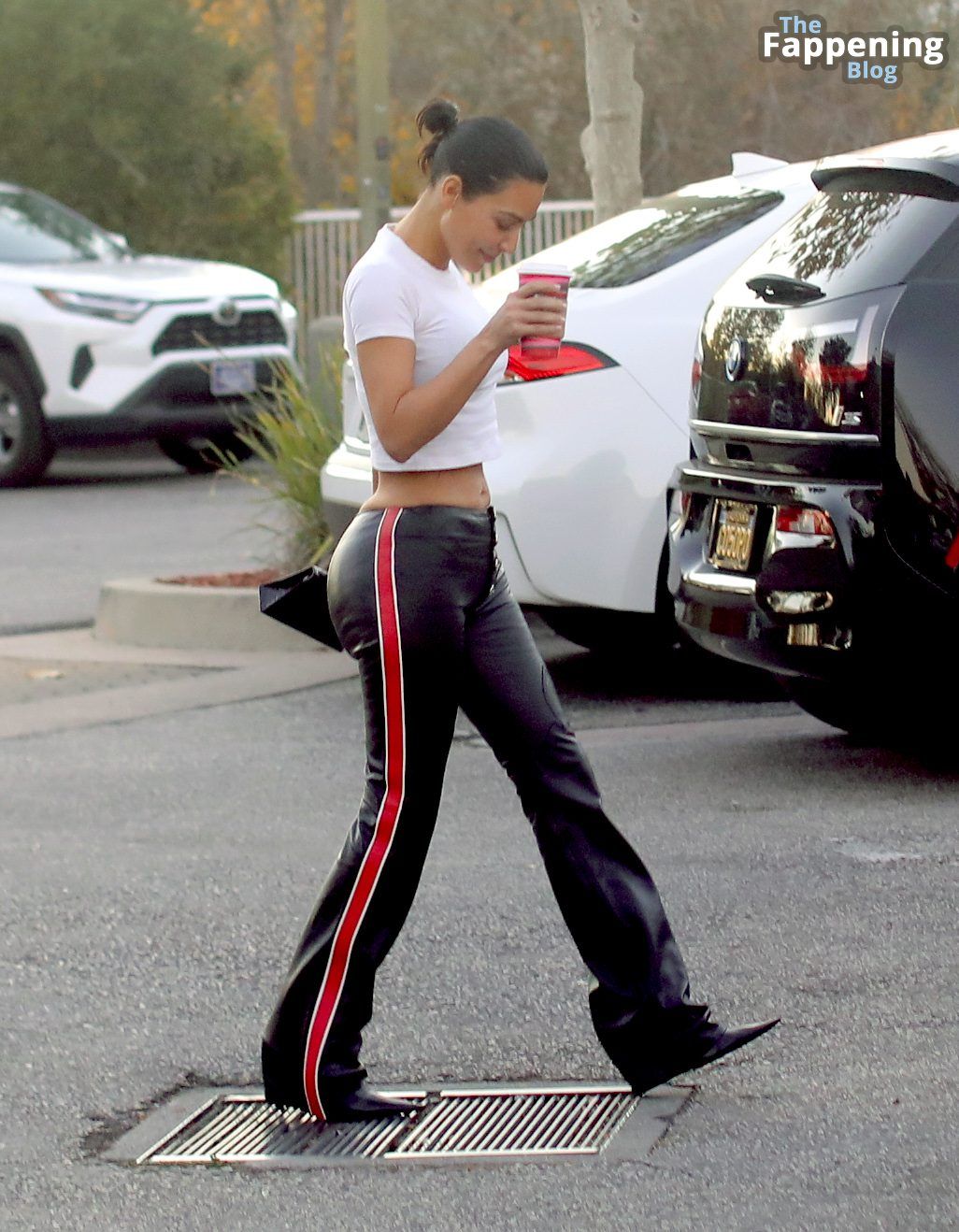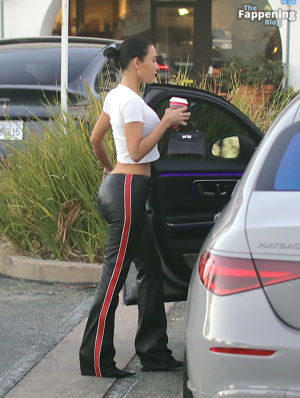 Kim Kardashian muestra sus atributos con una blusa blanca y pantalones de cuero mientras va a tomar café en Los Ángeles.