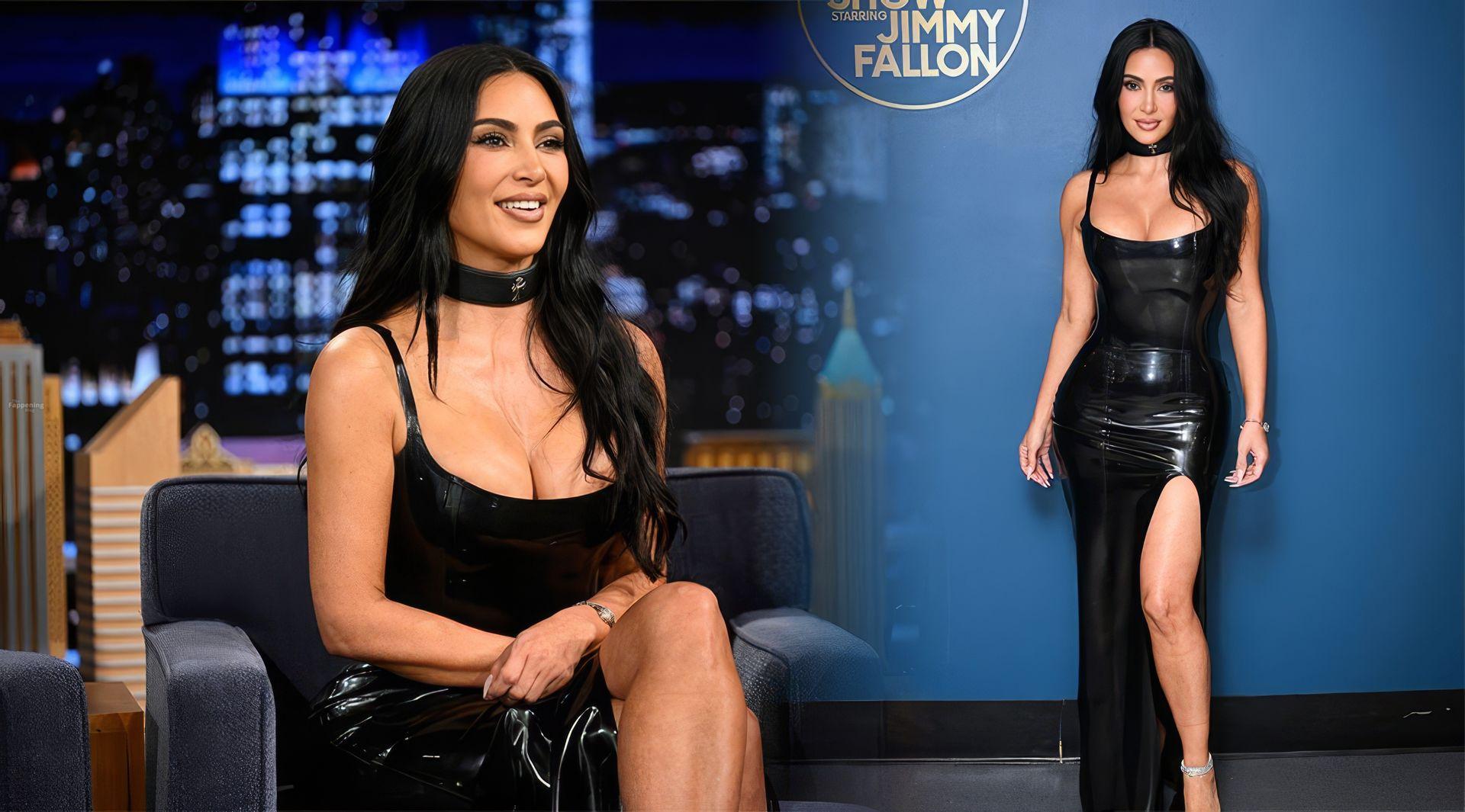 Kim Kardashian deslumbra en el Tonight Show, luciendo un ajustado vestido negro de látex que mostraba su escote y una abertura hasta el muslo.