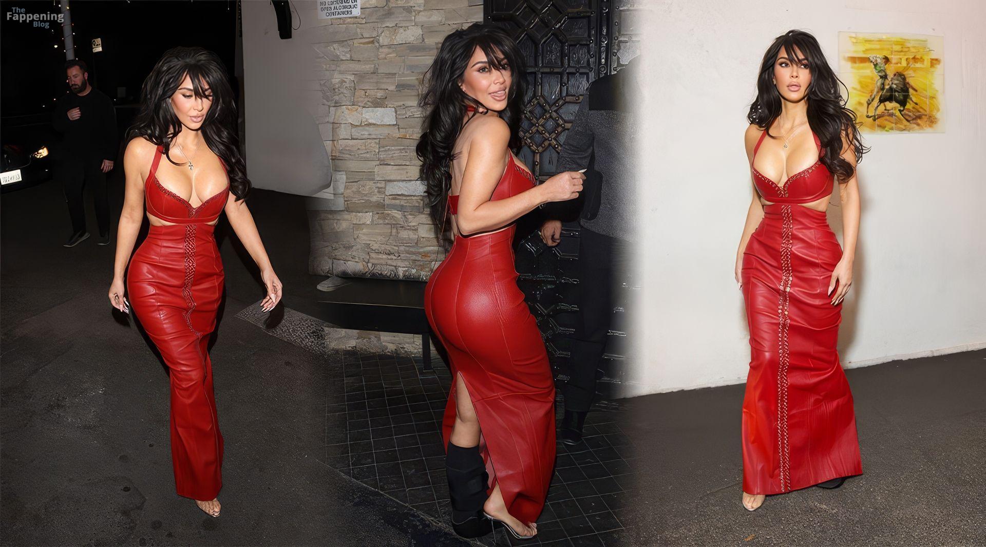 Kim Kardashian está arrasando totalmente con un vestido de cuero rojo fuego que resalta sus curvas a la perfección, combinado con una bota negra para apoyar su pie lesionado.