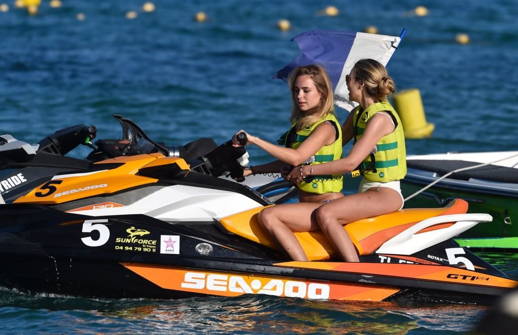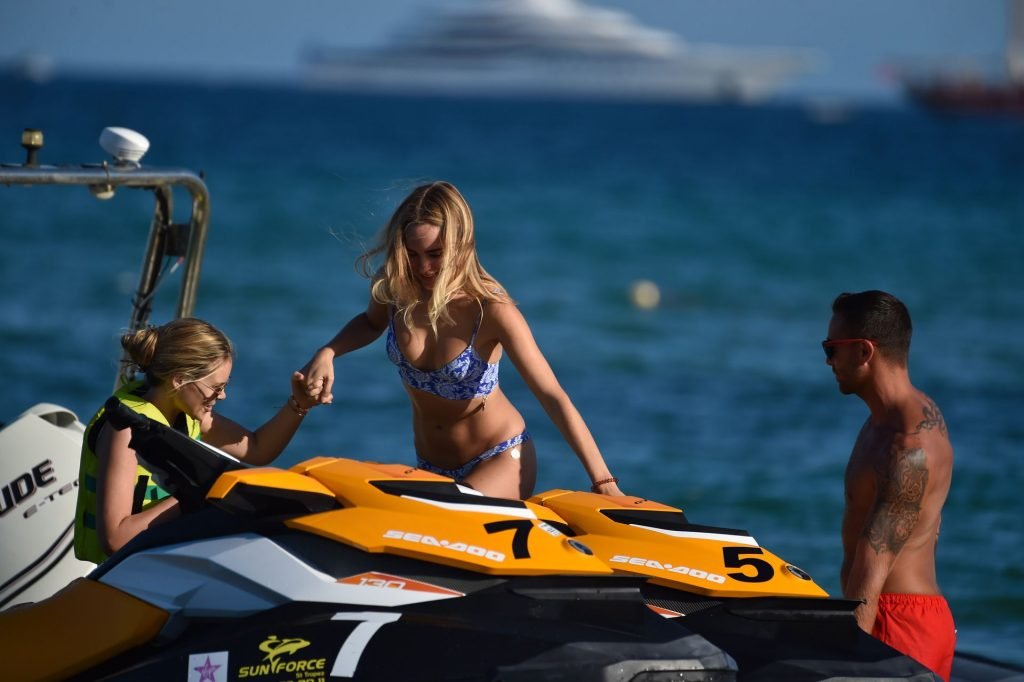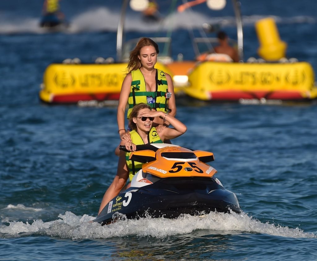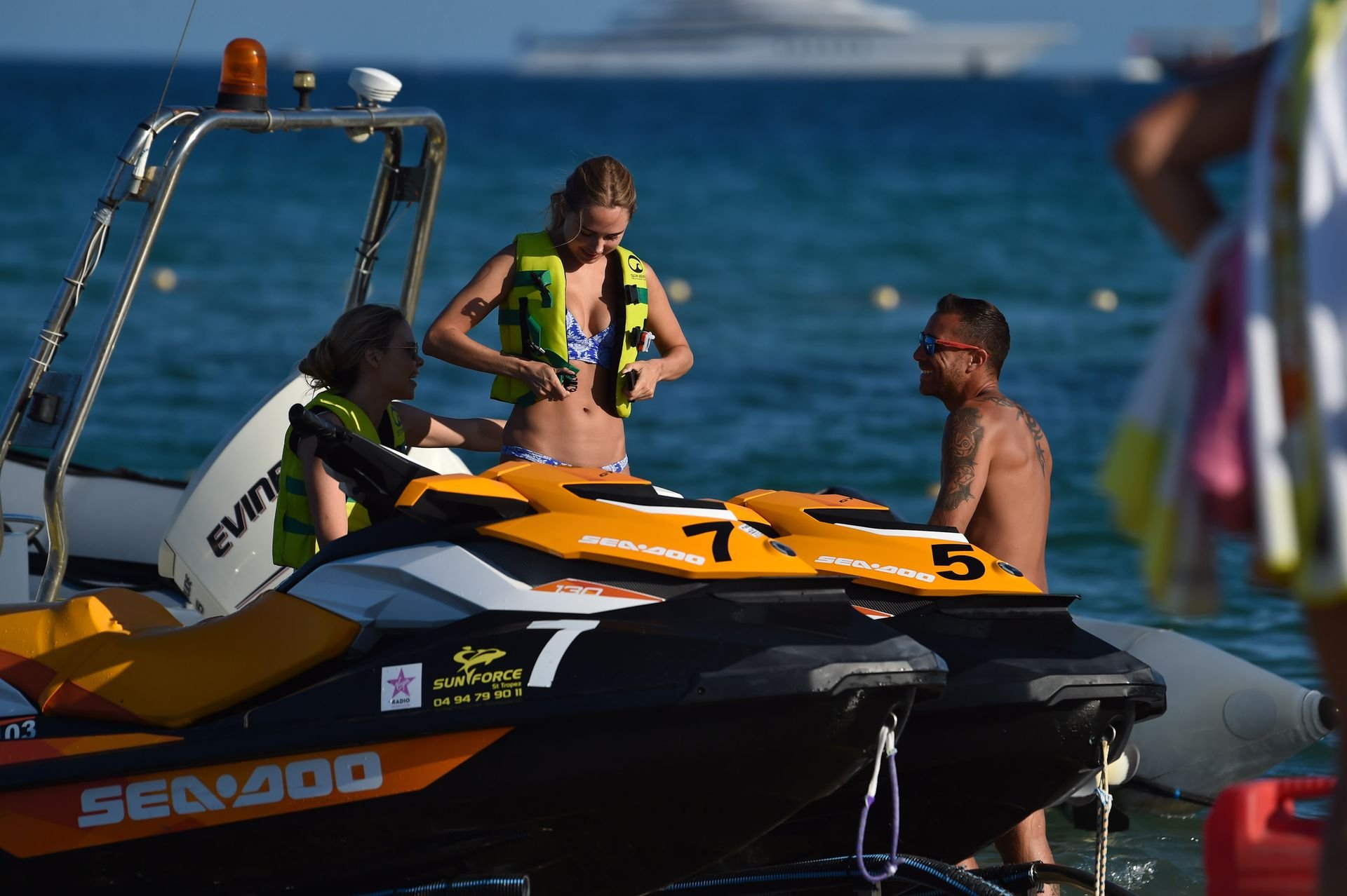 Kimberley Garner se ve practicando jet-ski con una amiga en St Tropez, 13/08/2019. Con un tono bronceado y moreno en sus vacaciones de verano, Kimberley lucía increíble con un pequeño bikini azul.