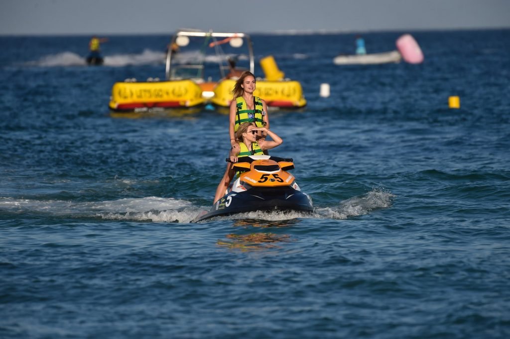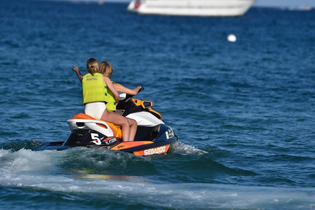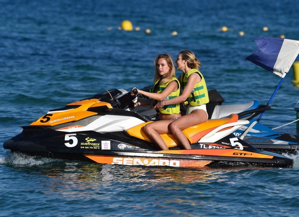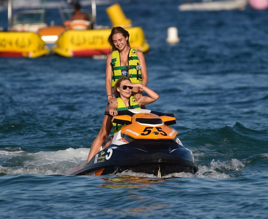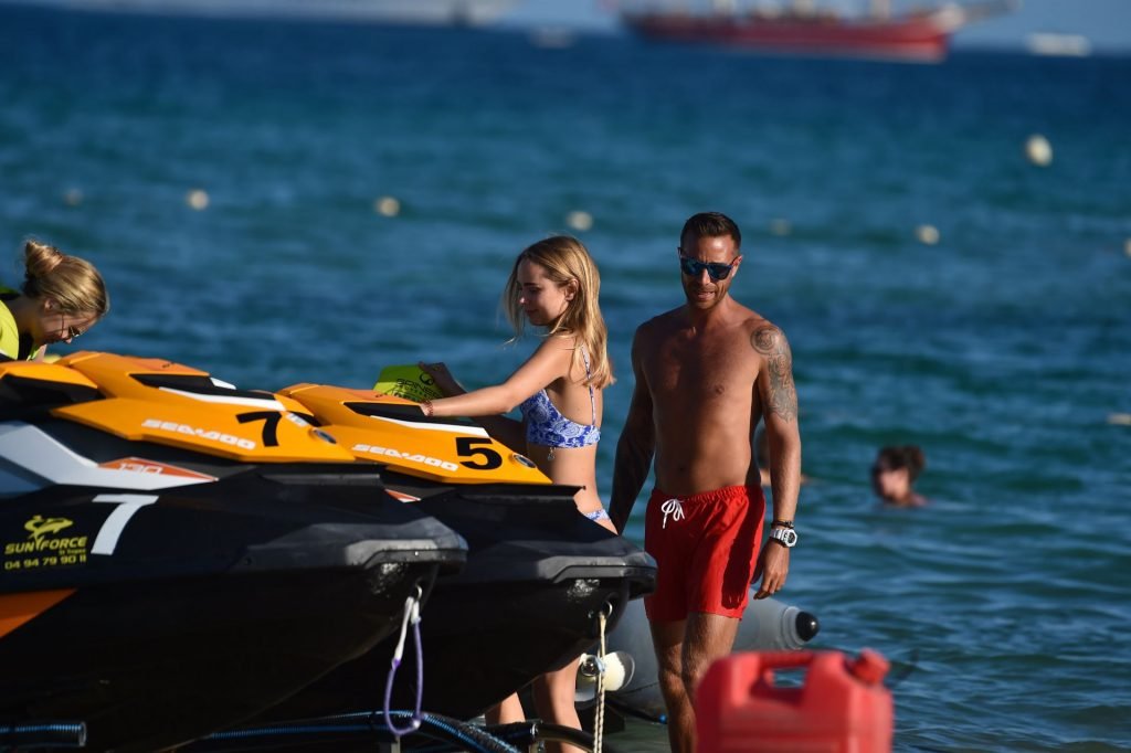 Kimberley Garner se ve practicando jet-ski con una amiga en St Tropez, 13/08/2019. Con un tono bronceado y moreno en sus vacaciones de verano, Kimberley lucía increíble con un pequeño bikini azul.
