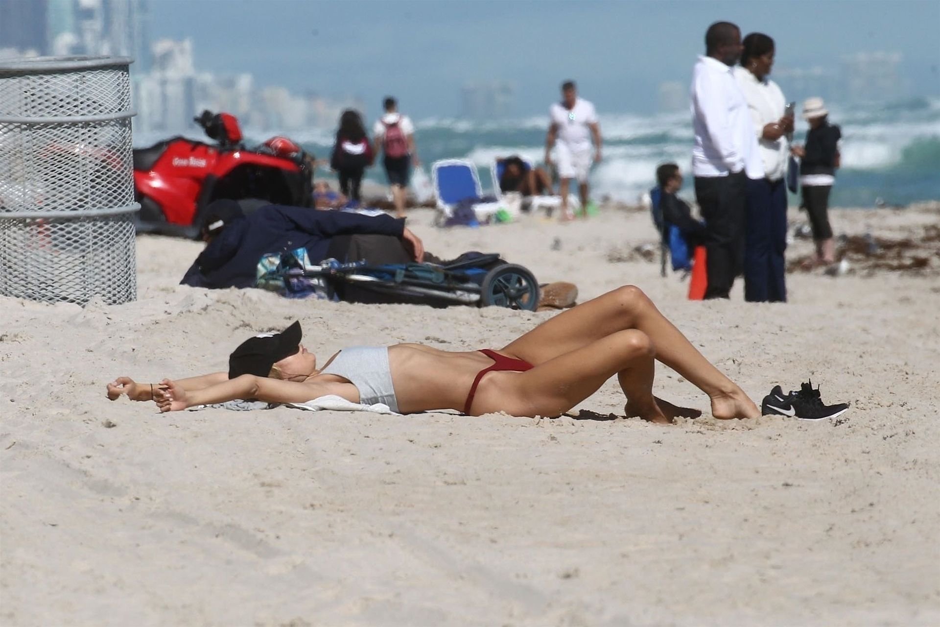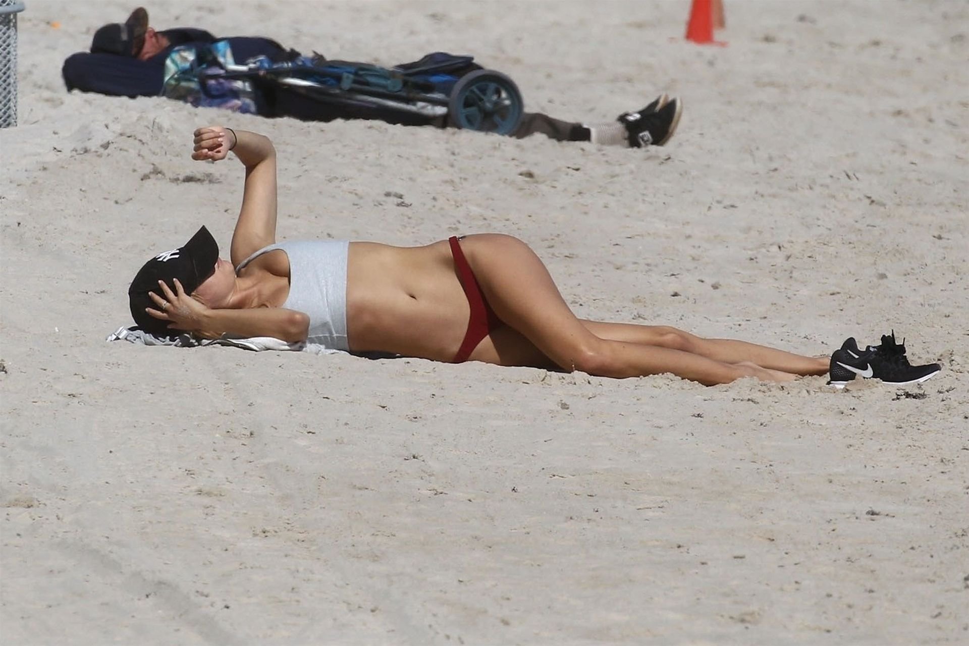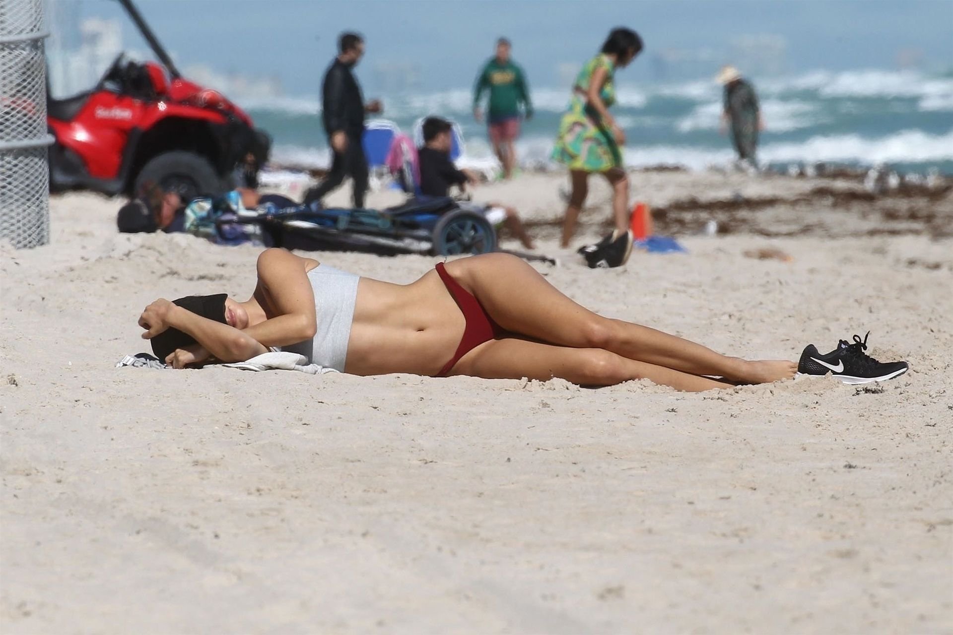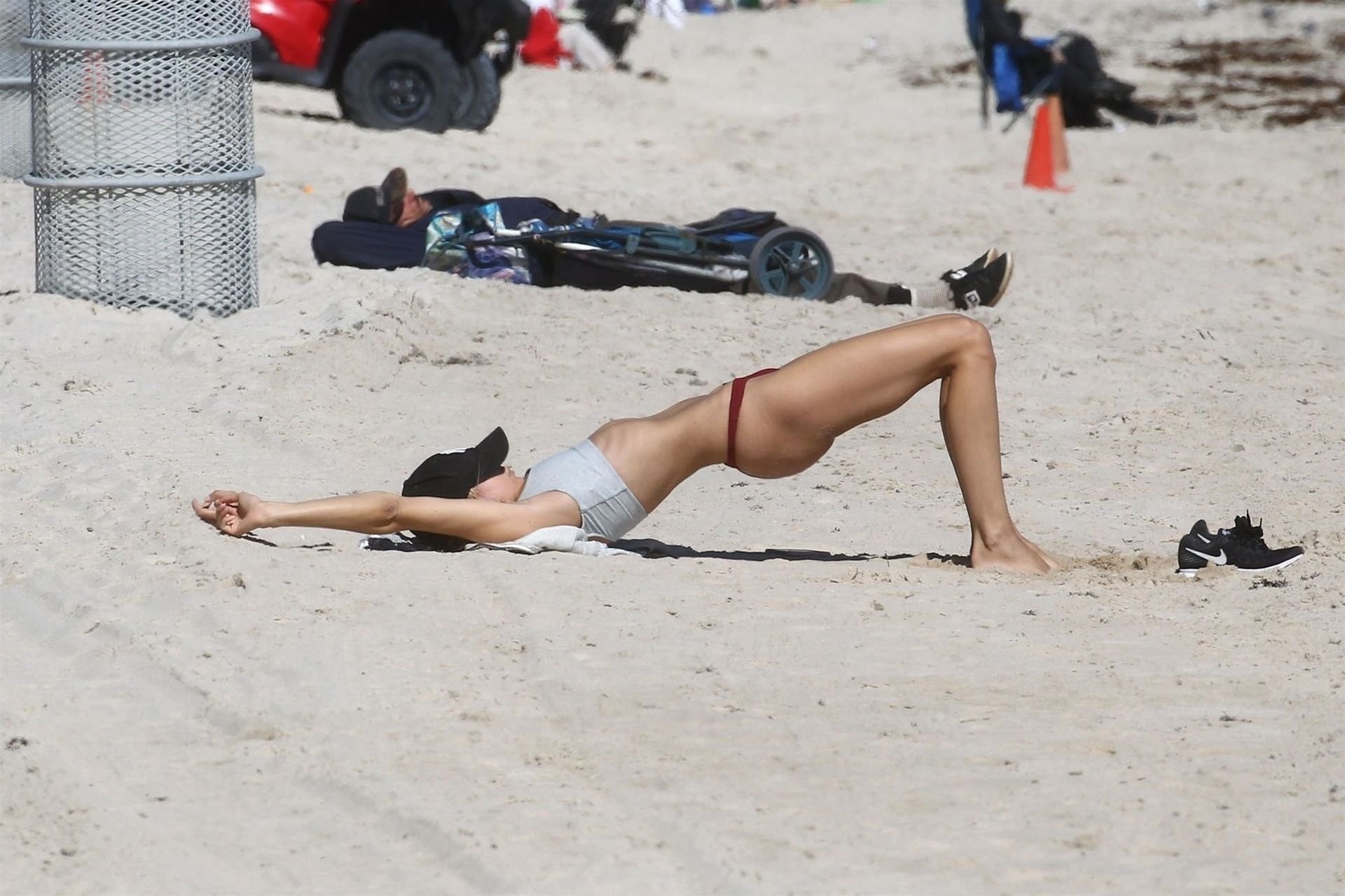 La diseñadora de trajes de baño Kimberley Garner va a la playa para un entrenamiento matutino en Miami, 27/01/2019. Kimberly mostró su cuerpo tonificado con un bikini tanga rojo y un sujetador deportivo gris para su entrenamiento.