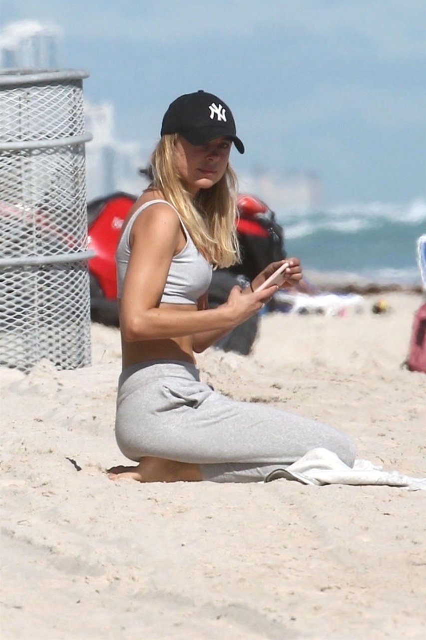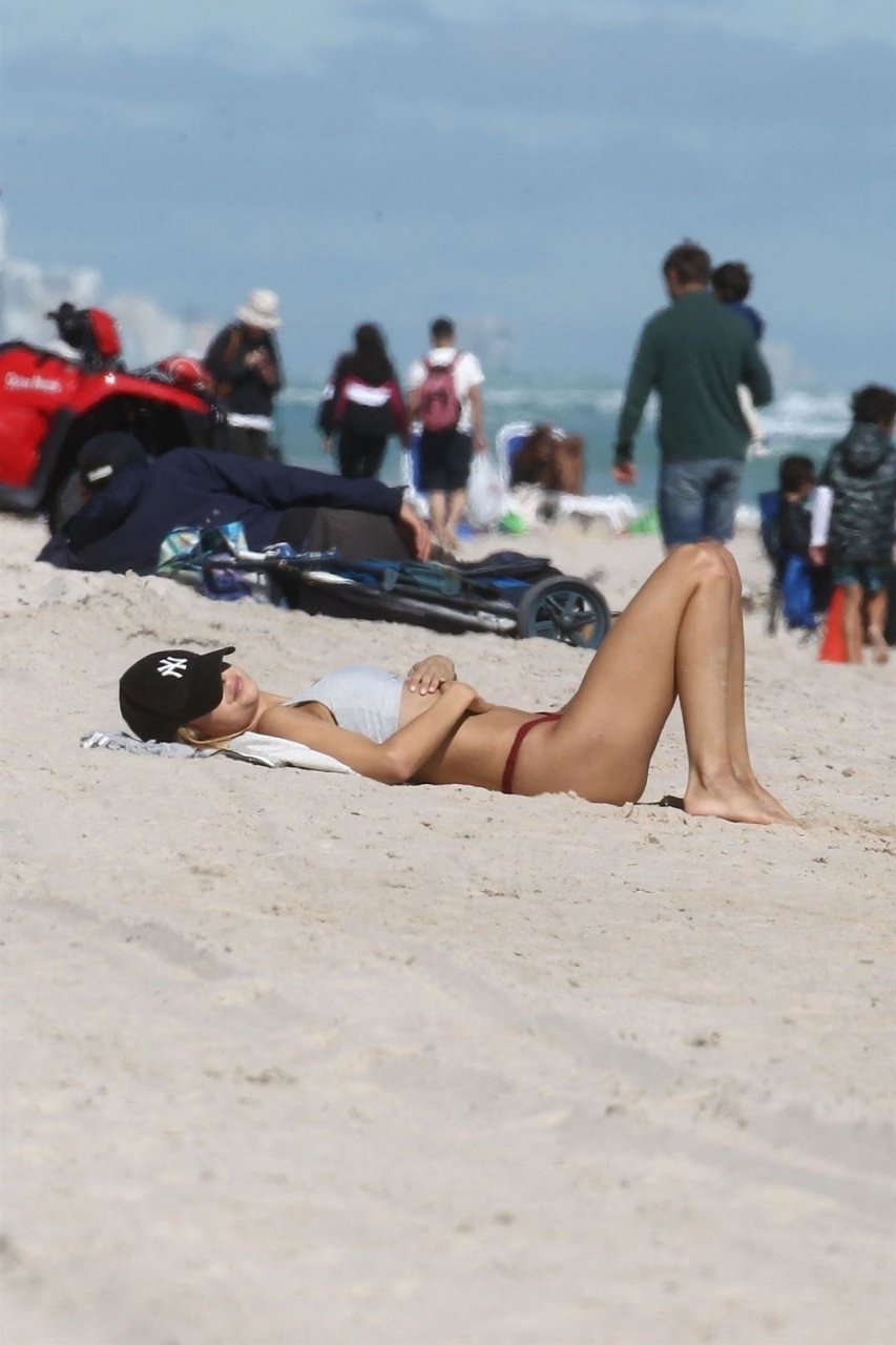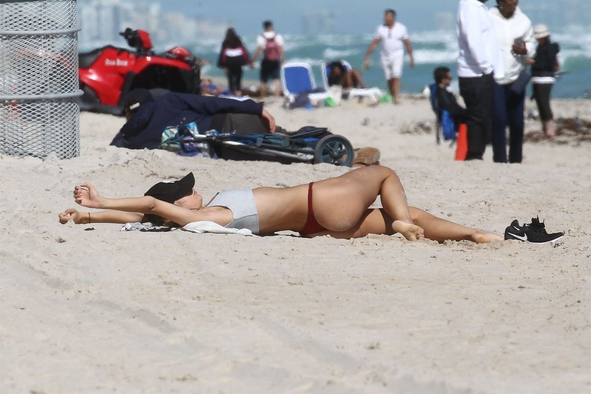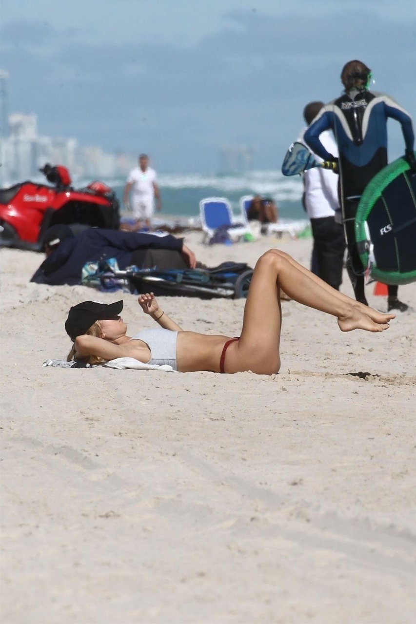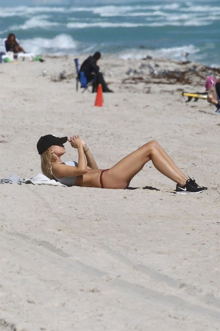 La diseñadora de trajes de baño Kimberley Garner va a la playa para un entrenamiento matutino en Miami, 27/01/2019. Kimberly mostró su cuerpo tonificado con un bikini tanga rojo y un sujetador deportivo gris para su entrenamiento.