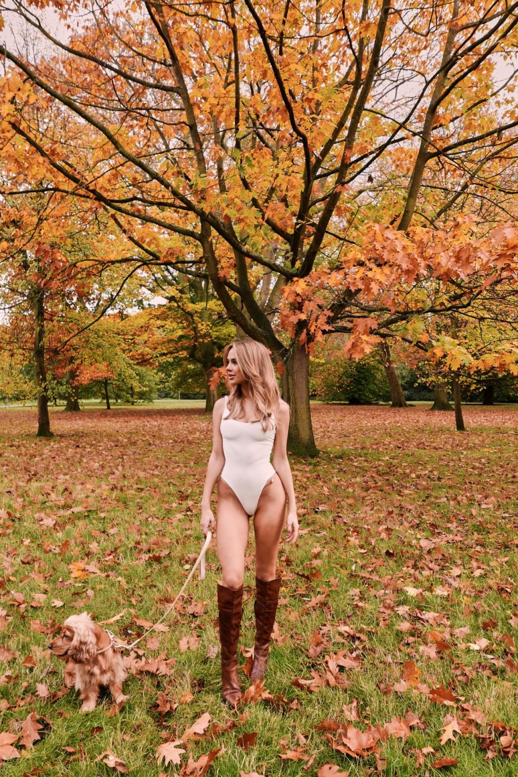 Kimberley Garner muestra su cuerpo sexy y su trasero jugoso mientras posa con un traje de baño blanco en Hyde Park en Londres, 21/11/2019.