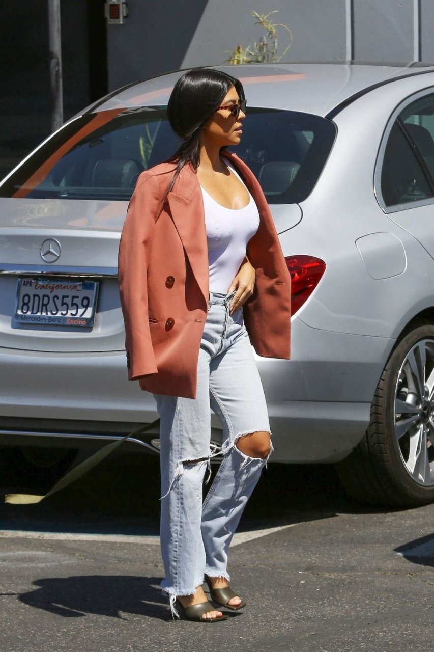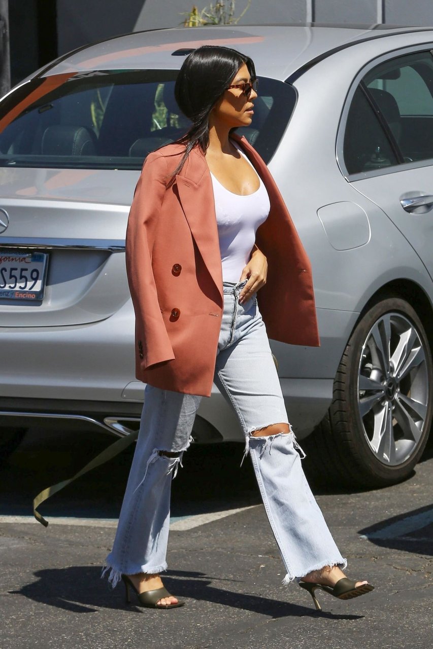 Kourtney Kardashian fue vista saliendo del estudio en Los Ángeles, 20/09/2019. La estrella de KUWTK lleva jeans y una blusa blanca combinada con una chaqueta coral elegante.