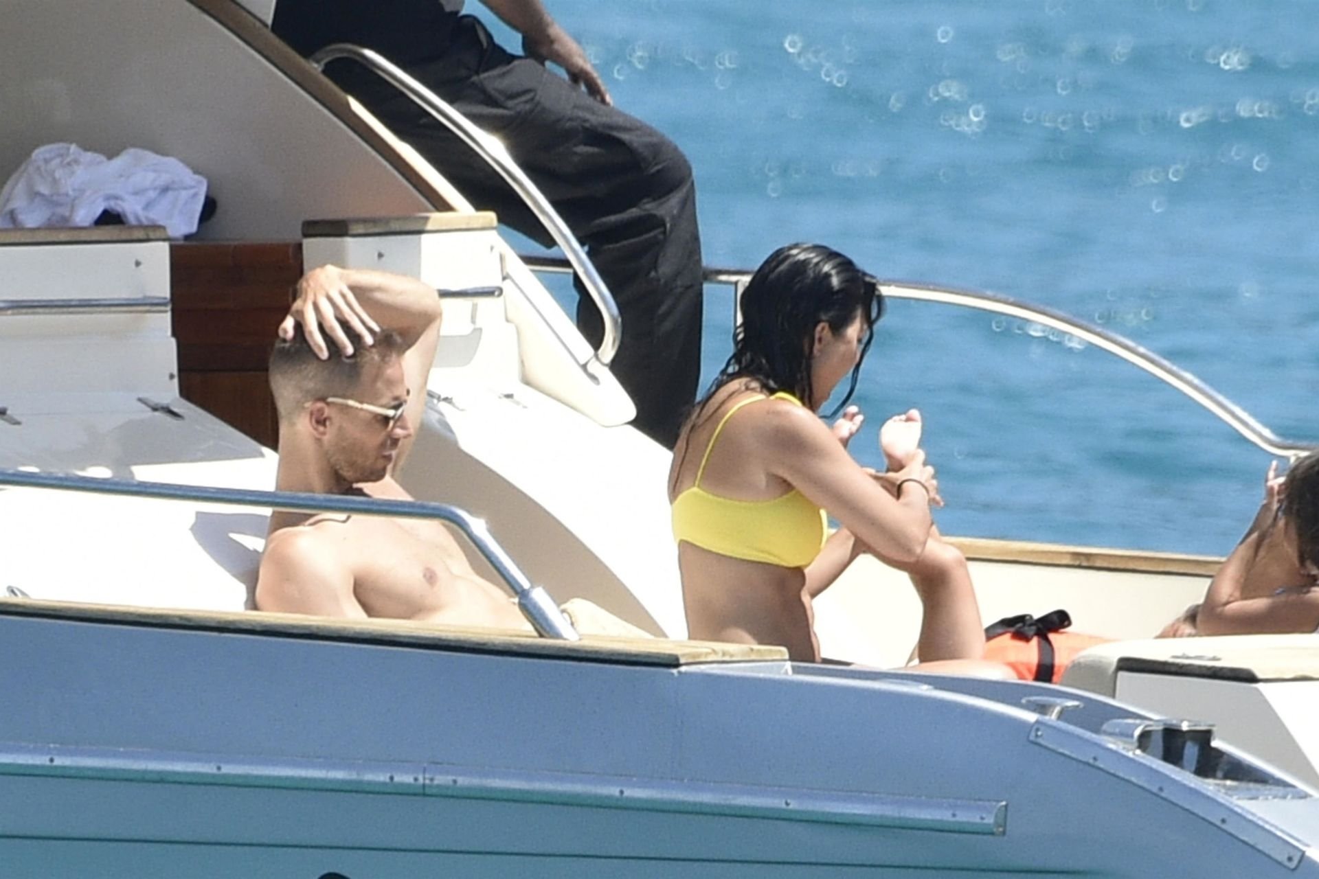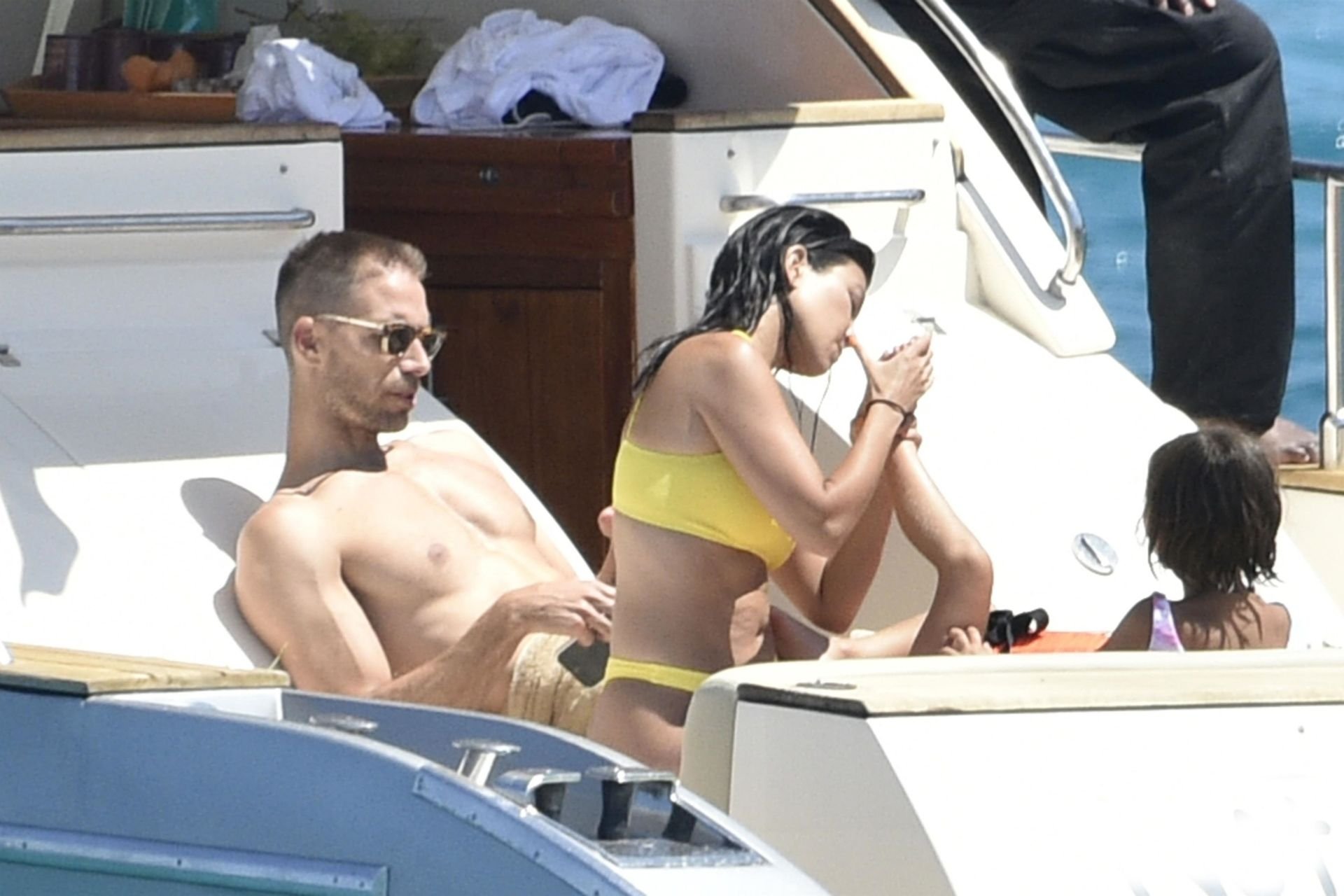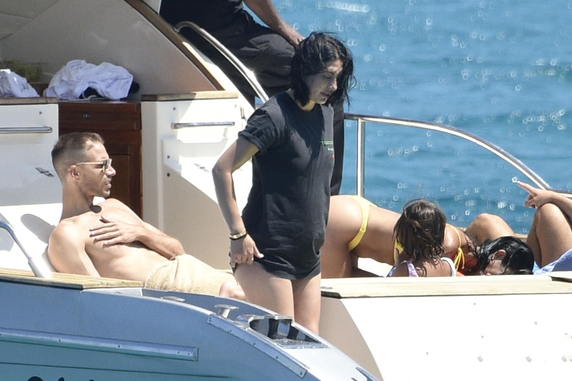 Kourtney Kardashian con sus hijos y su amigo Simon Huck fueron vistos en un yate en Córcega disfrutando del buen clima, 26/07/2019. Kourtney Kardashian muestra sus atributos con un bikini amarillo mientras se refresca en el océano.