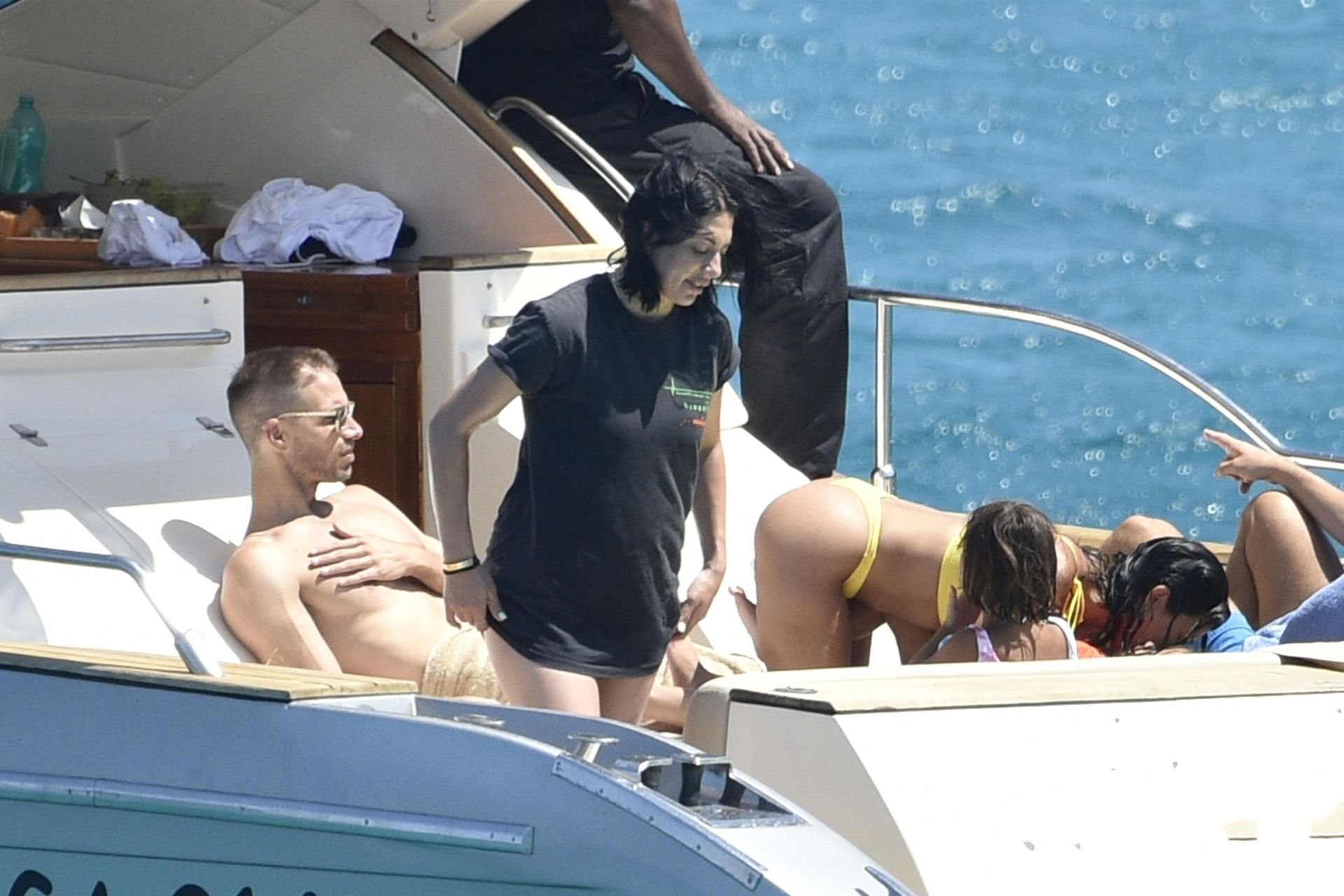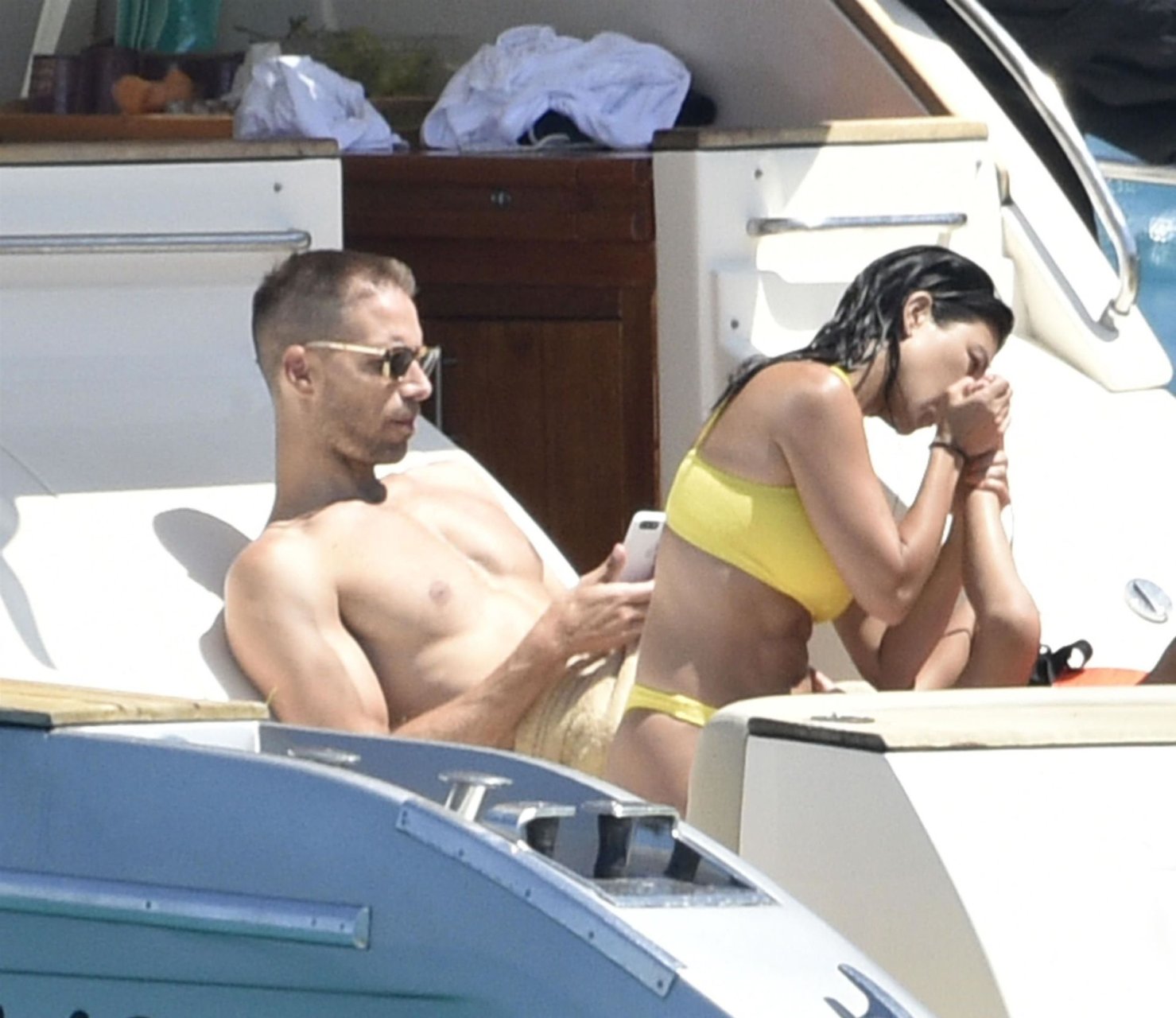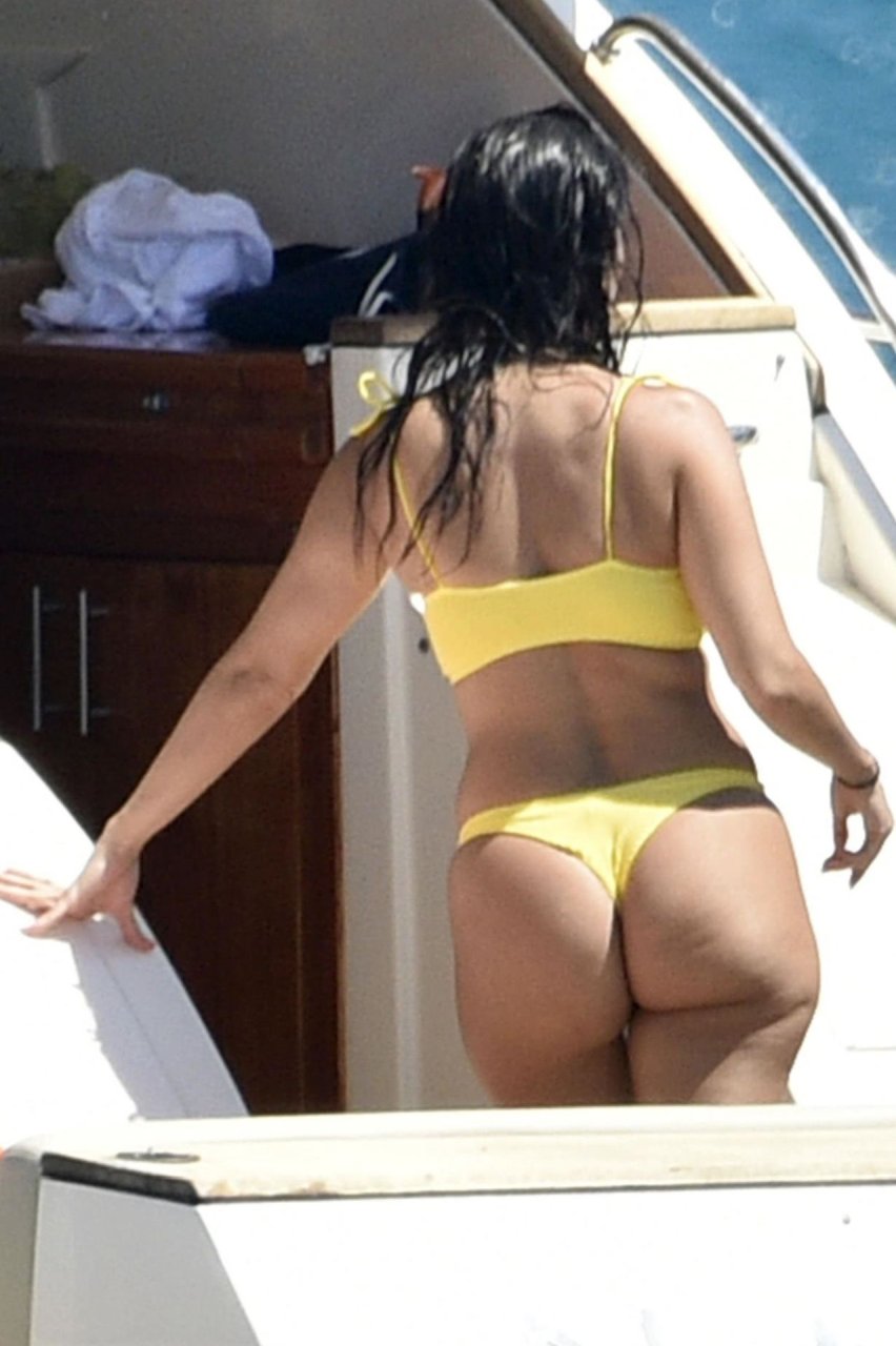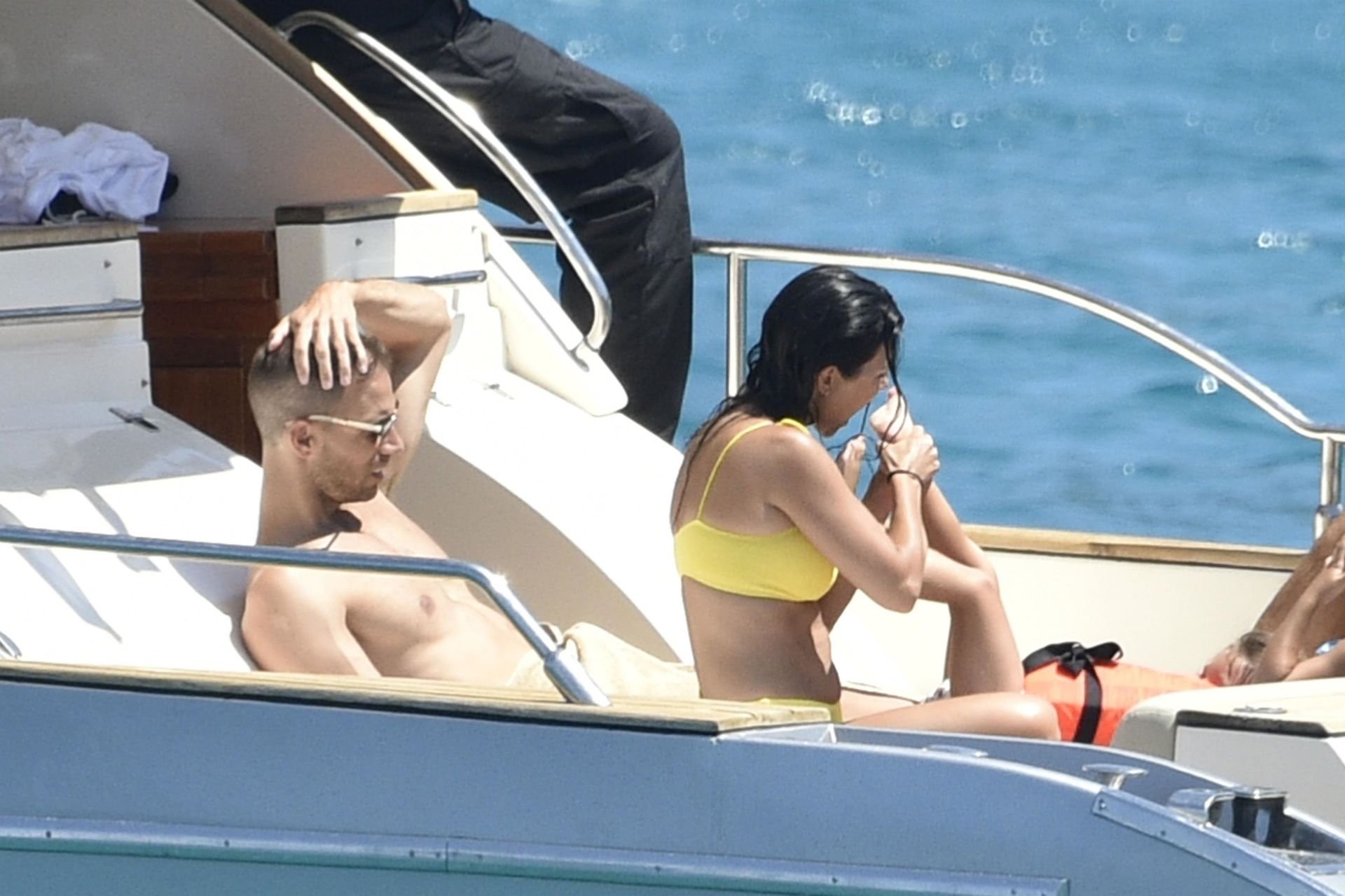 Kourtney Kardashian con sus hijos y su amigo Simon Huck fueron vistos en un yate en Córcega disfrutando del buen clima, 26/07/2019. Kourtney Kardashian muestra sus atributos con un bikini amarillo mientras se refresca en el océano.