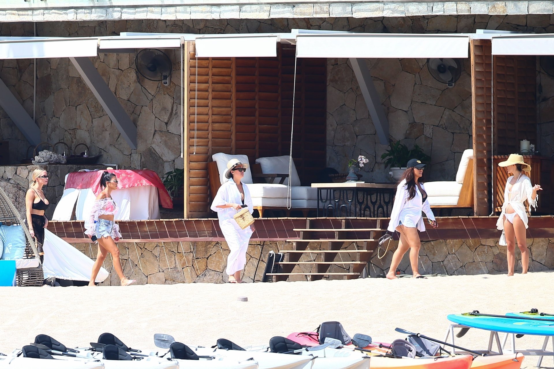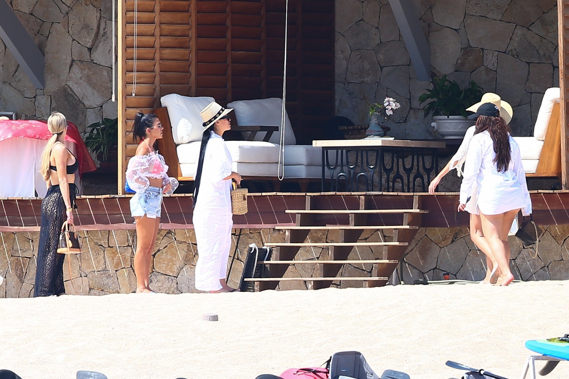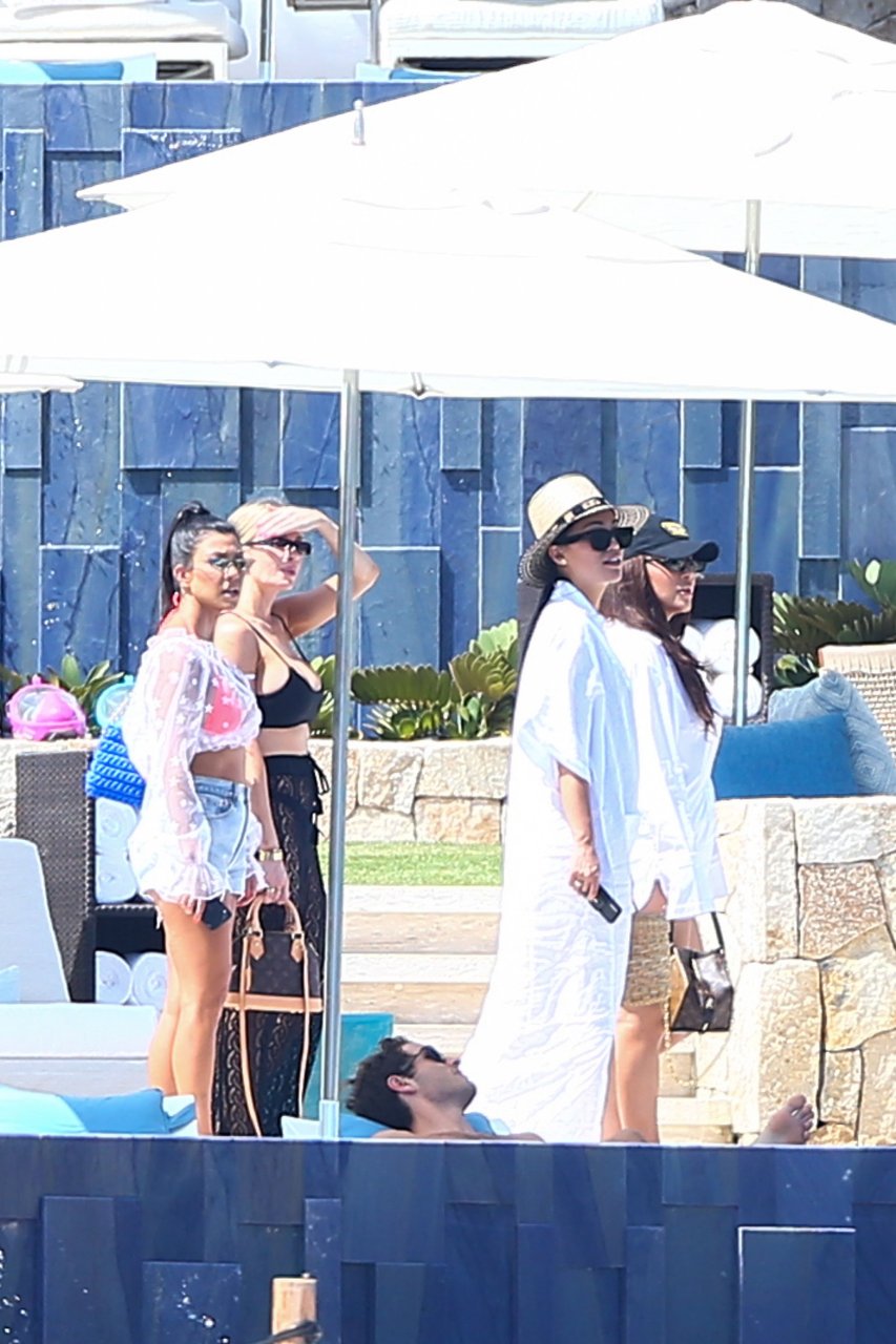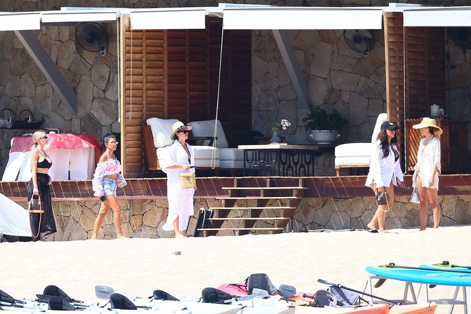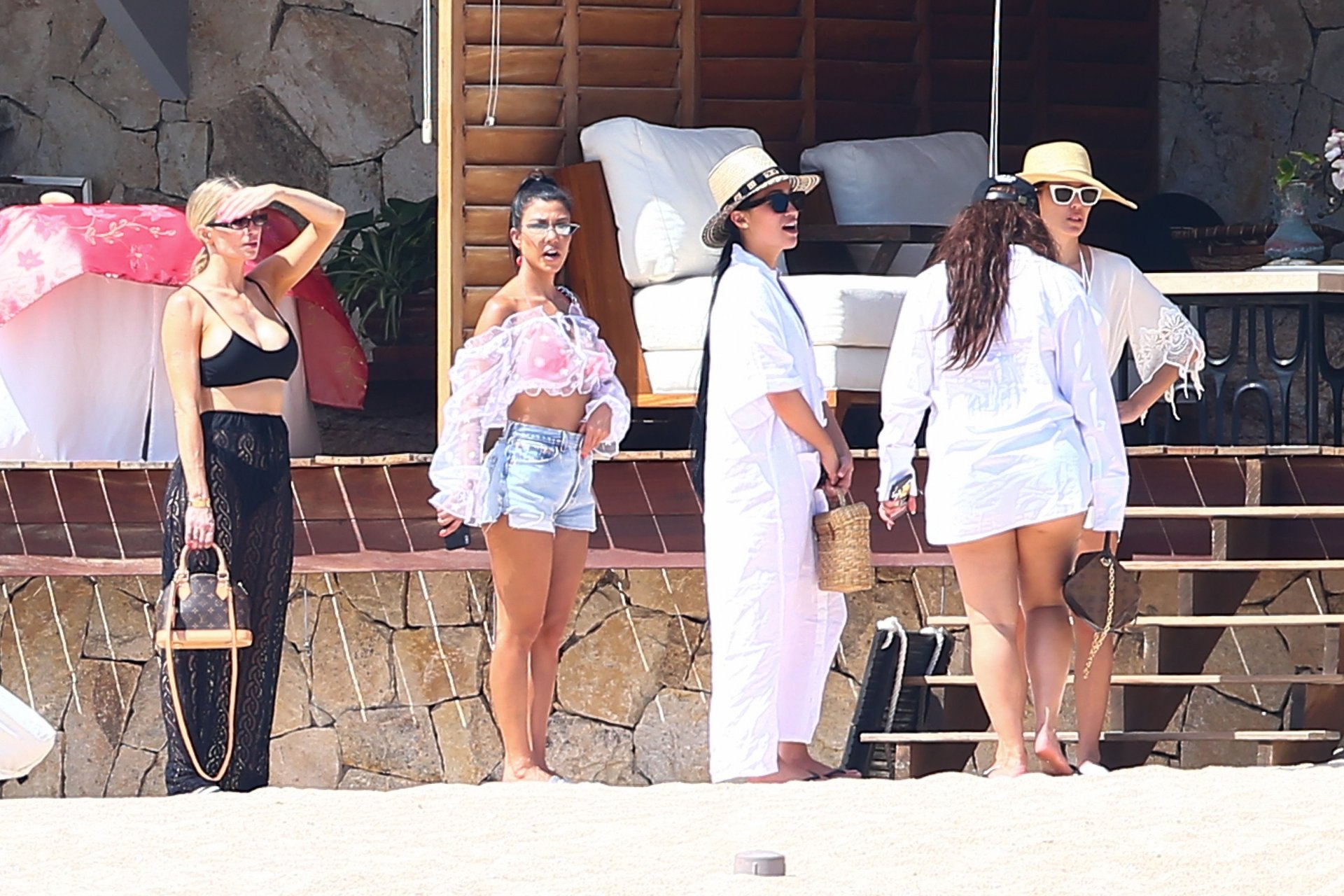 Kourtney Kardashian (39) continúa sus vacaciones ardientes con amigos en Cabo San Lucas, México, mientras sus hijos pasan el rato con el ex Scott Disick y su novia Sofia Richie, 25/08/2018. El grupo se reunió para almorzar en el restaurante de su resort, luego se dirigieron a la playa antes de regresar al resort.
