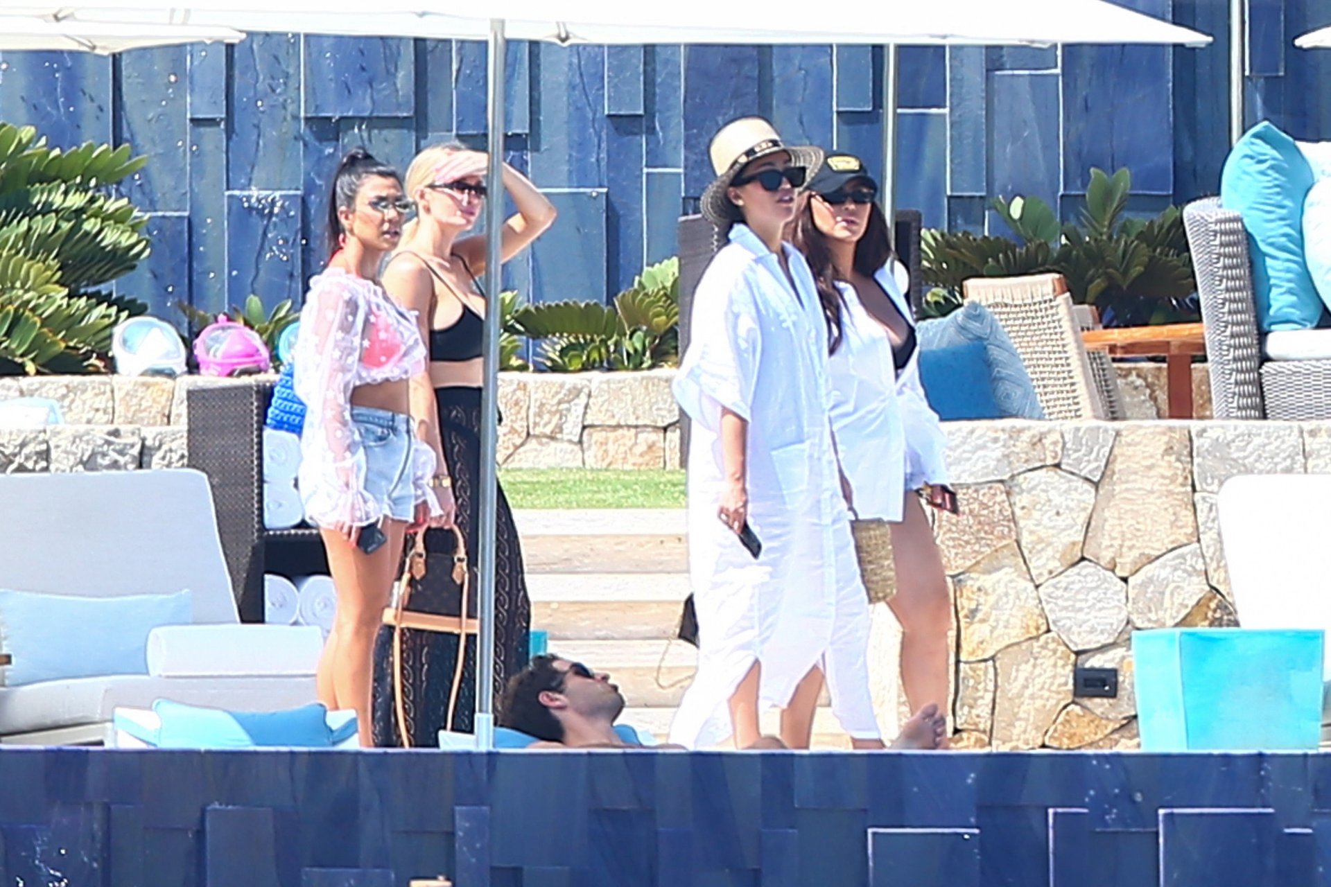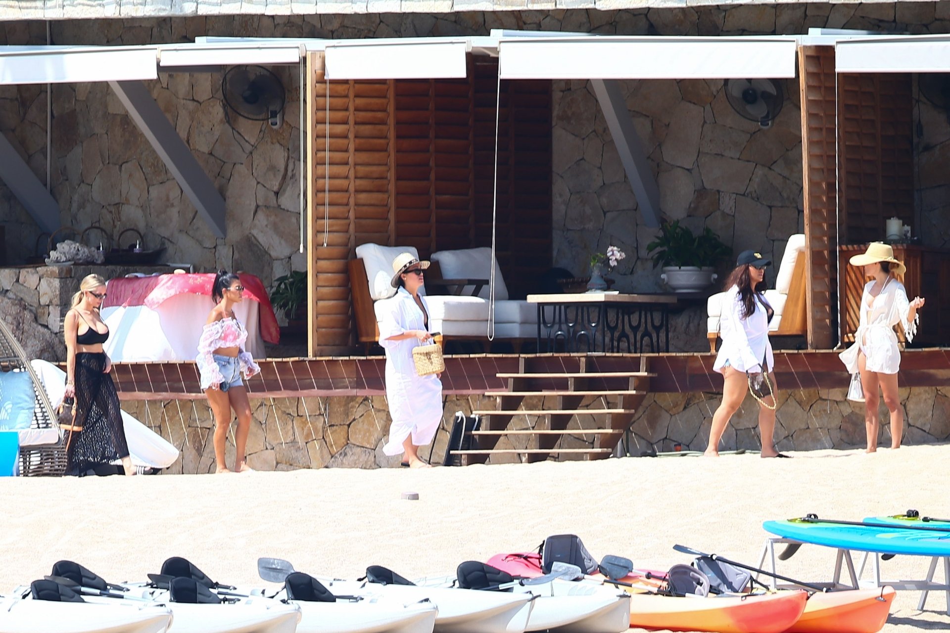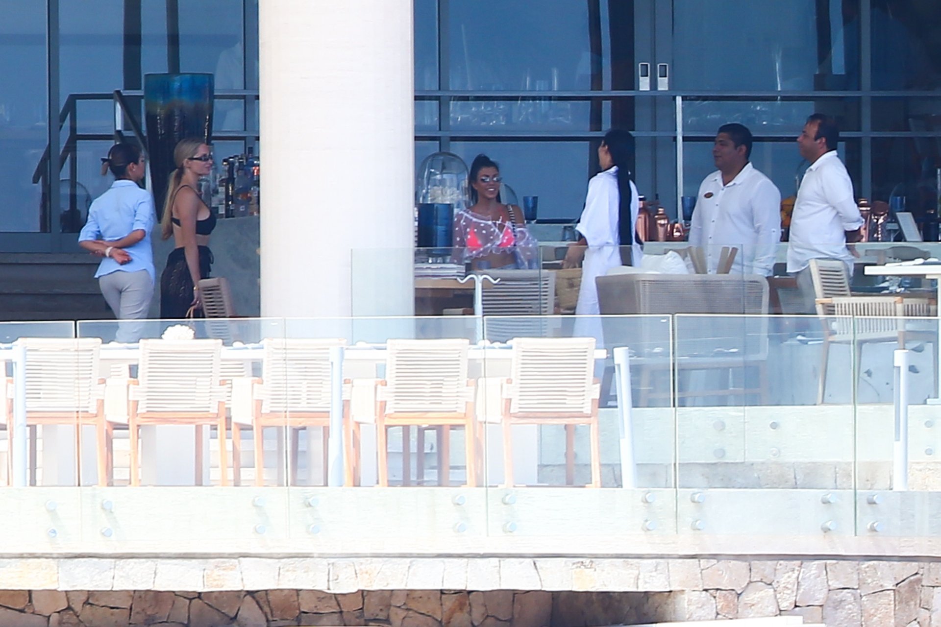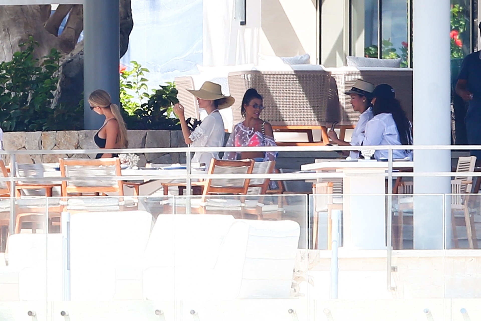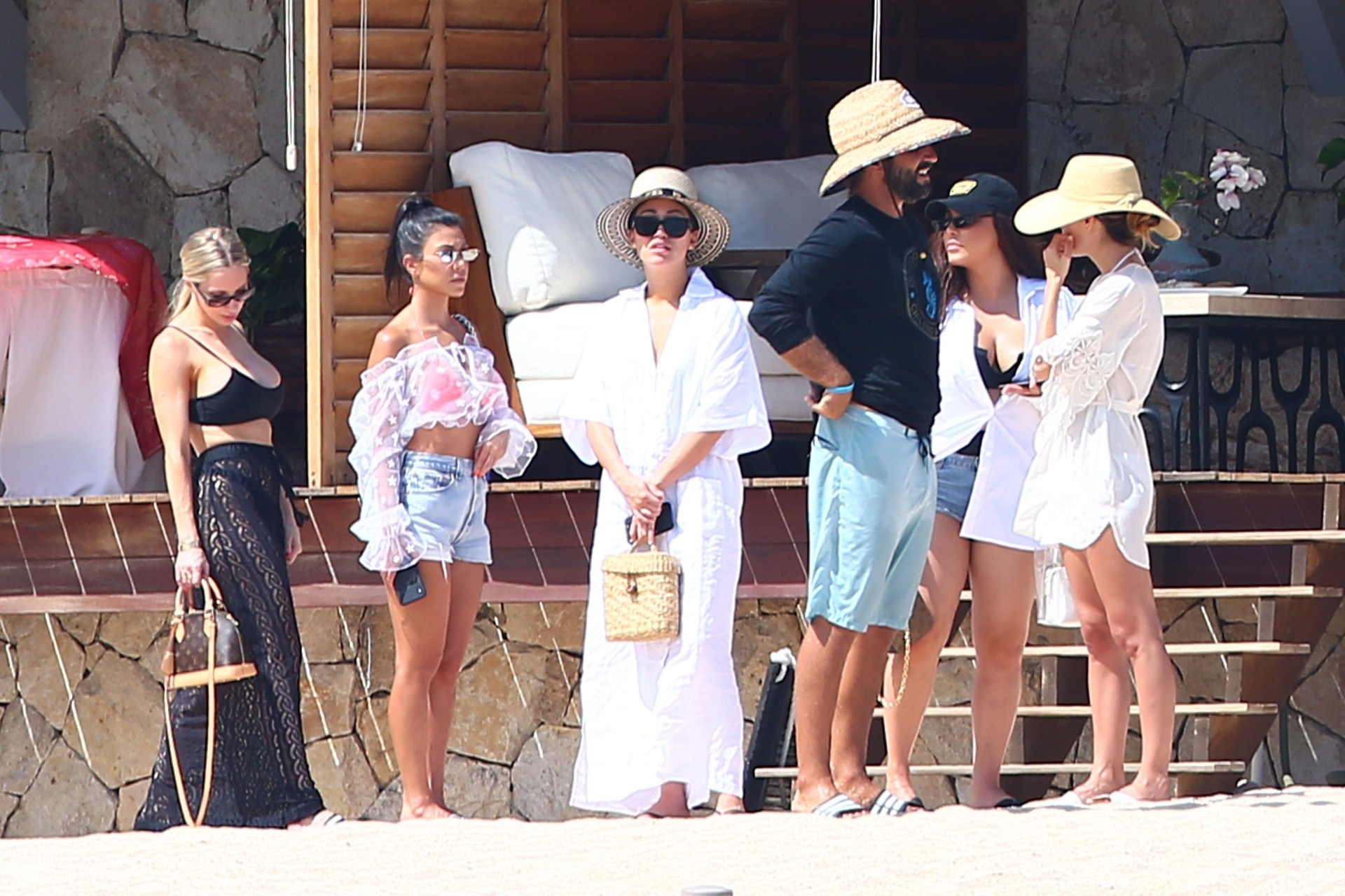 Kourtney Kardashian (39) continúa sus vacaciones ardientes con amigos en Cabo San Lucas, México, mientras sus hijos pasan el rato con el ex Scott Disick y su novia Sofia Richie, 25/08/2018. El grupo se reunió para almorzar en el restaurante de su resort, luego se dirigieron a la playa antes de regresar al resort.