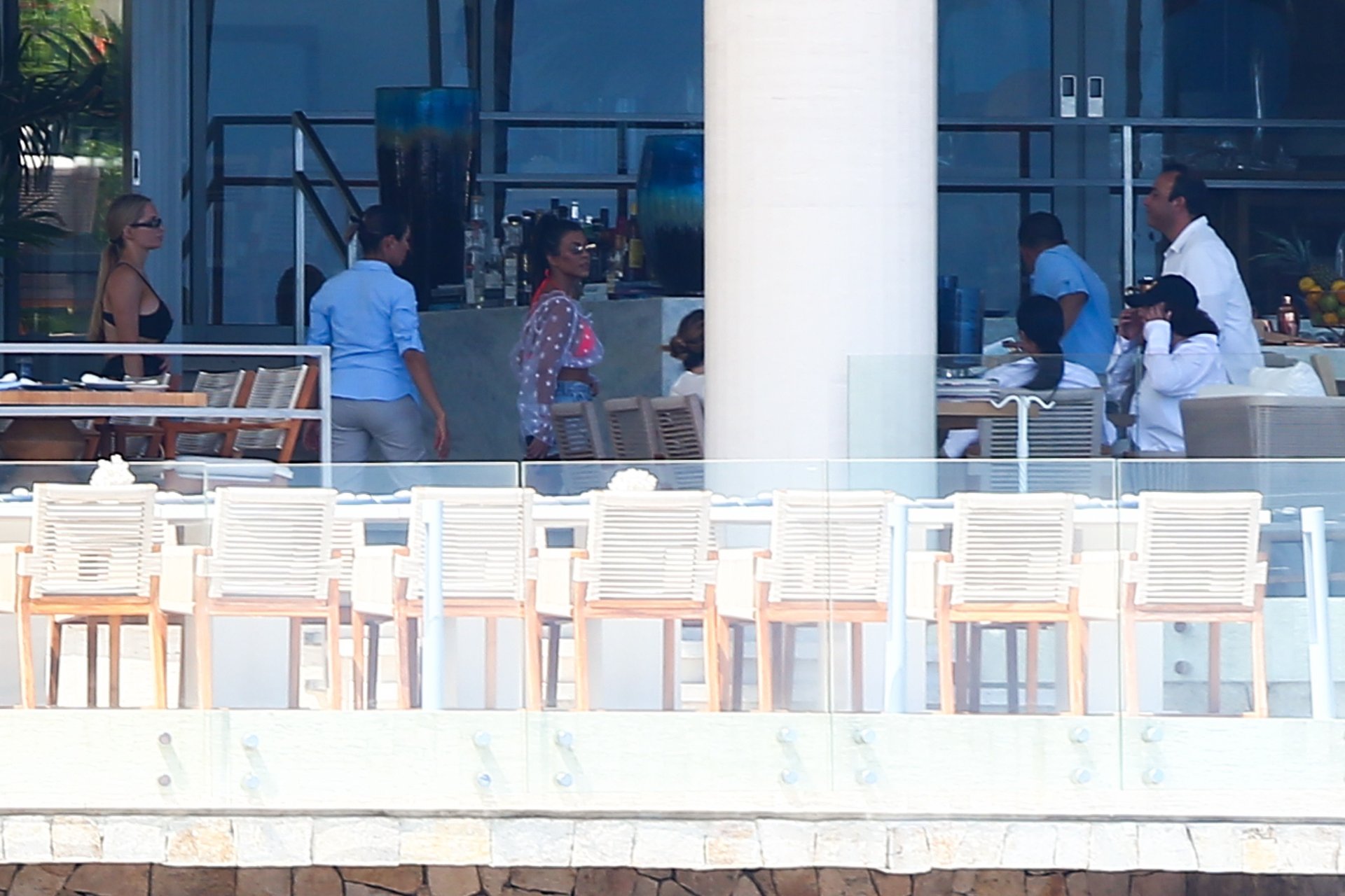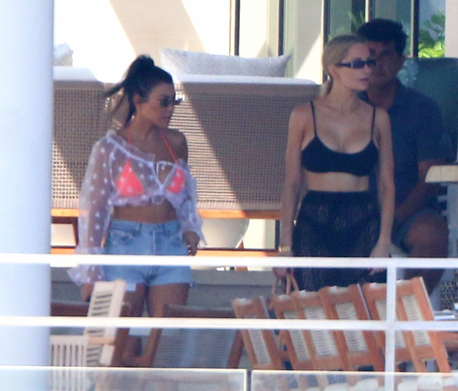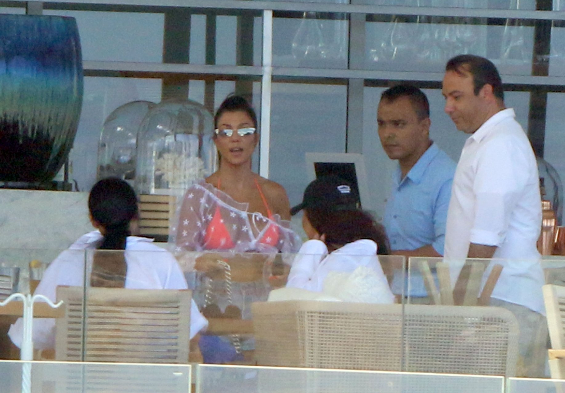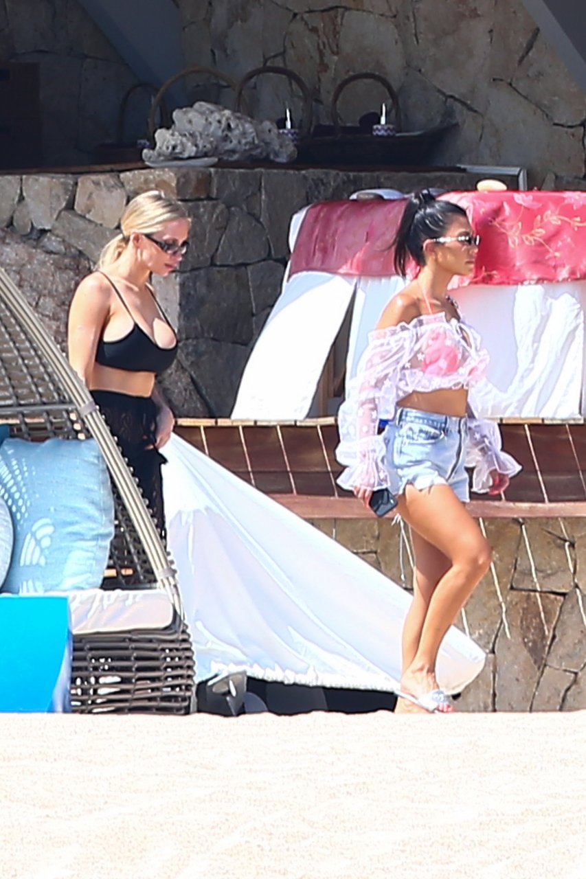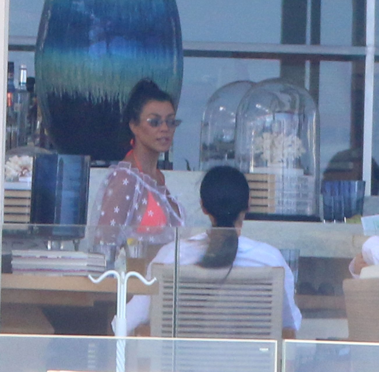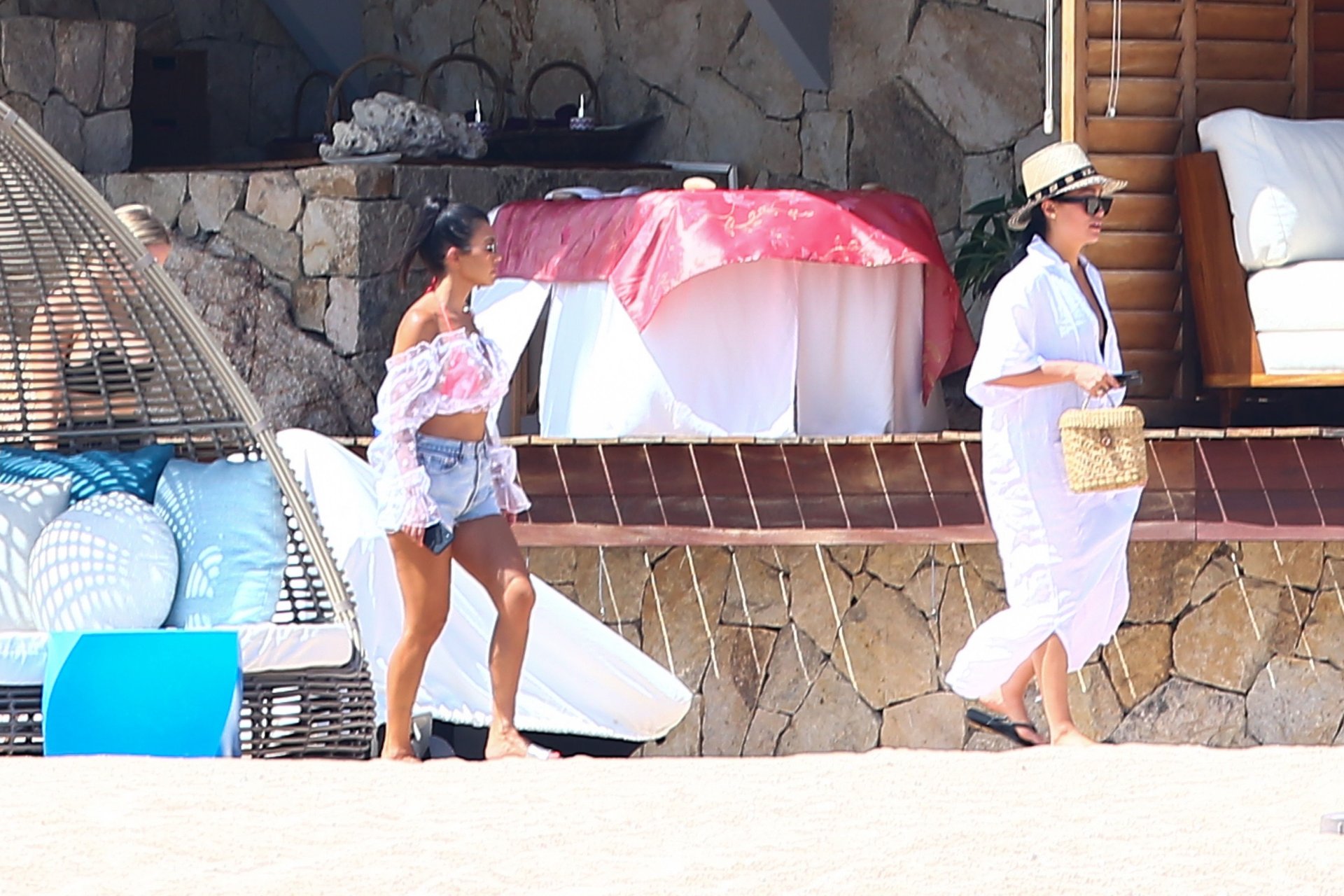 Kourtney Kardashian (39) continúa sus vacaciones ardientes con amigos en Cabo San Lucas, México, mientras sus hijos pasan el rato con el ex Scott Disick y su novia Sofia Richie, 25/08/2018. El grupo se reunió para almorzar en el restaurante de su resort, luego se dirigieron a la playa antes de regresar al resort.