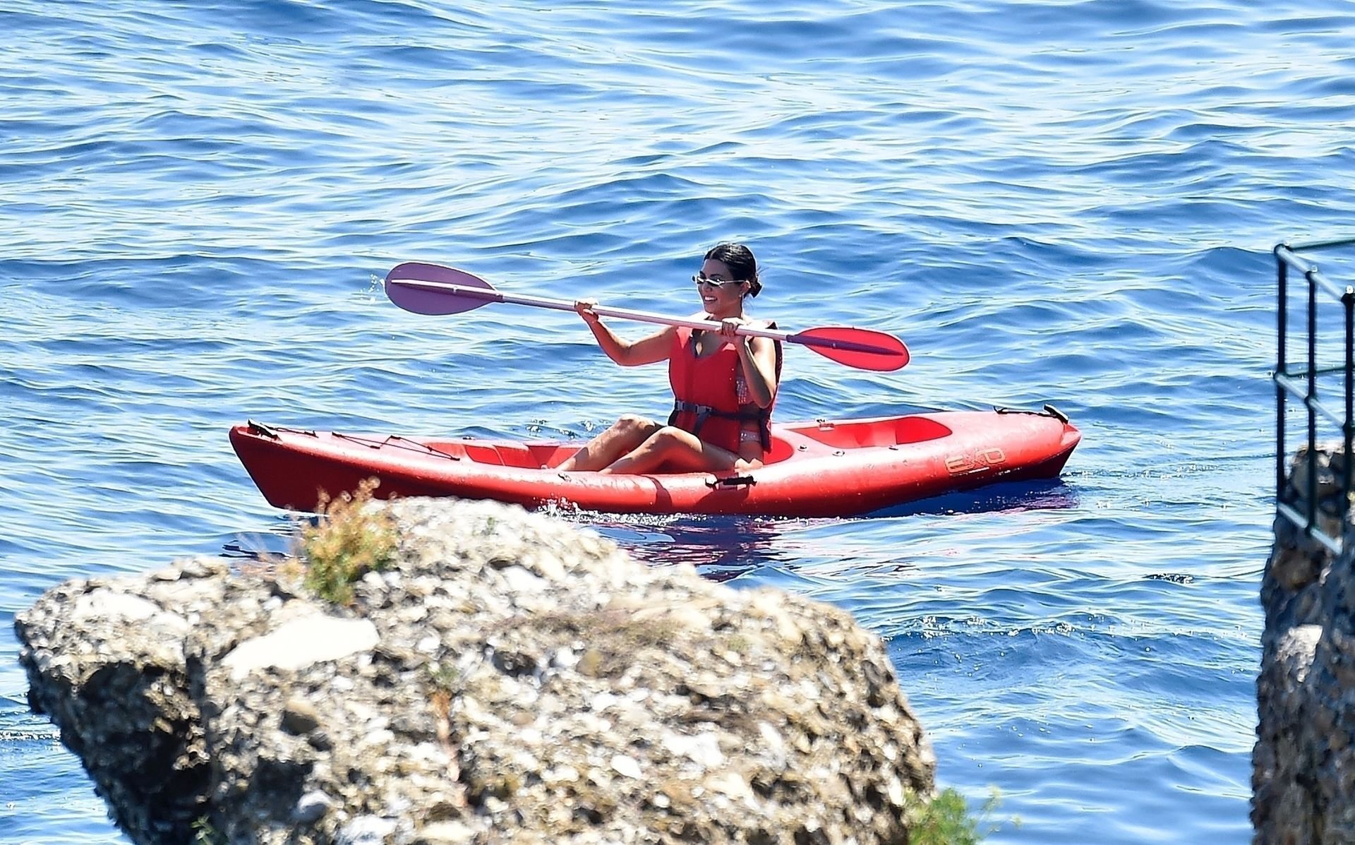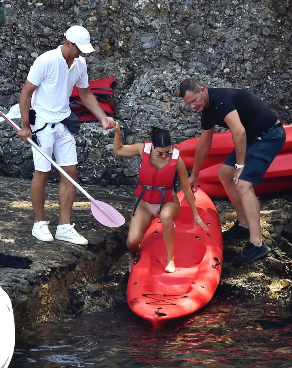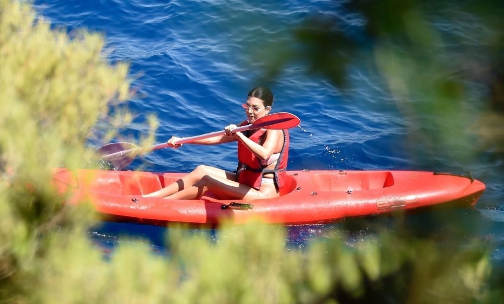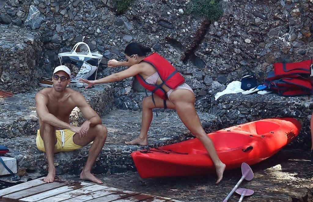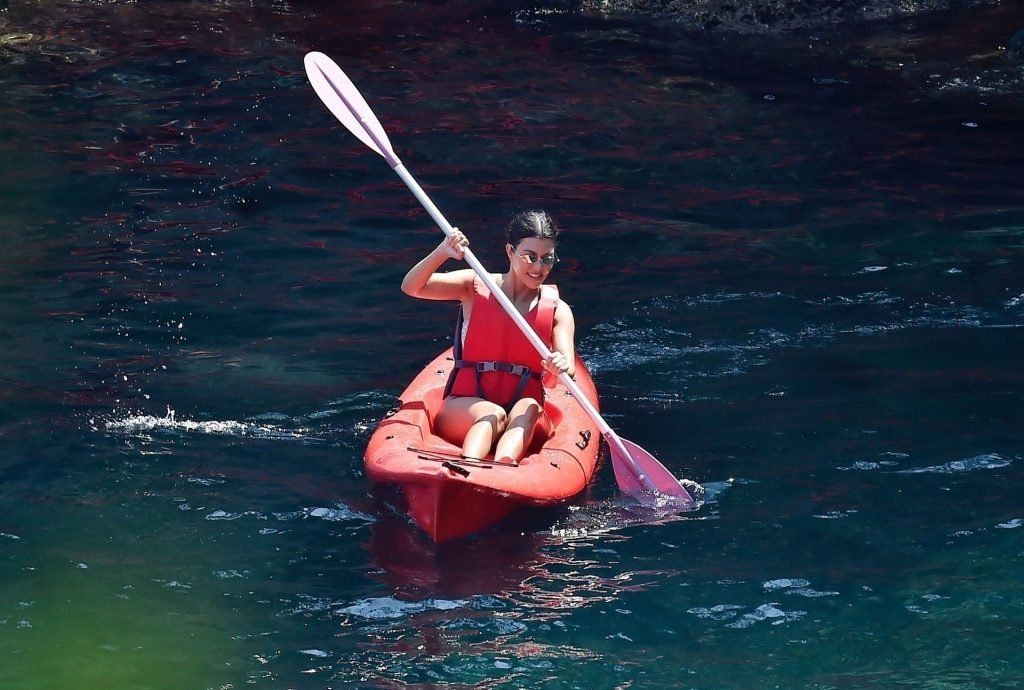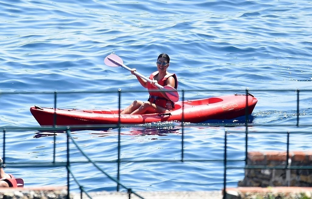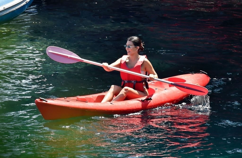 La sexy estrella deslumbró con el calor italiano y se quitó su vestido morado para mostrar su pequeño bikini y usó su chaleco salvavidas mientras remaba divirtiéndose en el agua.