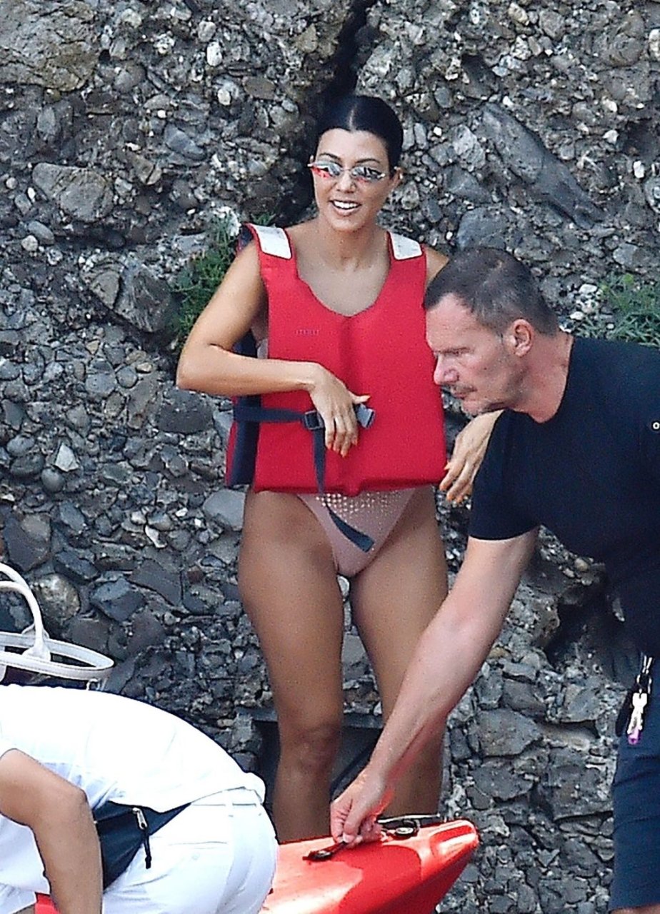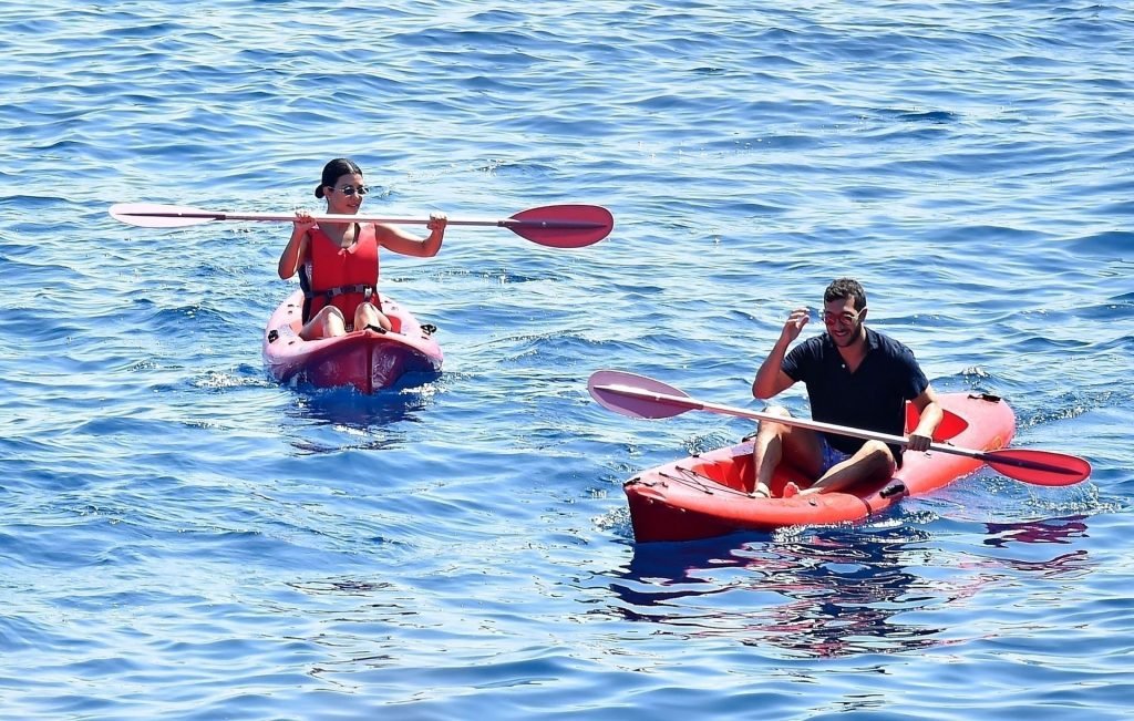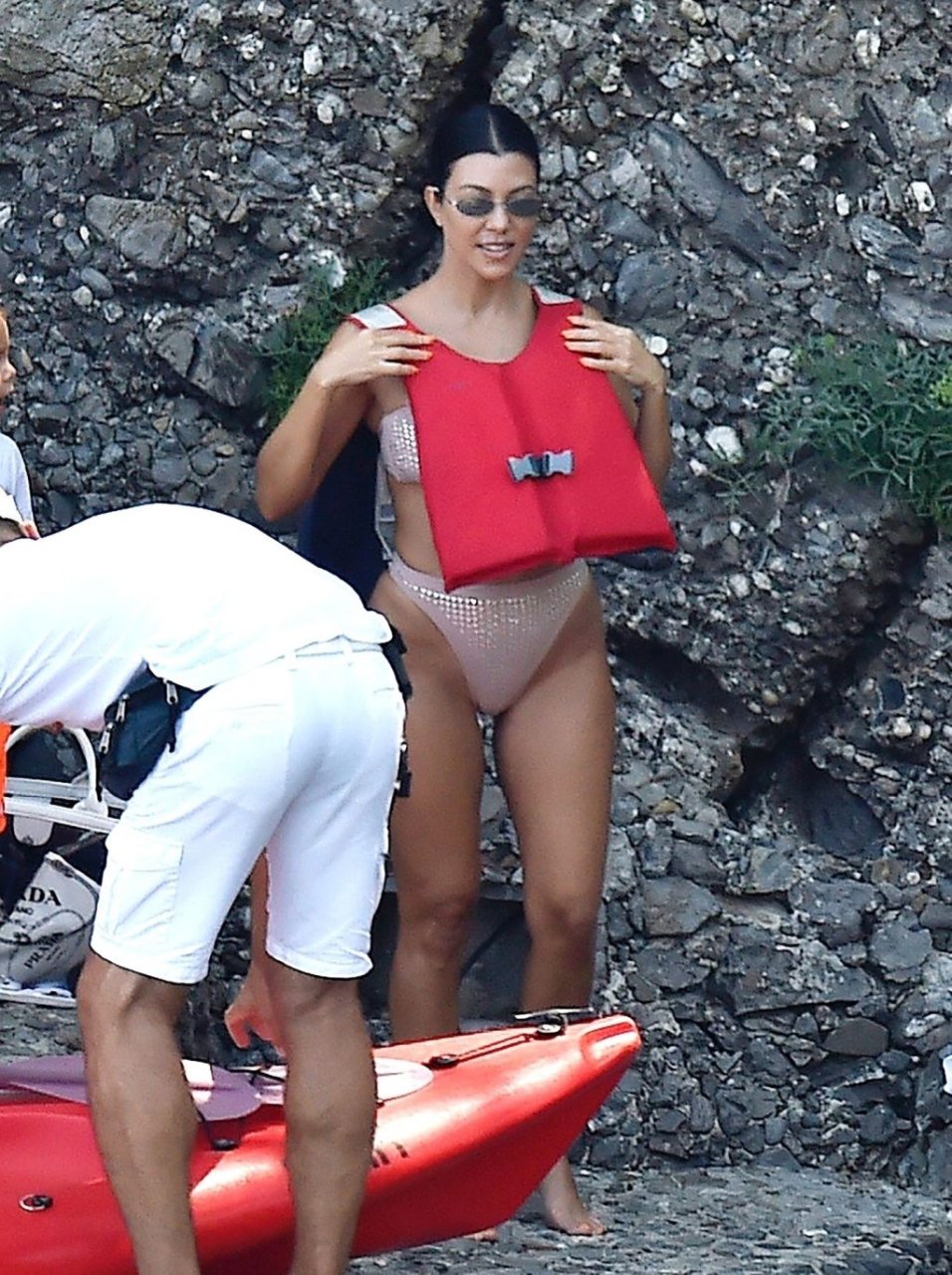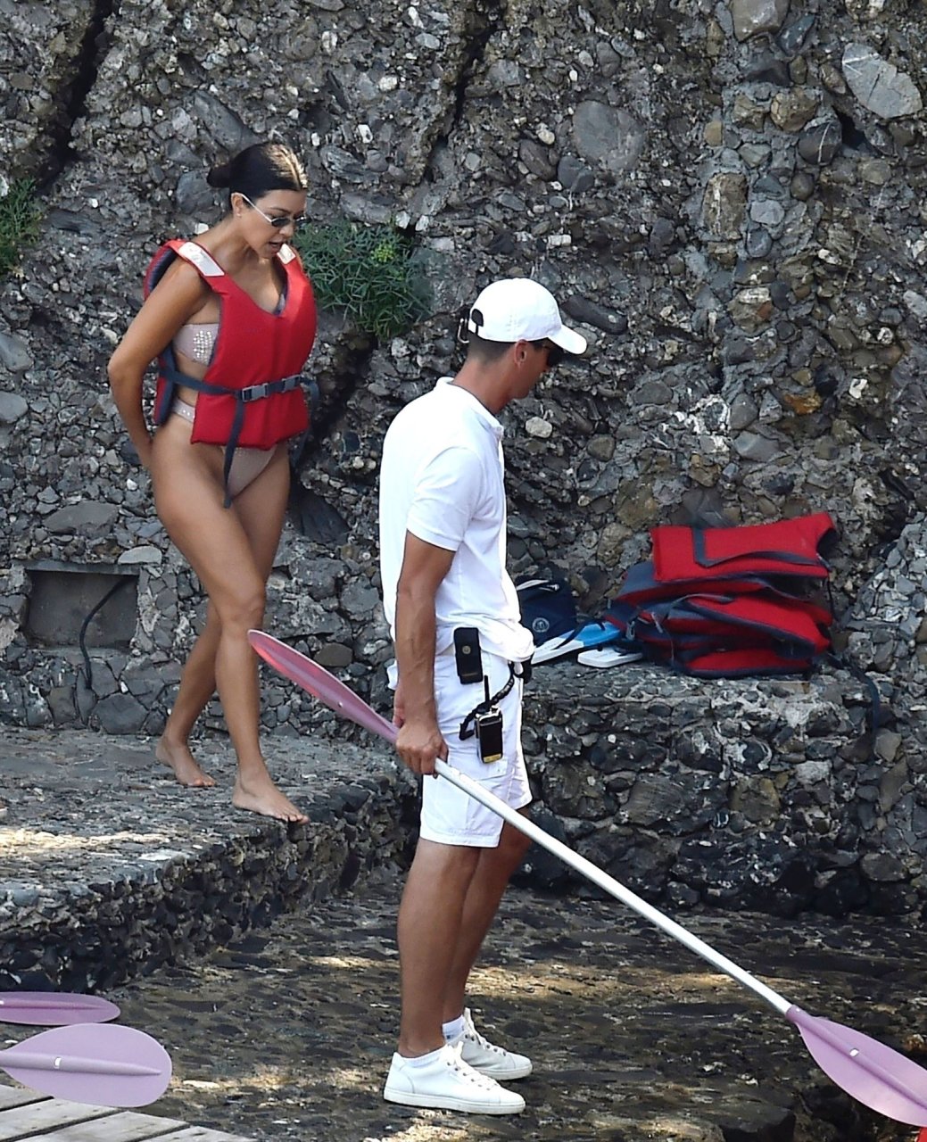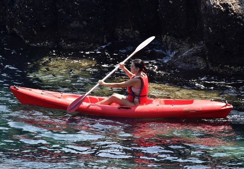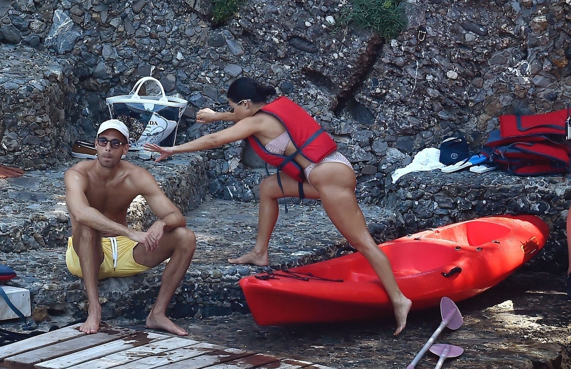 La sexy estrella deslumbró con el calor italiano y se quitó su vestido morado para mostrar su pequeño bikini y usó su chaleco salvavidas mientras remaba divirtiéndose en el agua.