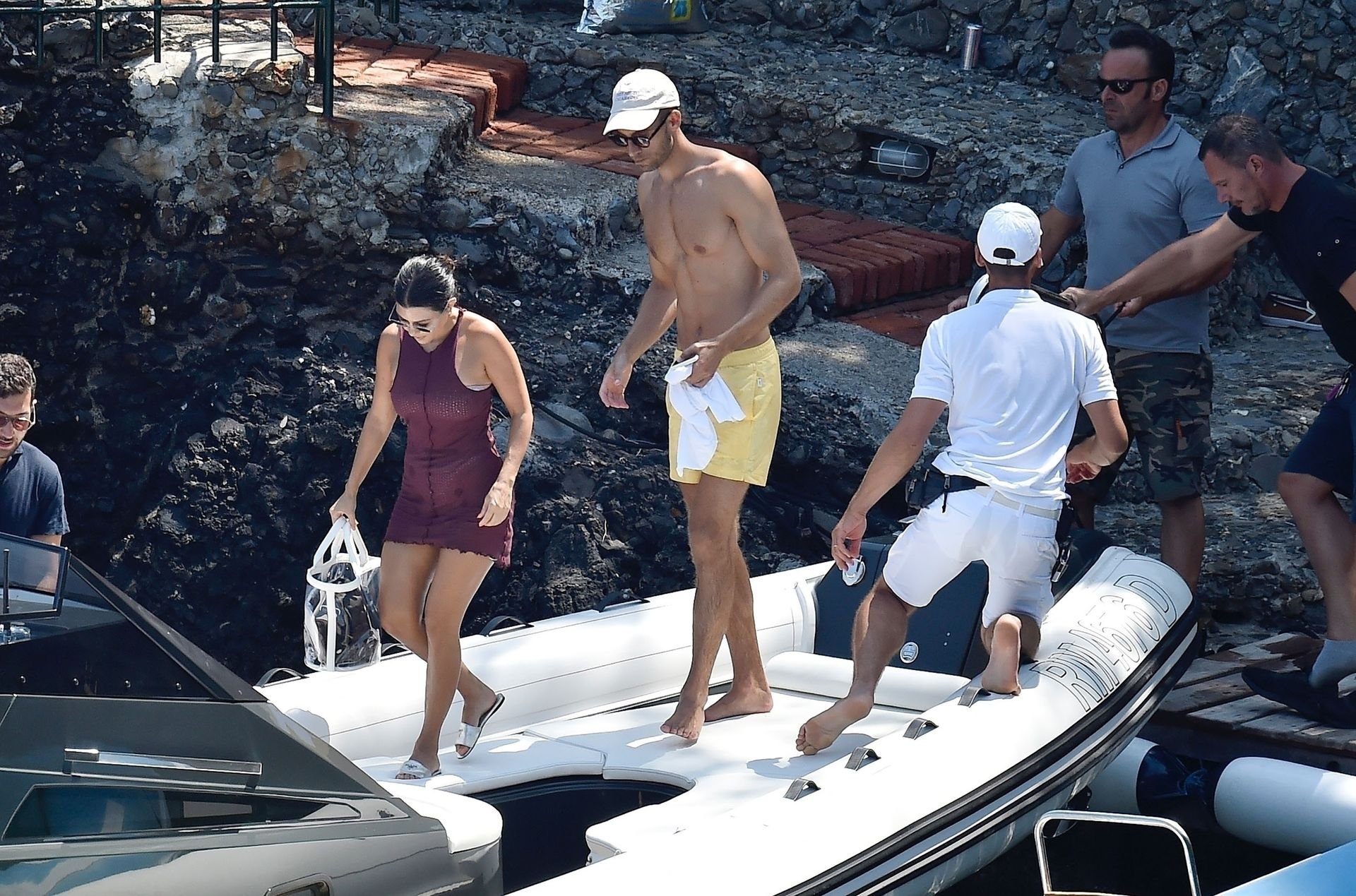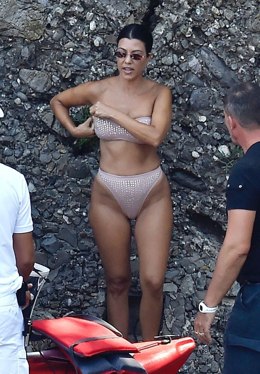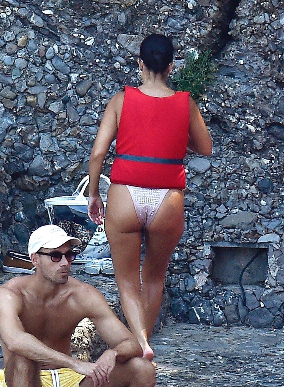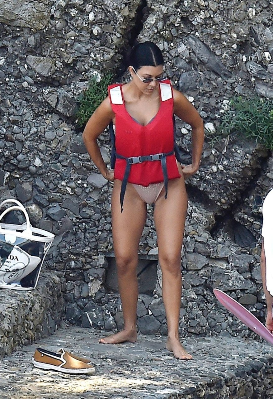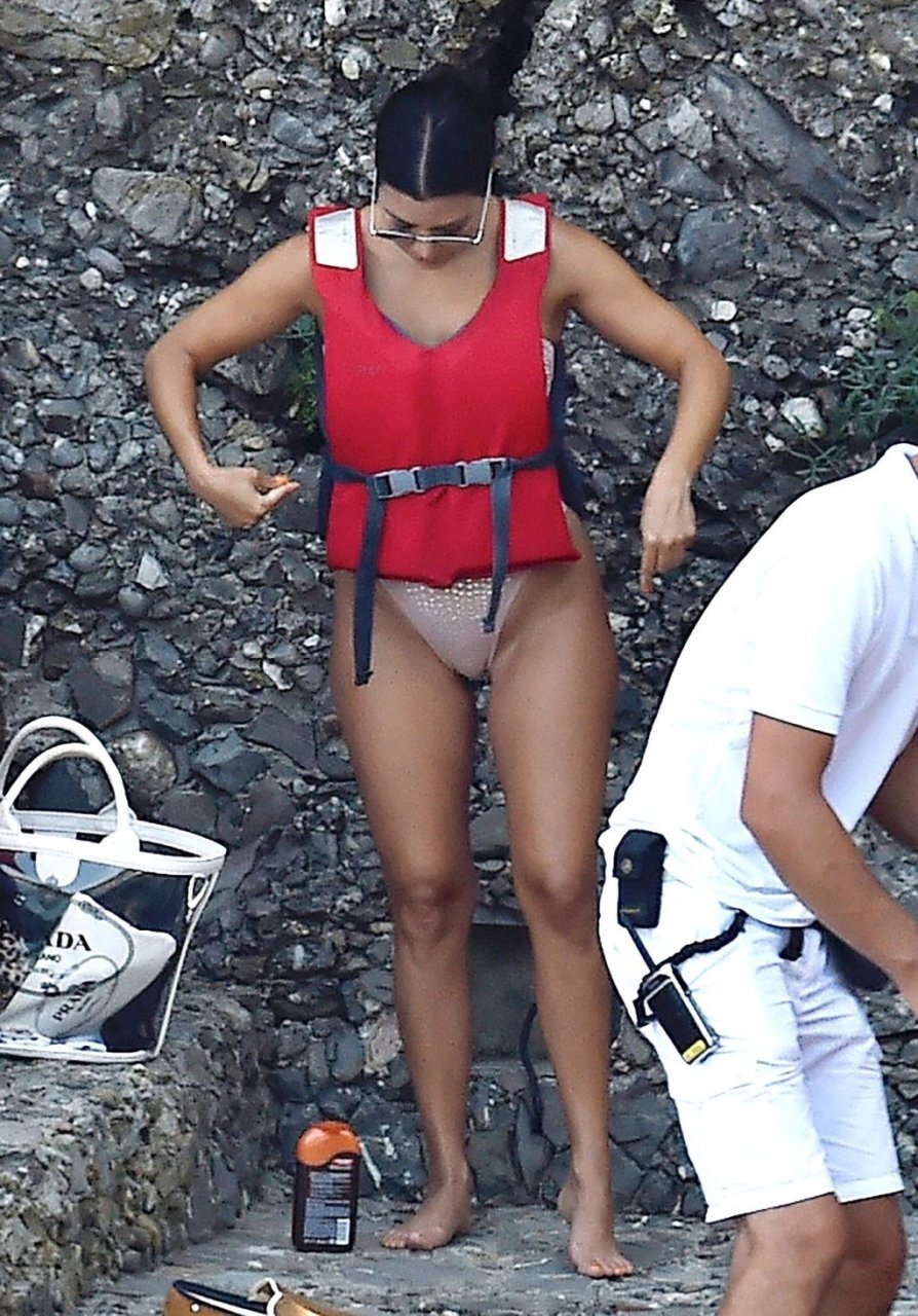 La sexy estrella deslumbró con el calor italiano y se quitó su vestido morado para mostrar su pequeño bikini y usó su chaleco salvavidas mientras remaba divirtiéndose en el agua.