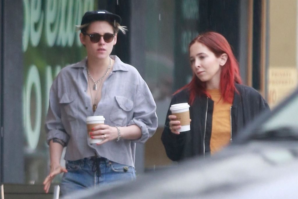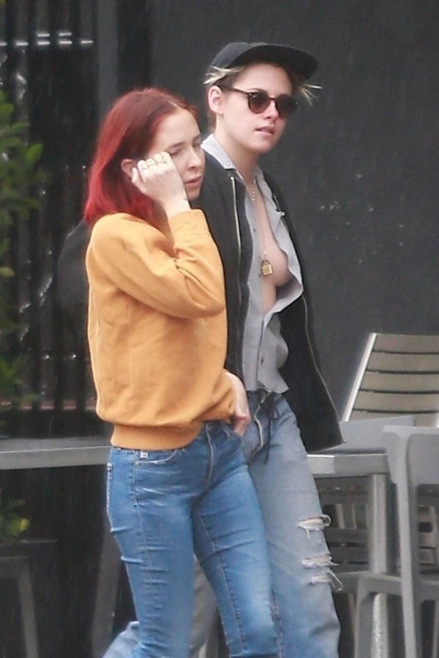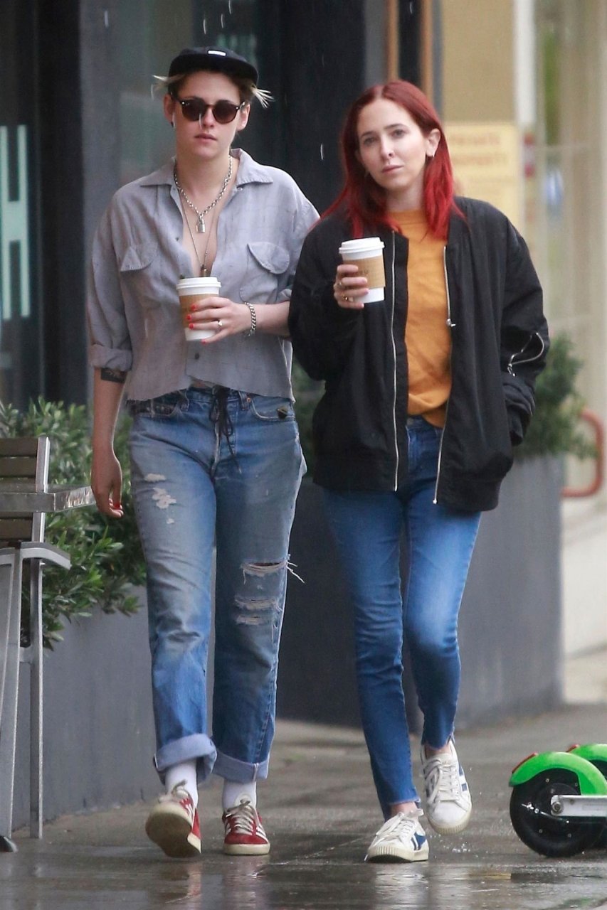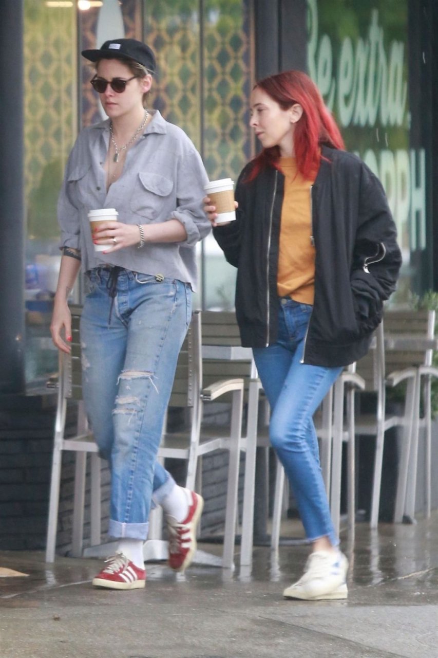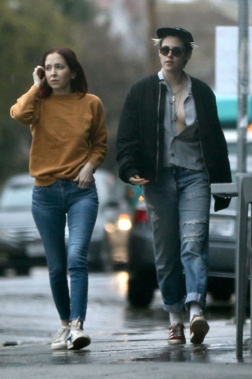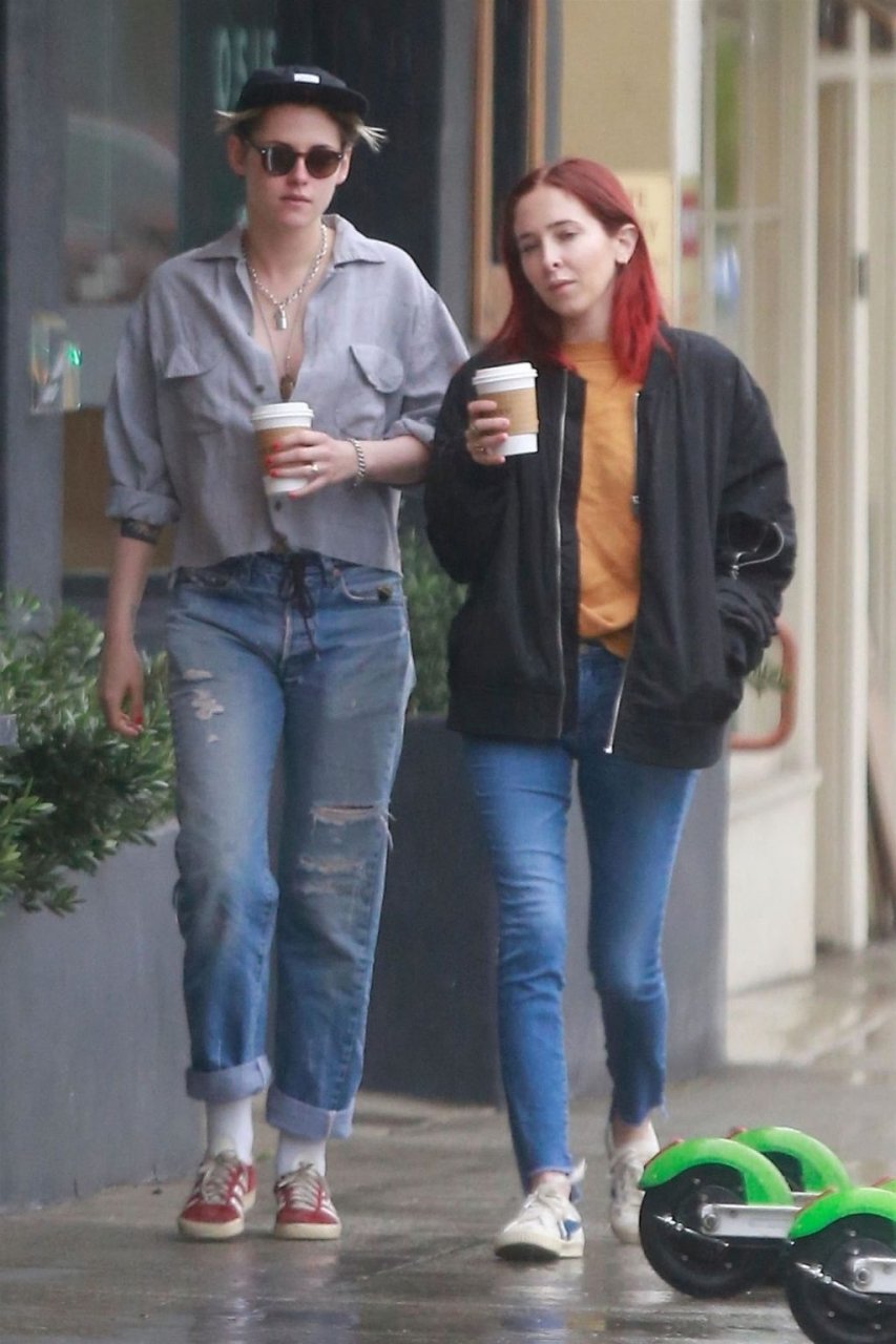 Actriz Kristen Stewart y su novia Sara Dinkin salen a tomar un café por la mañana en un día lluvioso en Los Feliz, 31/01/2019. Kristen decidió no usar sostén para la salida a tomar café y mostró un poco más de lo quizás pretendido.