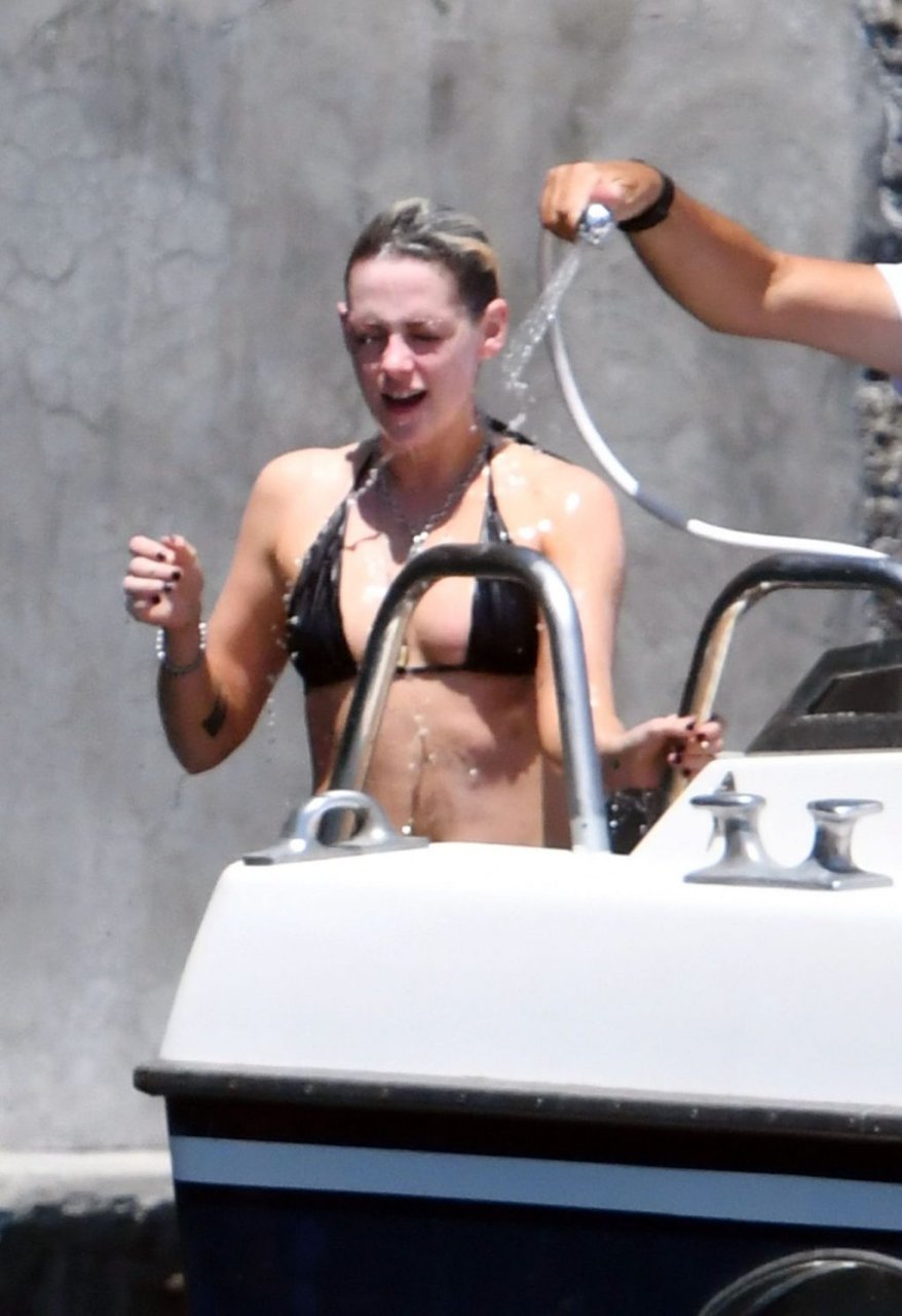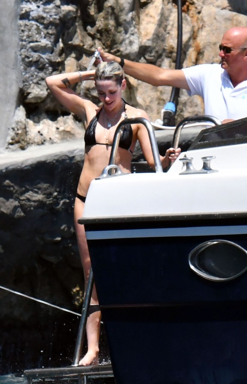 Mostrando su figura esbelta en su pequeño y escueto bikini negro, la actriz Kristen Stewart fue vista durante sus vacaciones de verano en la Costa Amalfitana, 14/07/2019. Kristen, famosa por su papel en las trilogías de “Crepúsculo”, se divirtió saltando desde su barco y relajándose con su novia Stella Maxwell y algunos amigos, y se quitó el top para disfrutar del cálido sol italiano.
