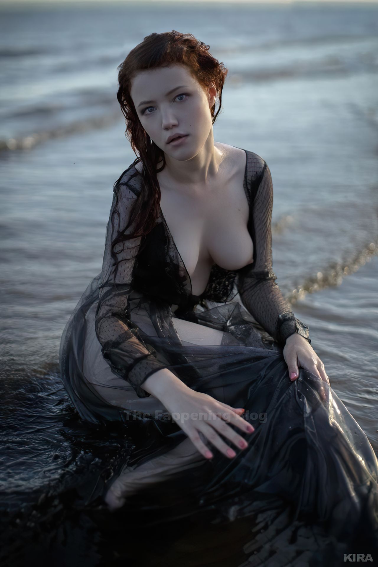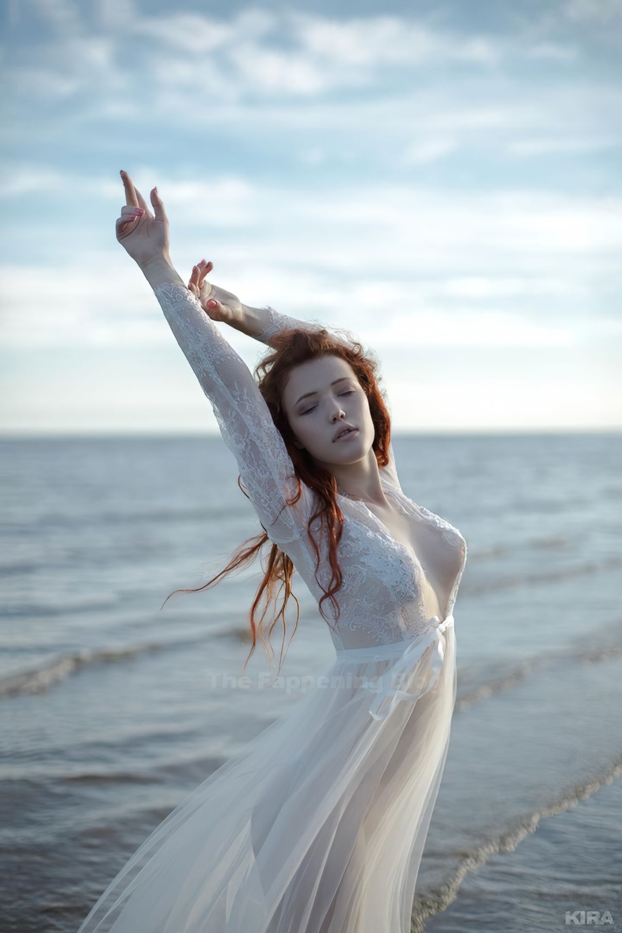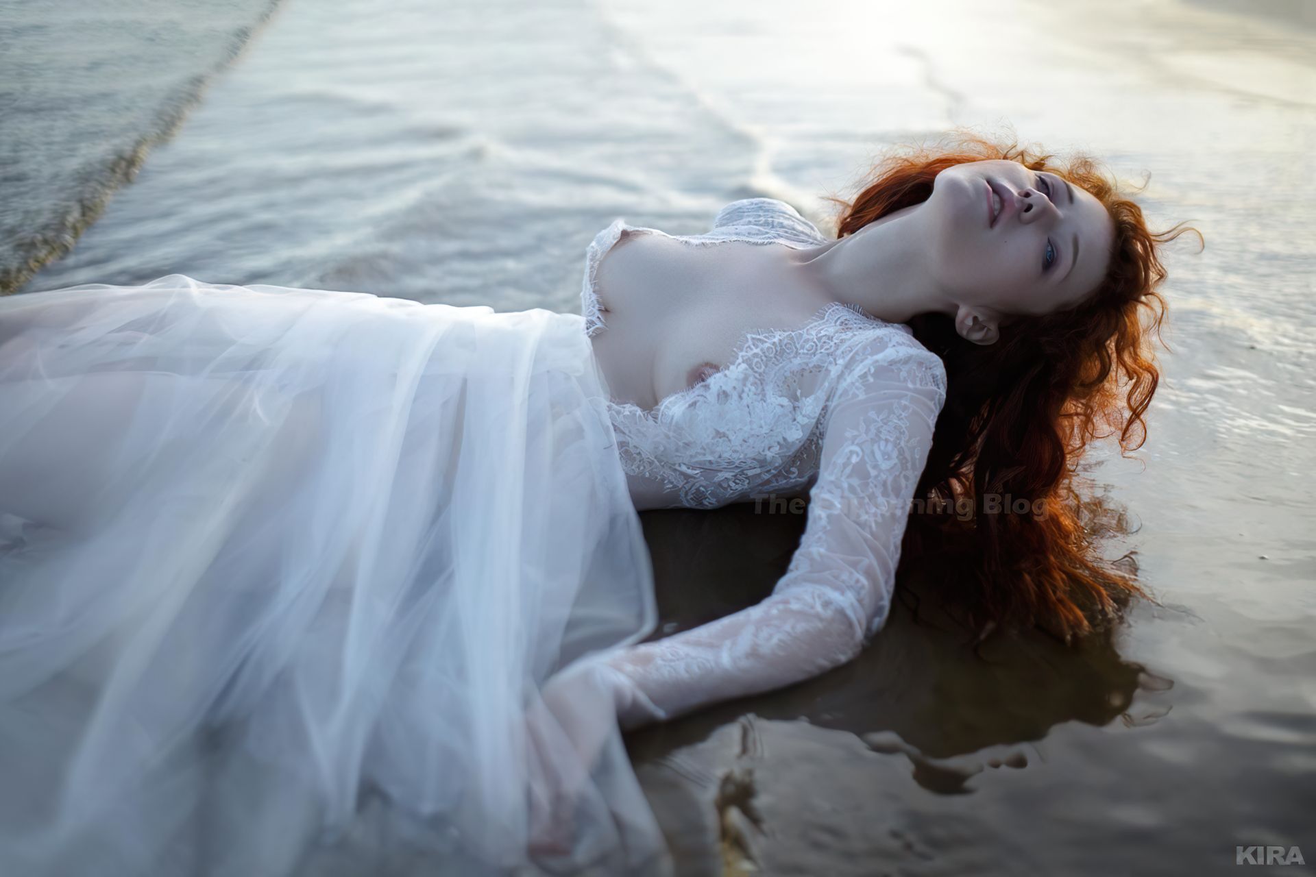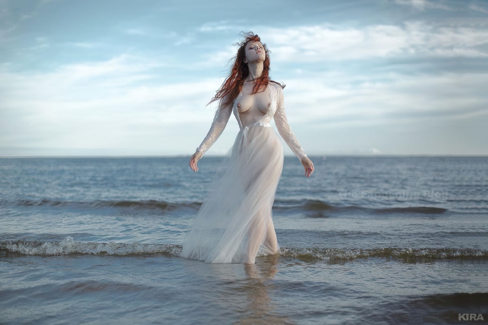 Modelo y diseñadora rusa pelirroja de cosplay Lada Lyumos va del bosque al mar vistiendo hermosos vestidos transparentes y poco más en una sesión de fotos de Kira Mitenkova.