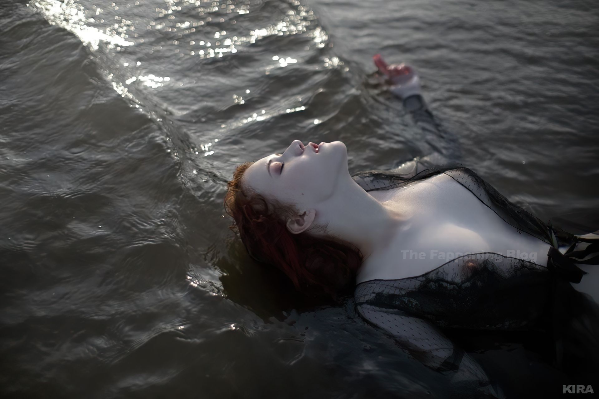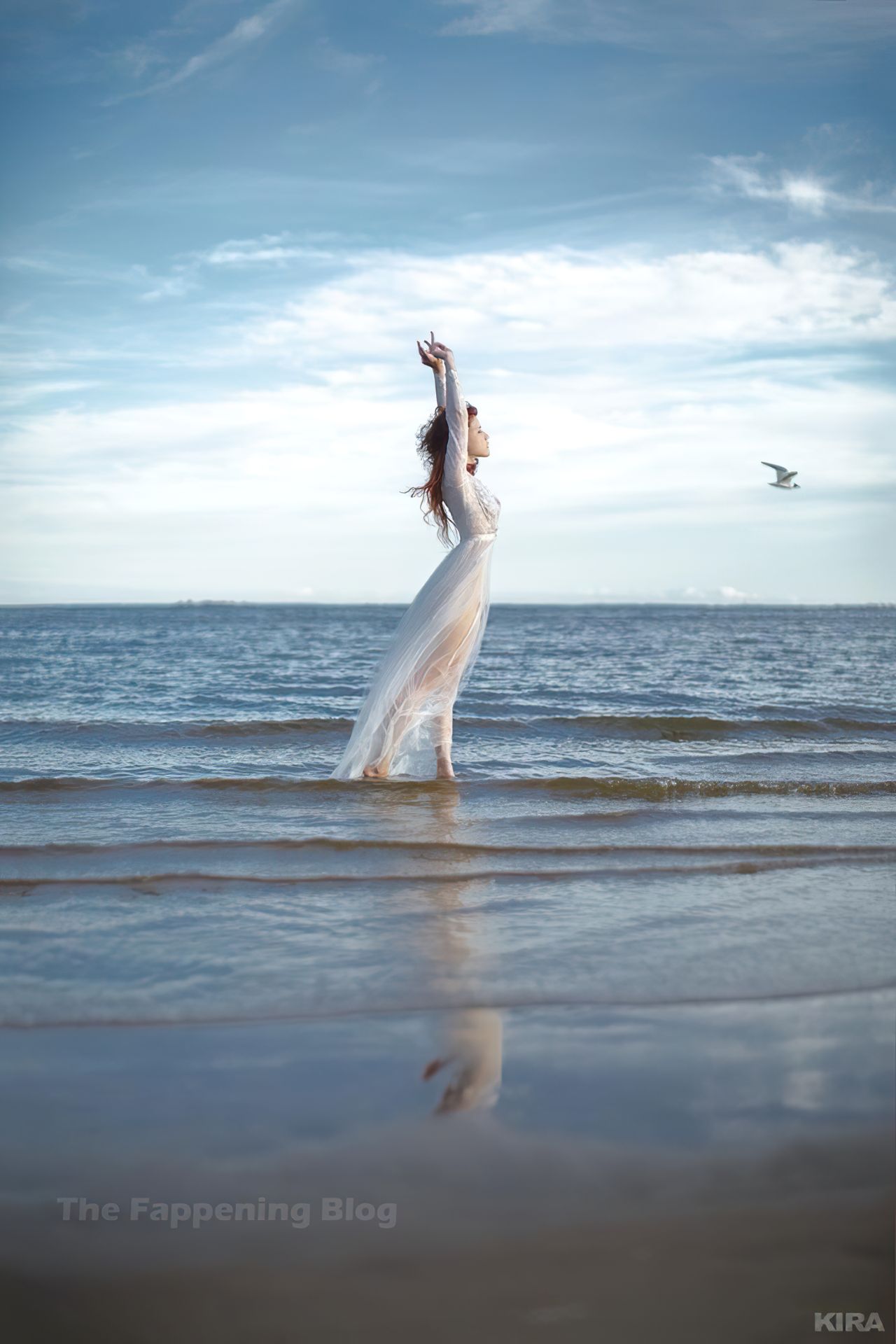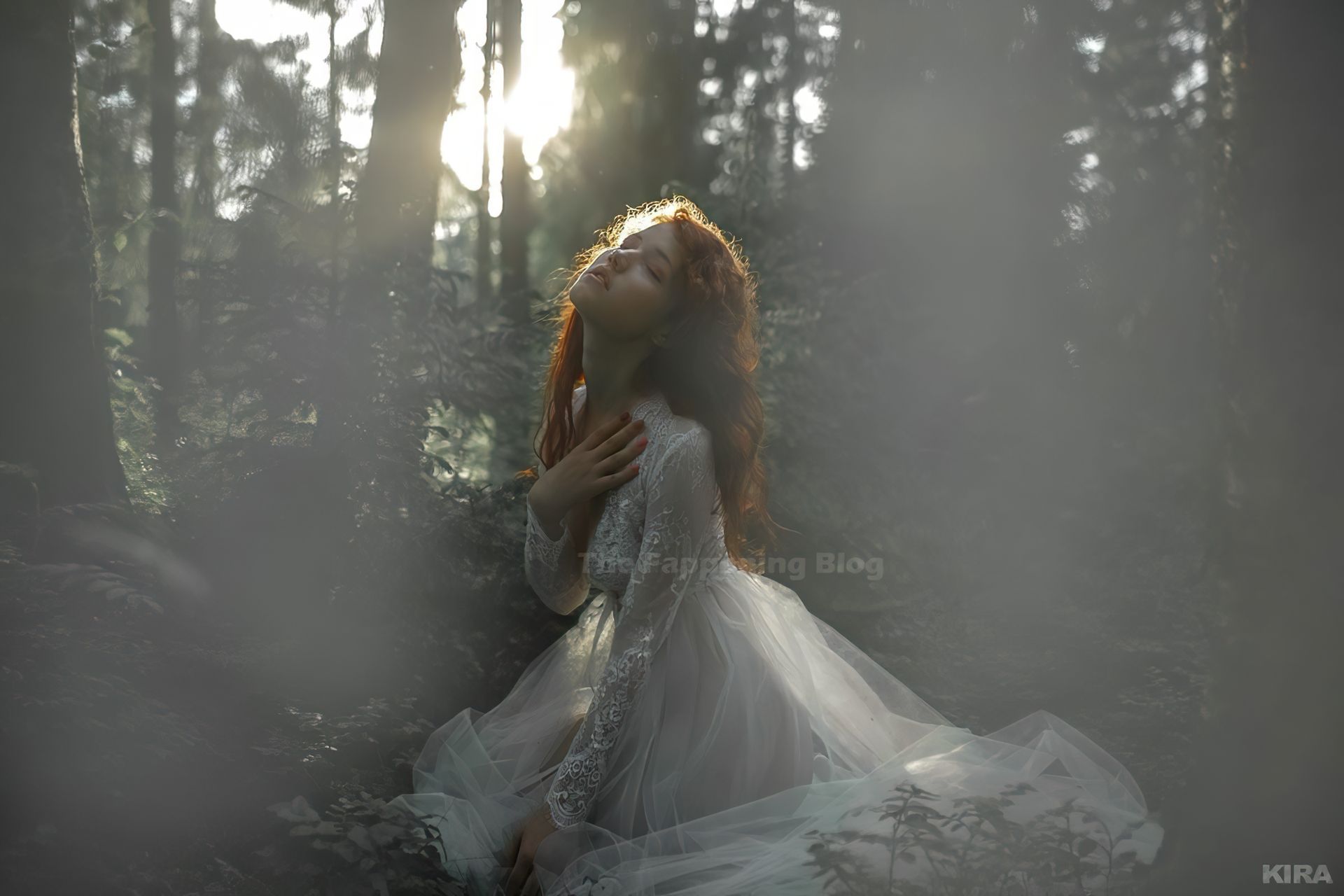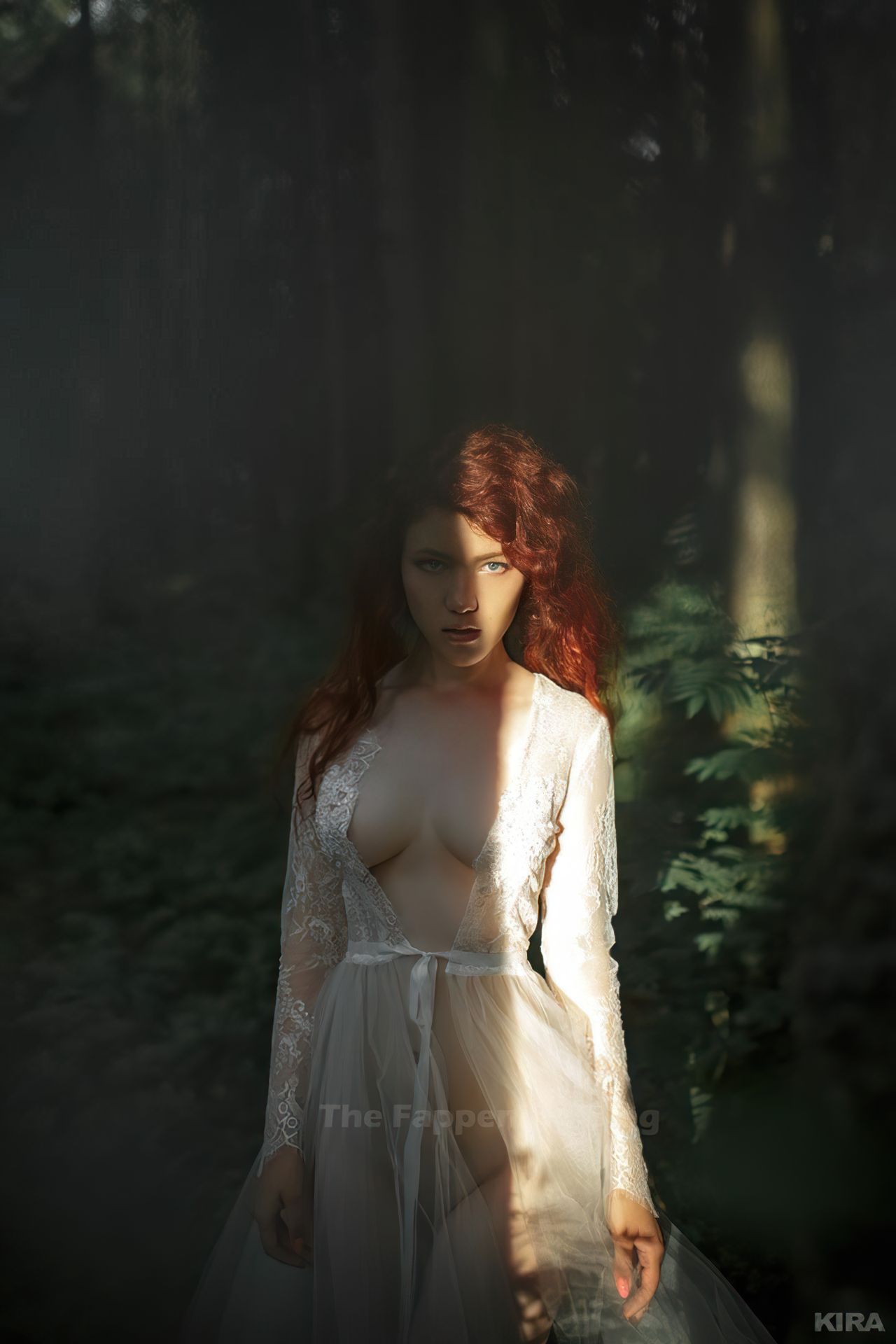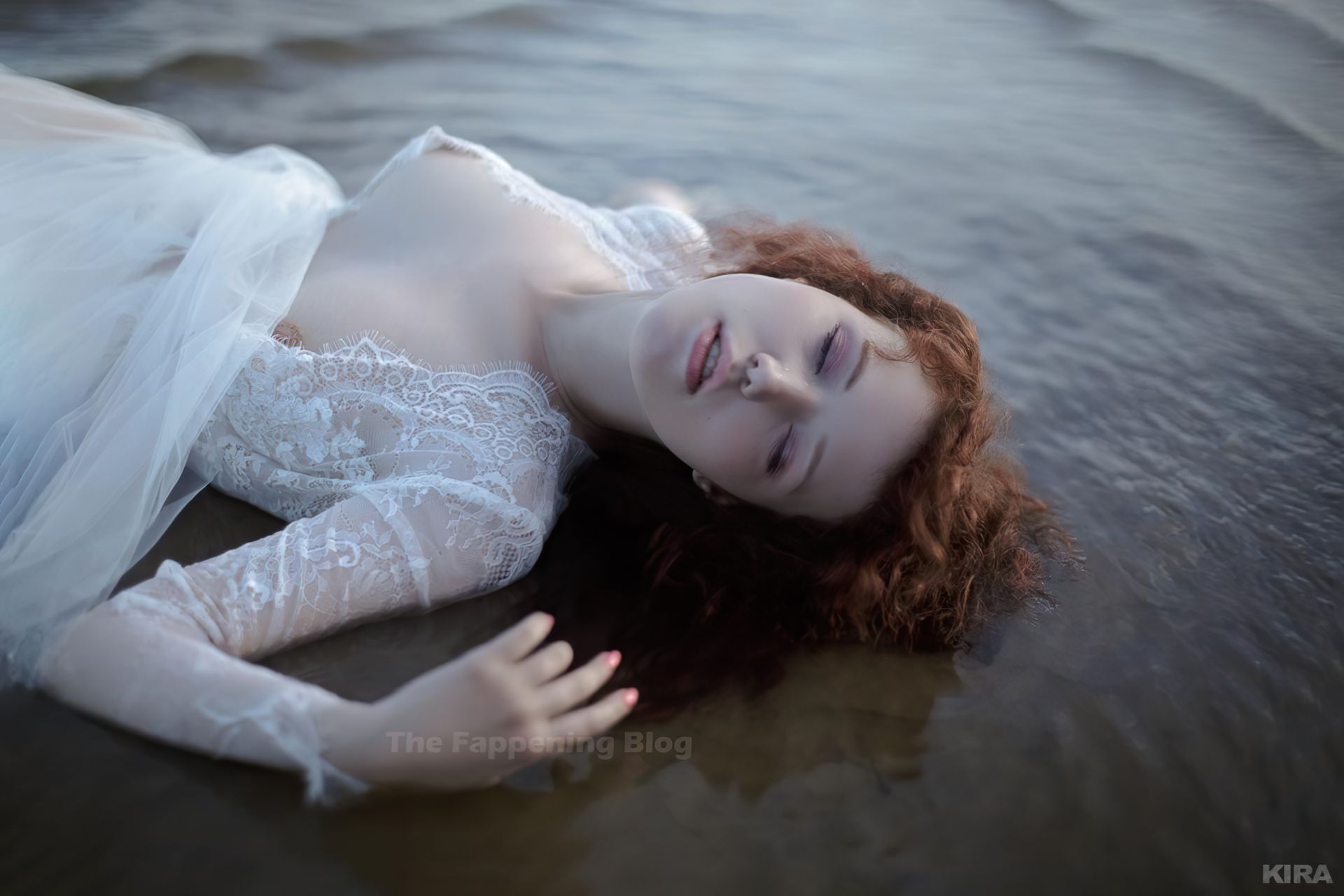 Modelo y diseñadora rusa pelirroja de cosplay Lada Lyumos va del bosque al mar vistiendo hermosos vestidos transparentes y poco más en una sesión de fotos de Kira Mitenkova.