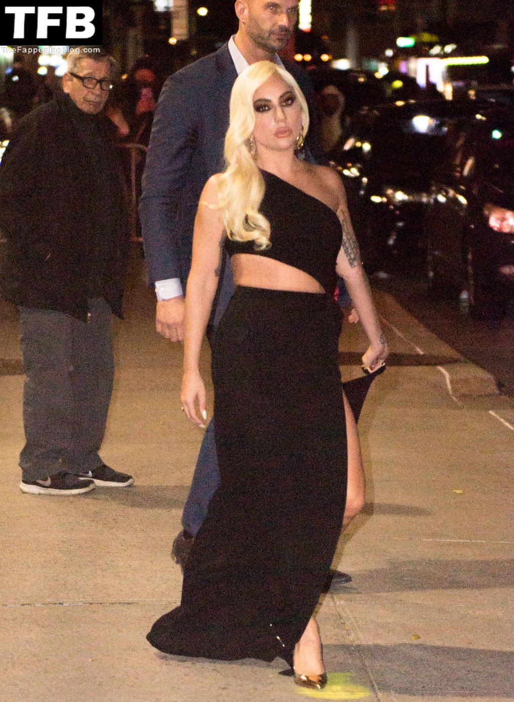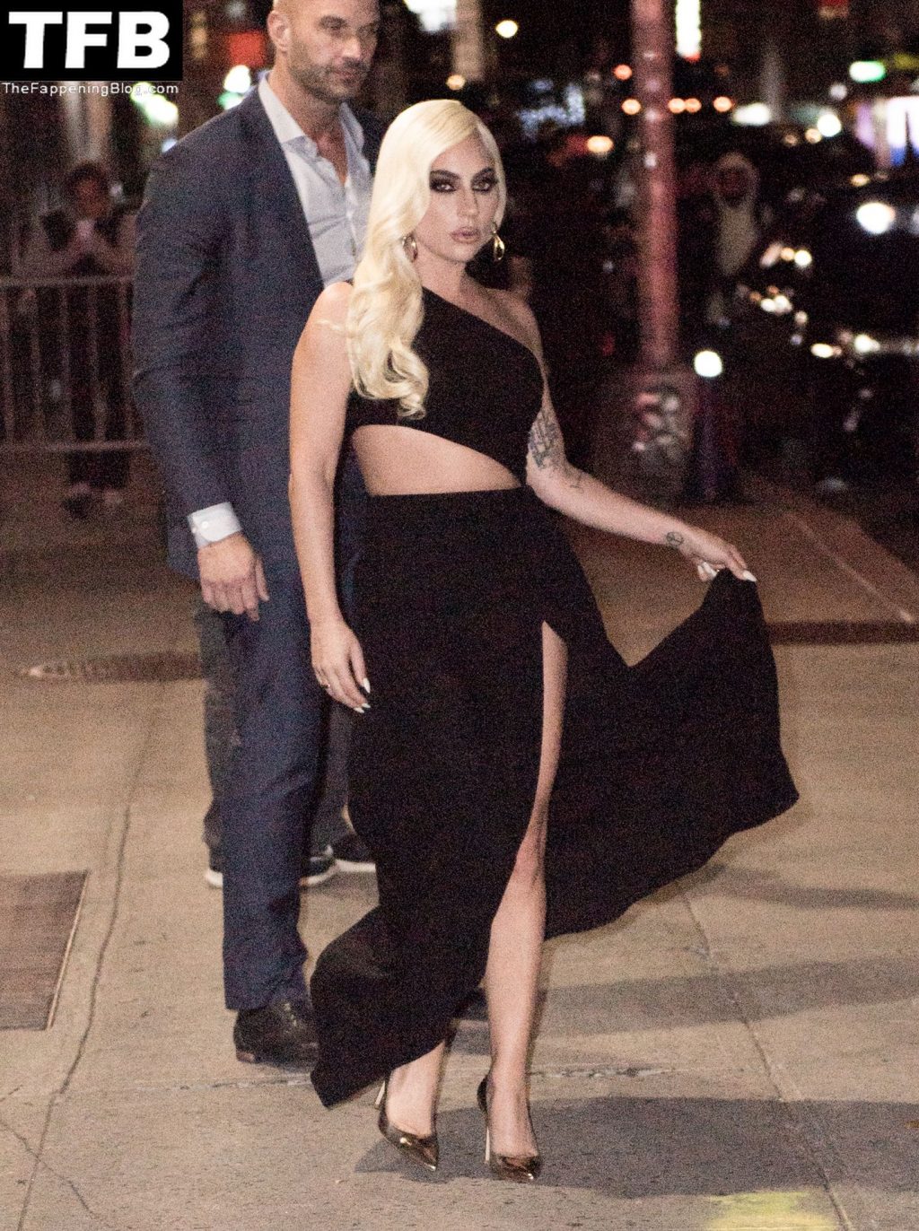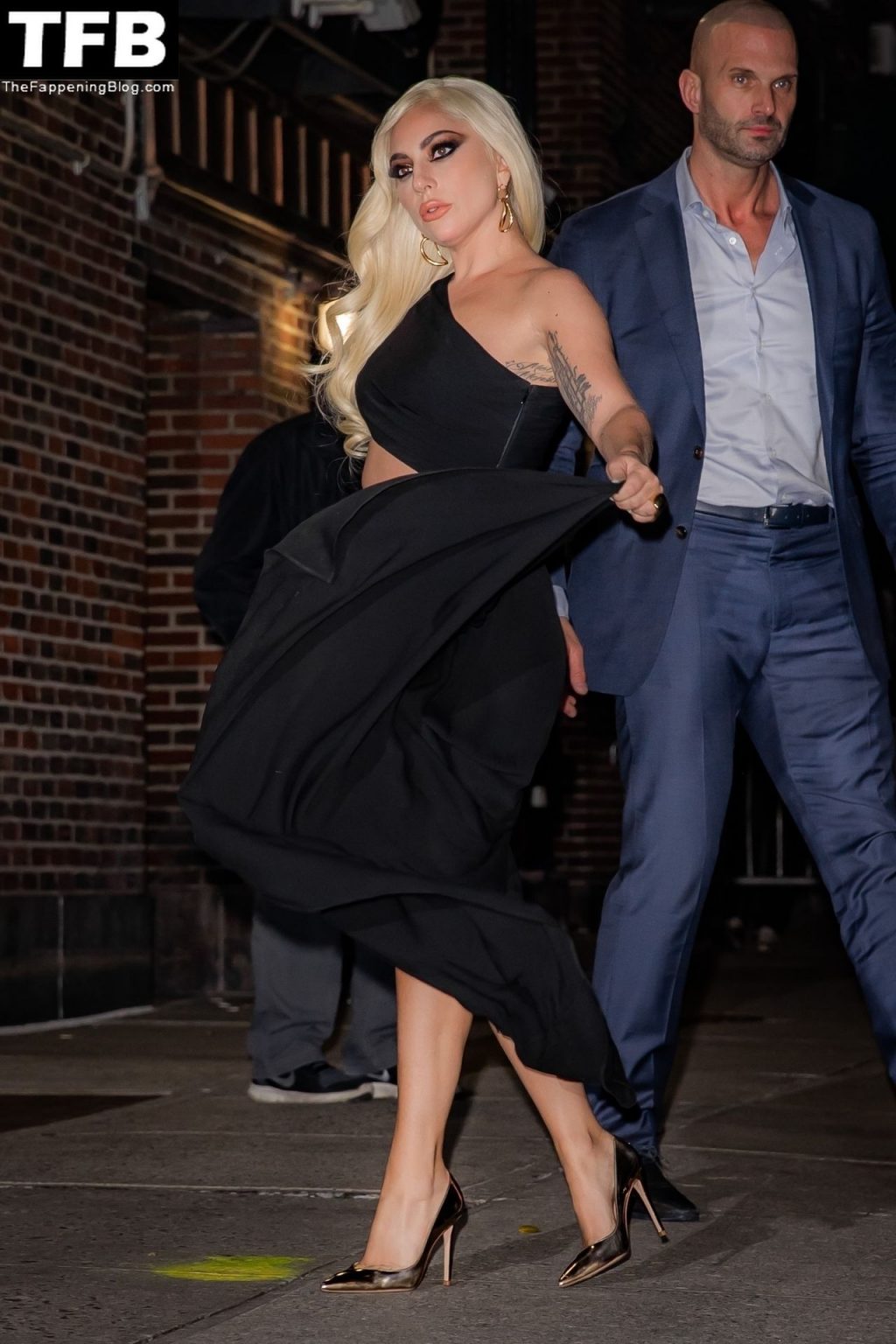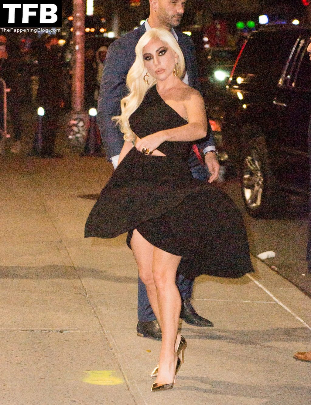 Lady Gaga fue vista saliendo del programa de Stephen Colbert en Manhattan y luciendo un vestido con corte en la pierna, posando como Marilyn Monroe… con su ropa interior color nude visible. La actriz convertida en cantante salió a promocionar su nueva película ‘House of Gucci’.