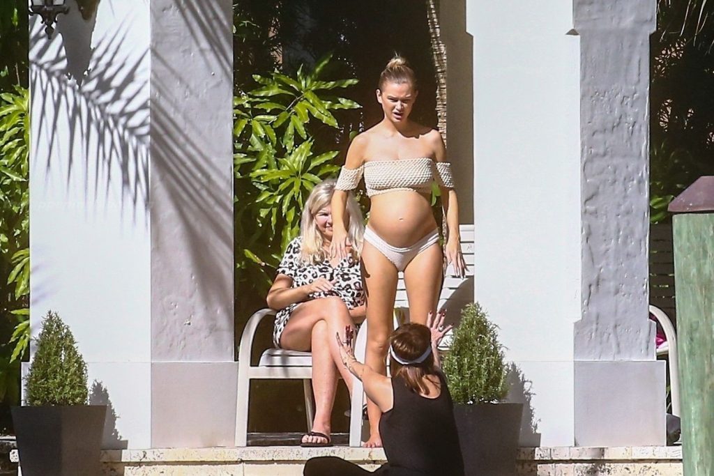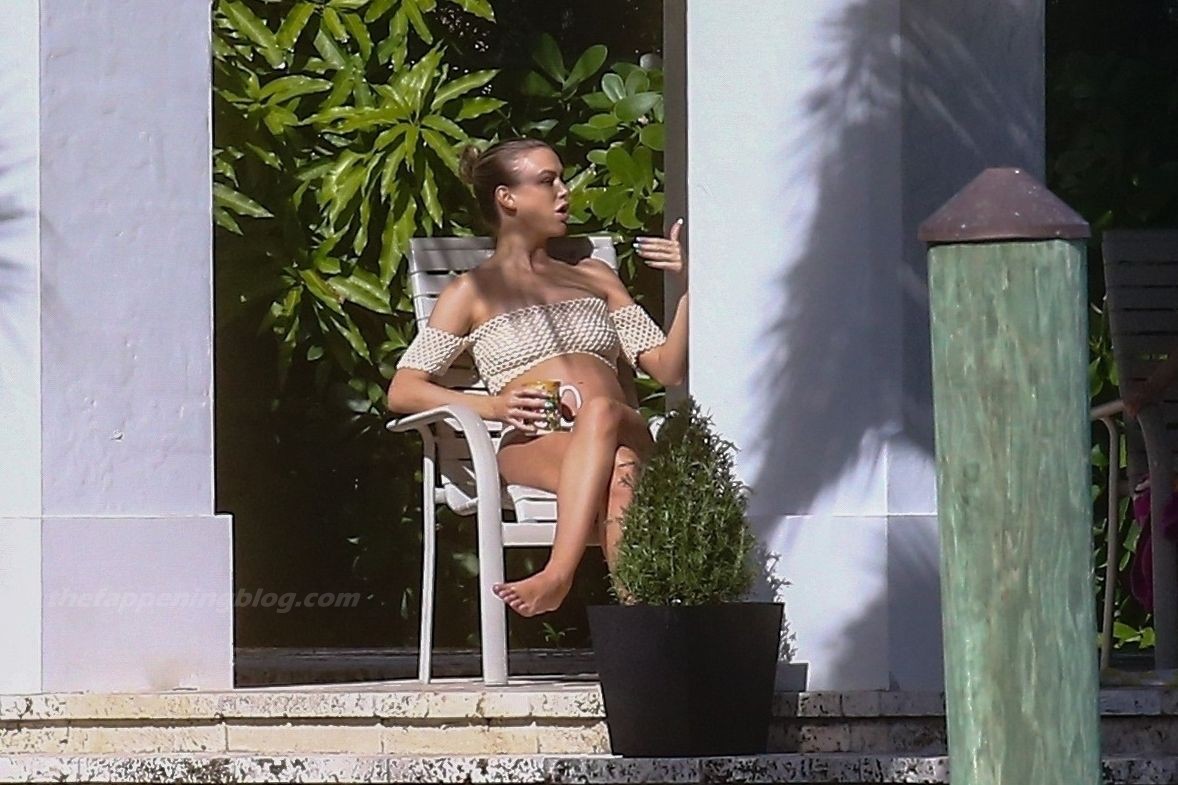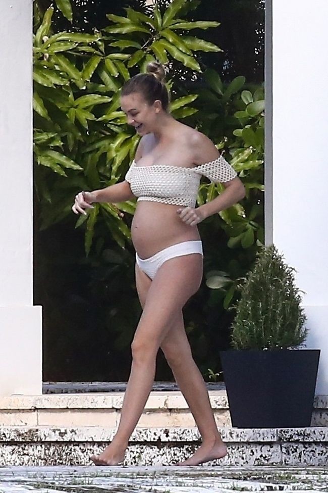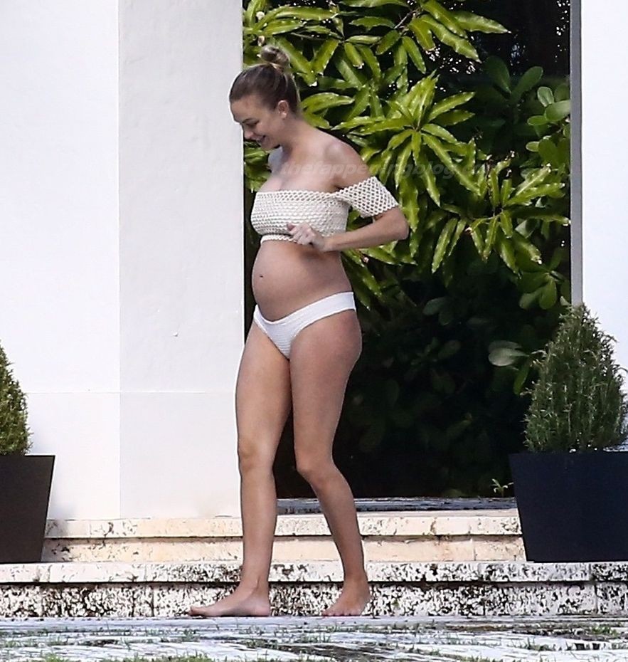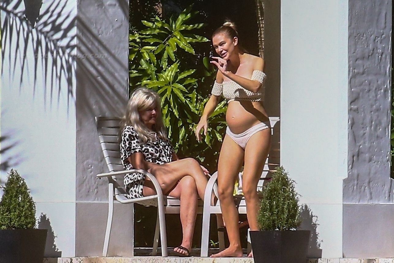La embarazada Lala Kent lleva un bikini crema mientras pasa el rato con Randall Emmett y su familia fuera de su casa en Miami hoy. A Lala le encantó tomar un poco de sol mientras lucía orgullosa su barriga de embarazada.