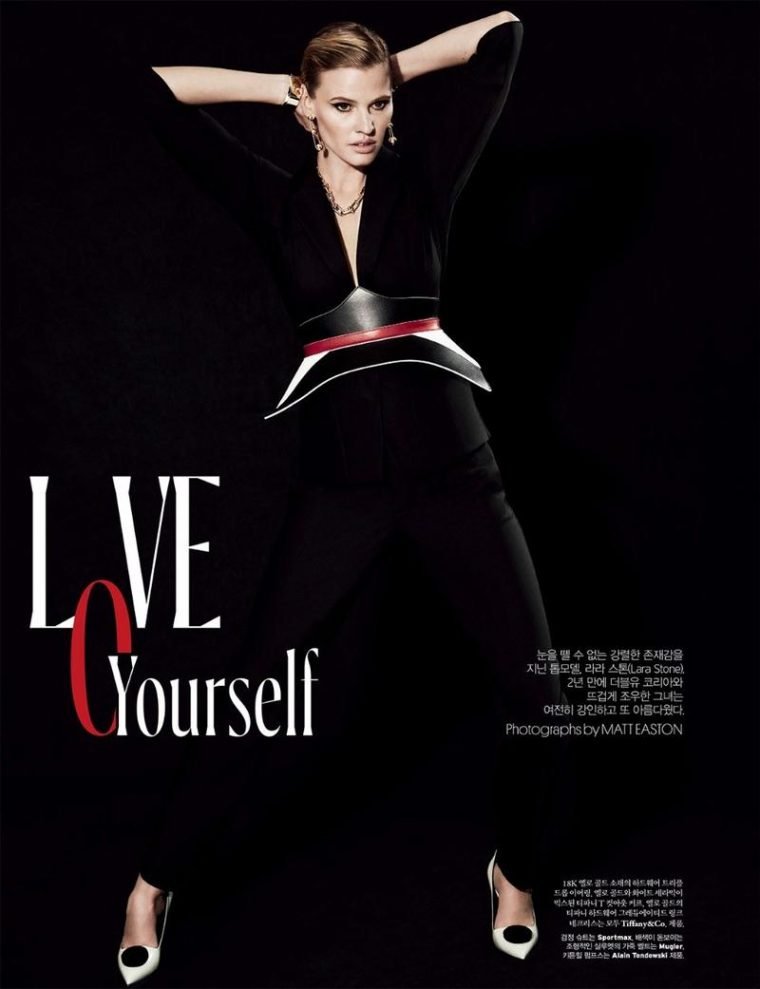 Lara Stone muestra sus perfectos pechos europeos en W Magazine Corea (diciembre de 2017). Fotografía de Matt Easton. Lara Catherina Stone es una modelo de moda top de los Países Bajos. Edad – 33.