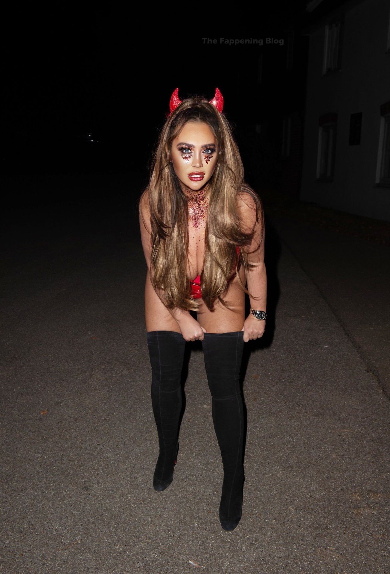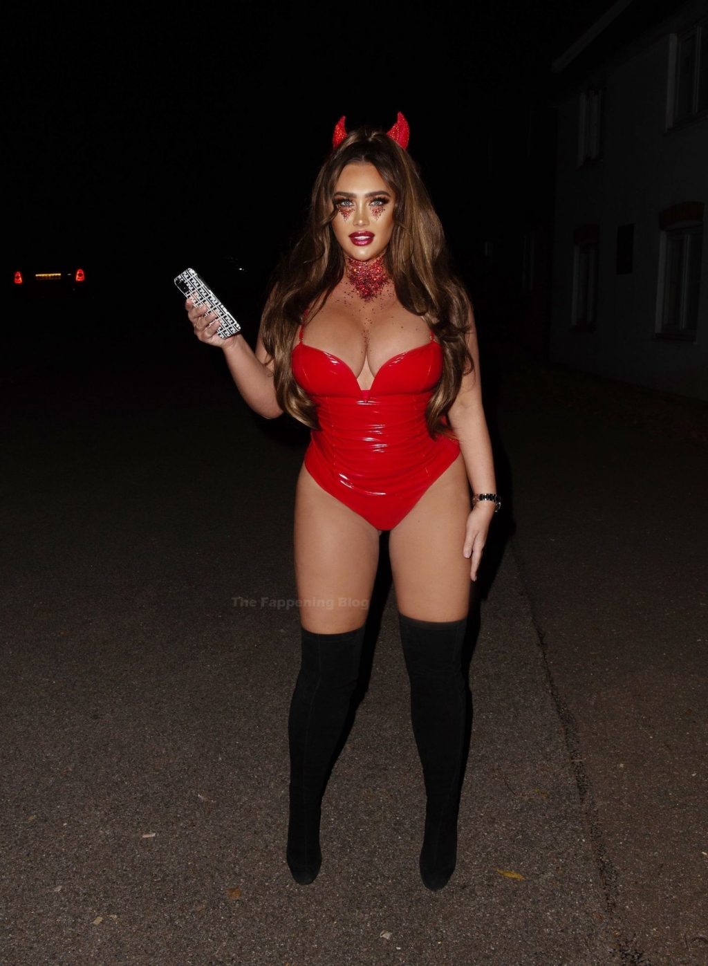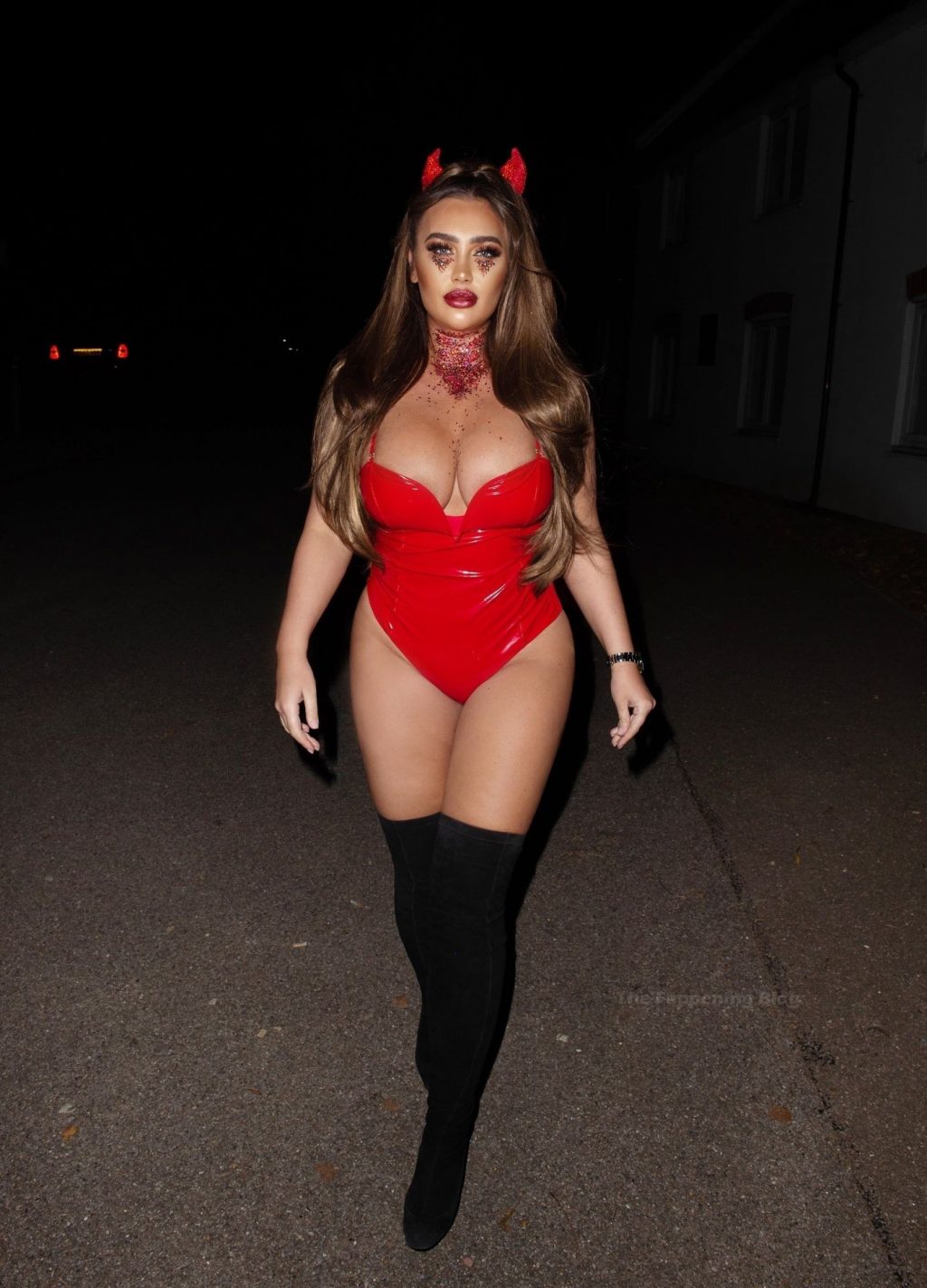 Lauren Goodger se mete en el espíritu de Halloween mientras se la ve saliendo en Essex anoche. La estrella de reality muestra su increíble trasero y escote con un ajustado disfraz de diablo rojo.