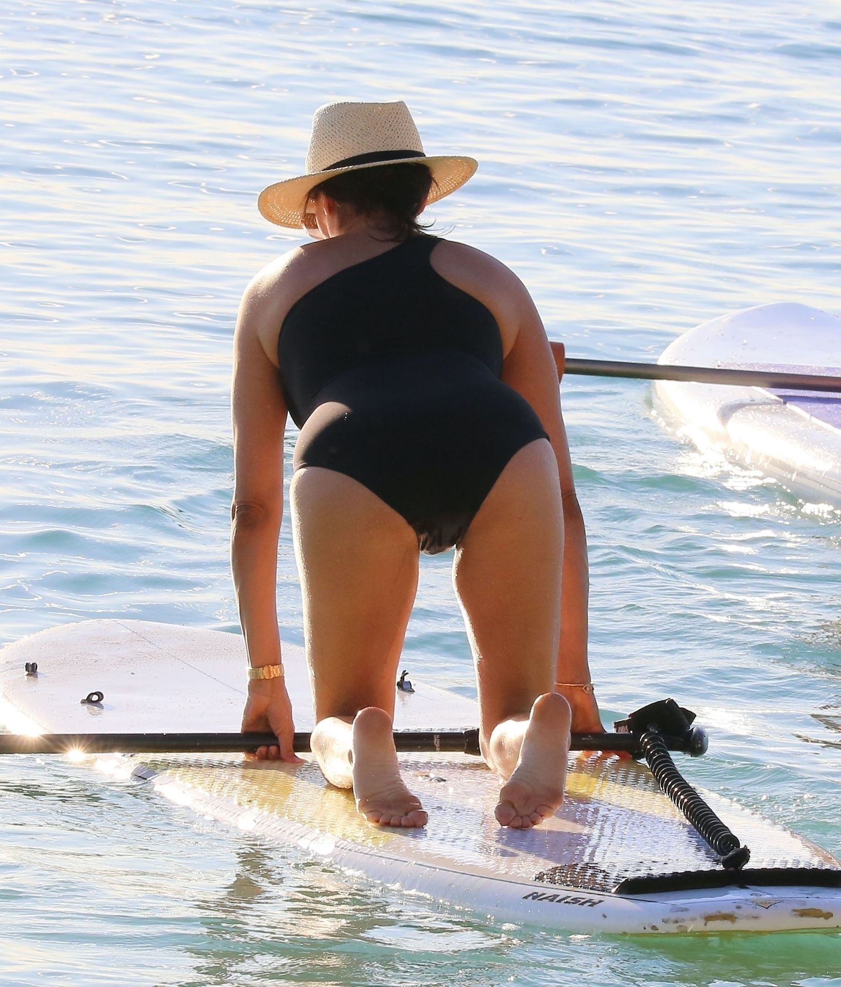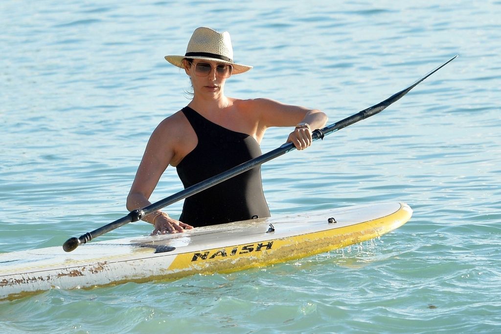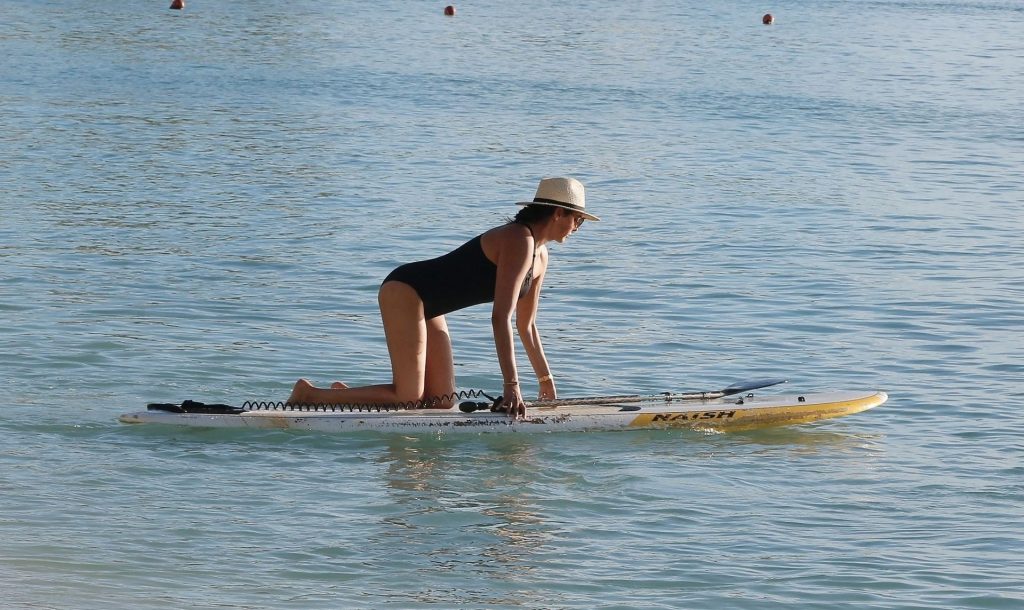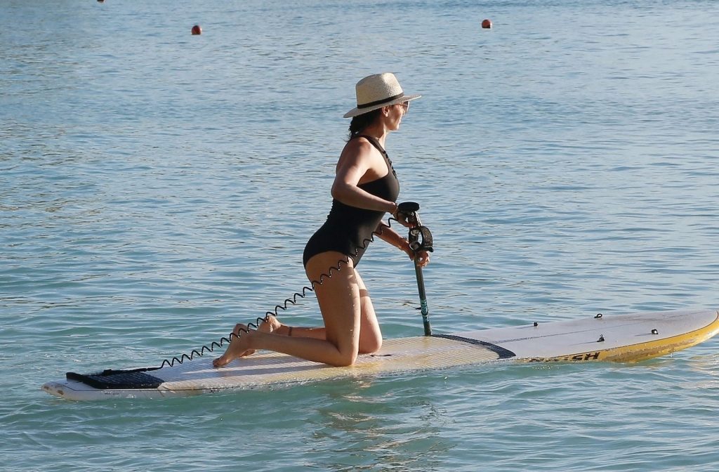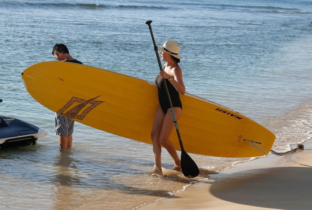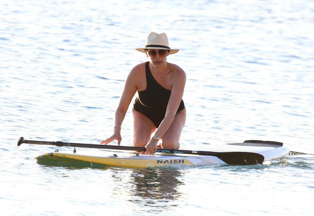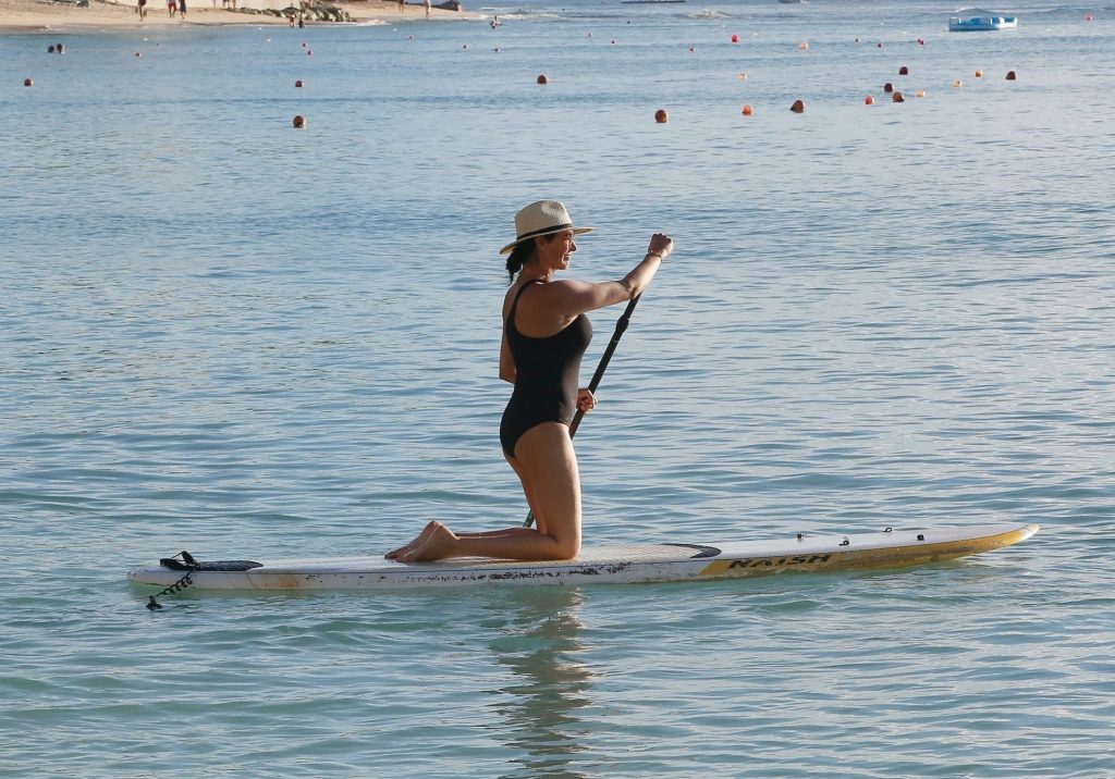 Lauren también lucía genial con su traje de baño negro, mostrando su trasero, piernas, pechos, y ella atrapa las olas practicando paddleboard en el mar.