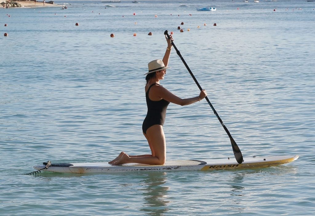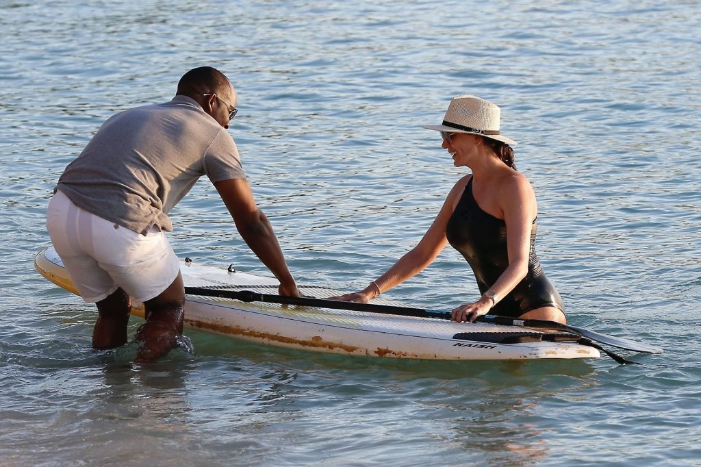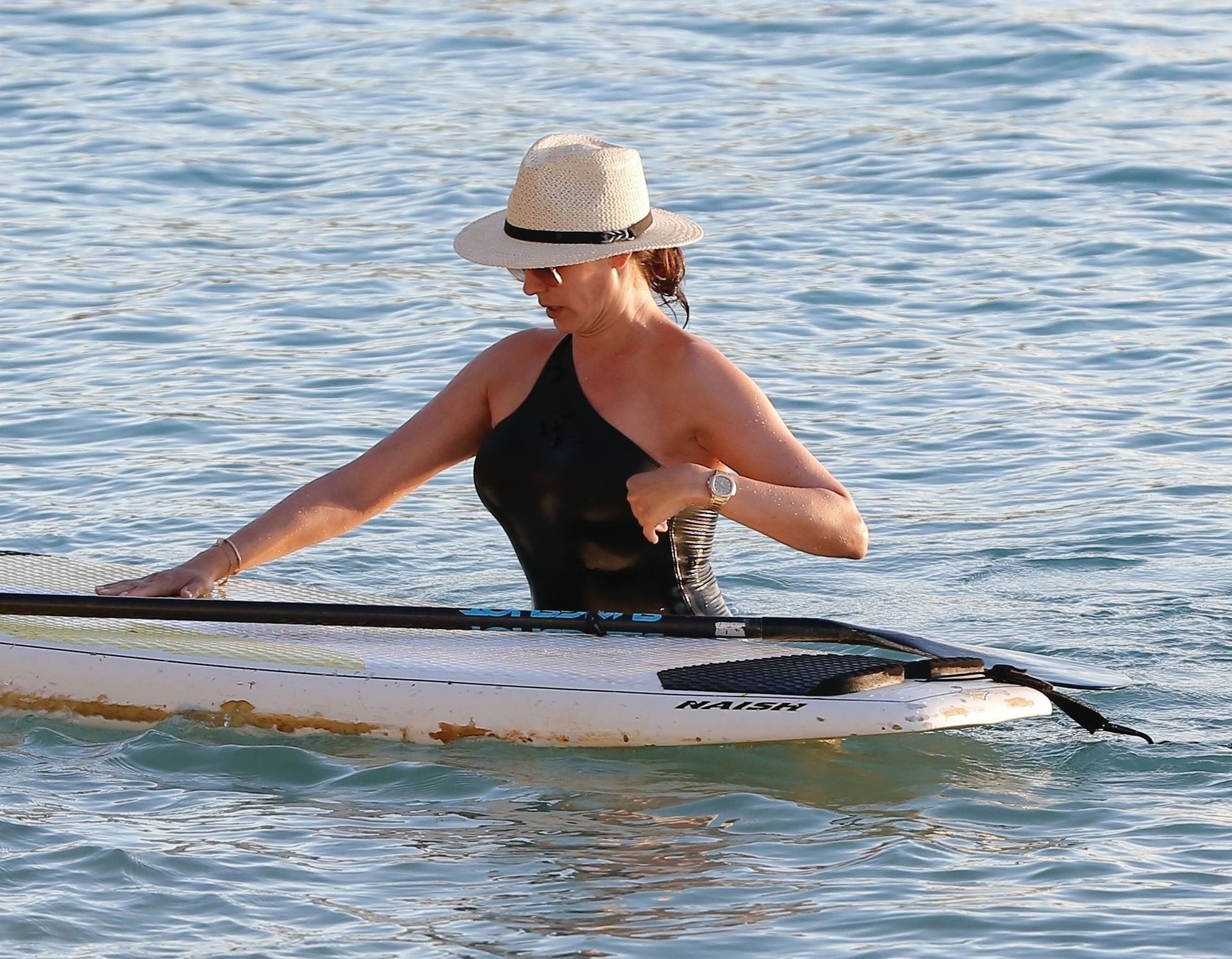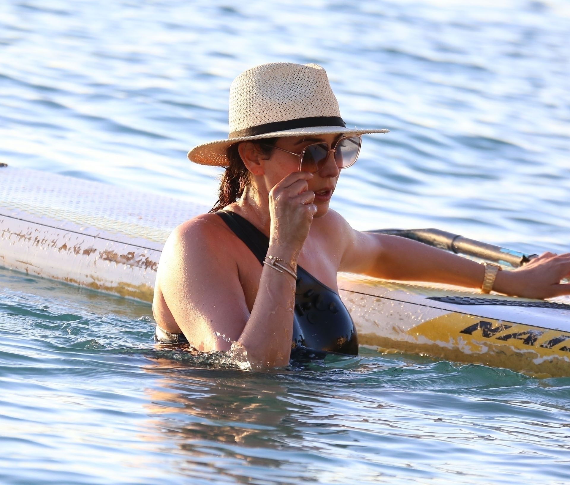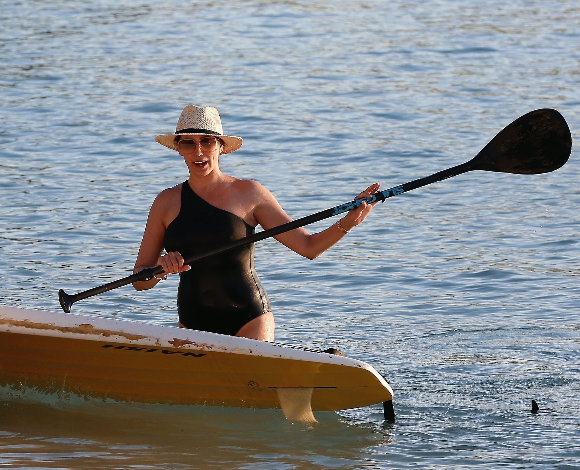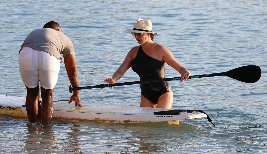 Lauren también lucía genial con su traje de baño negro, mostrando su trasero, piernas, pechos, y ella atrapa las olas practicando paddleboard en el mar.