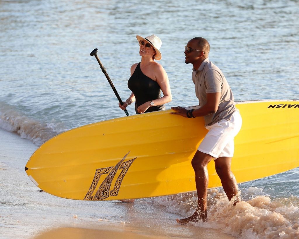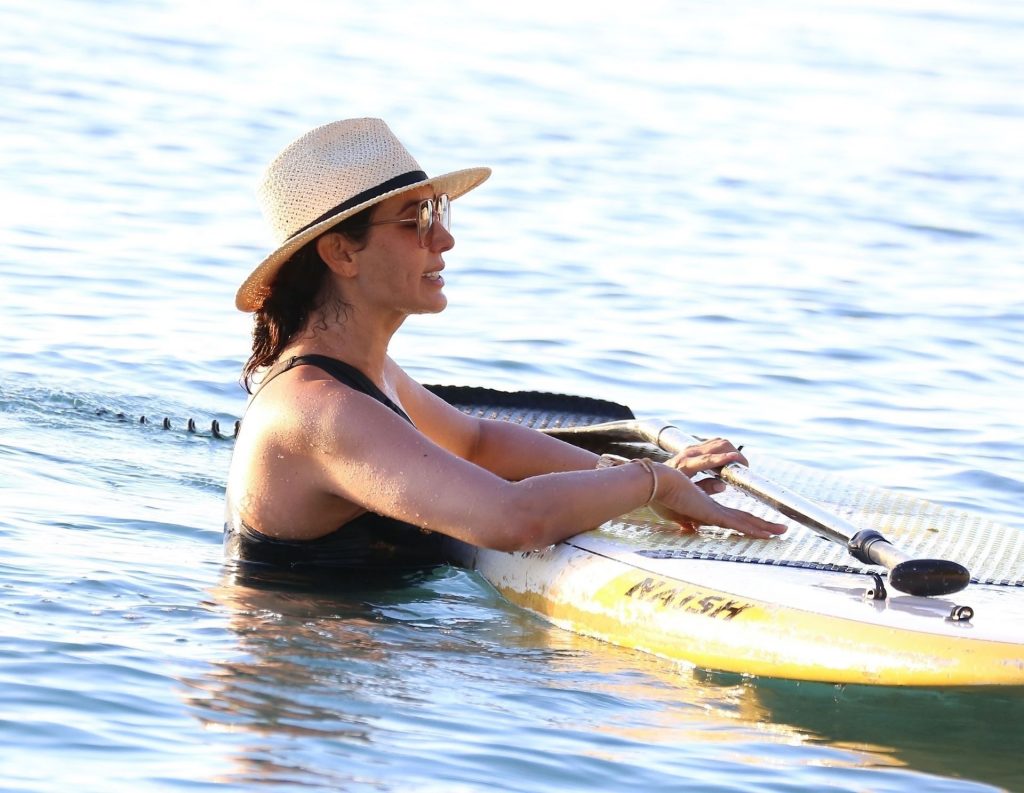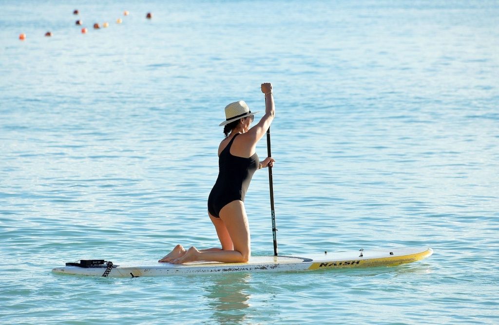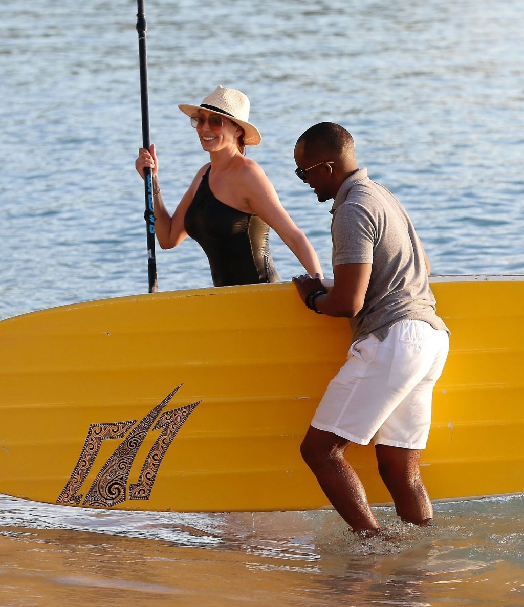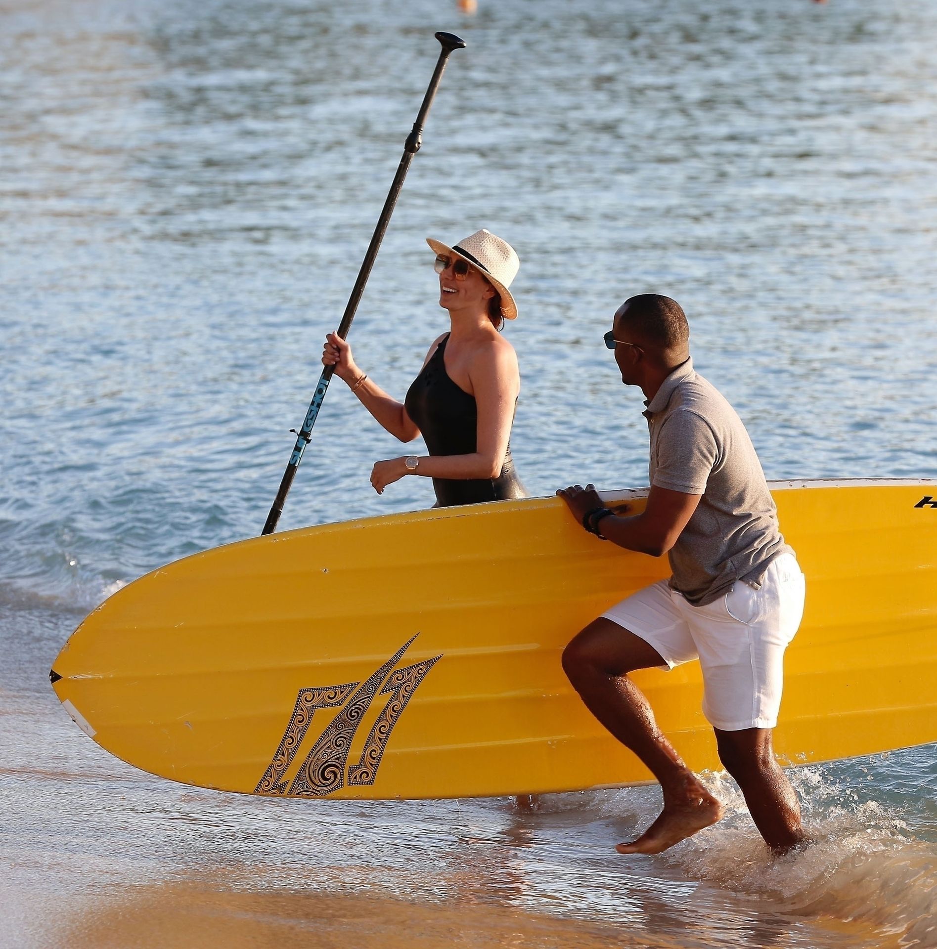 Lauren también lucía genial con su traje de baño negro, mostrando su trasero, piernas, pechos, y ella atrapa las olas practicando paddleboard en el mar.
