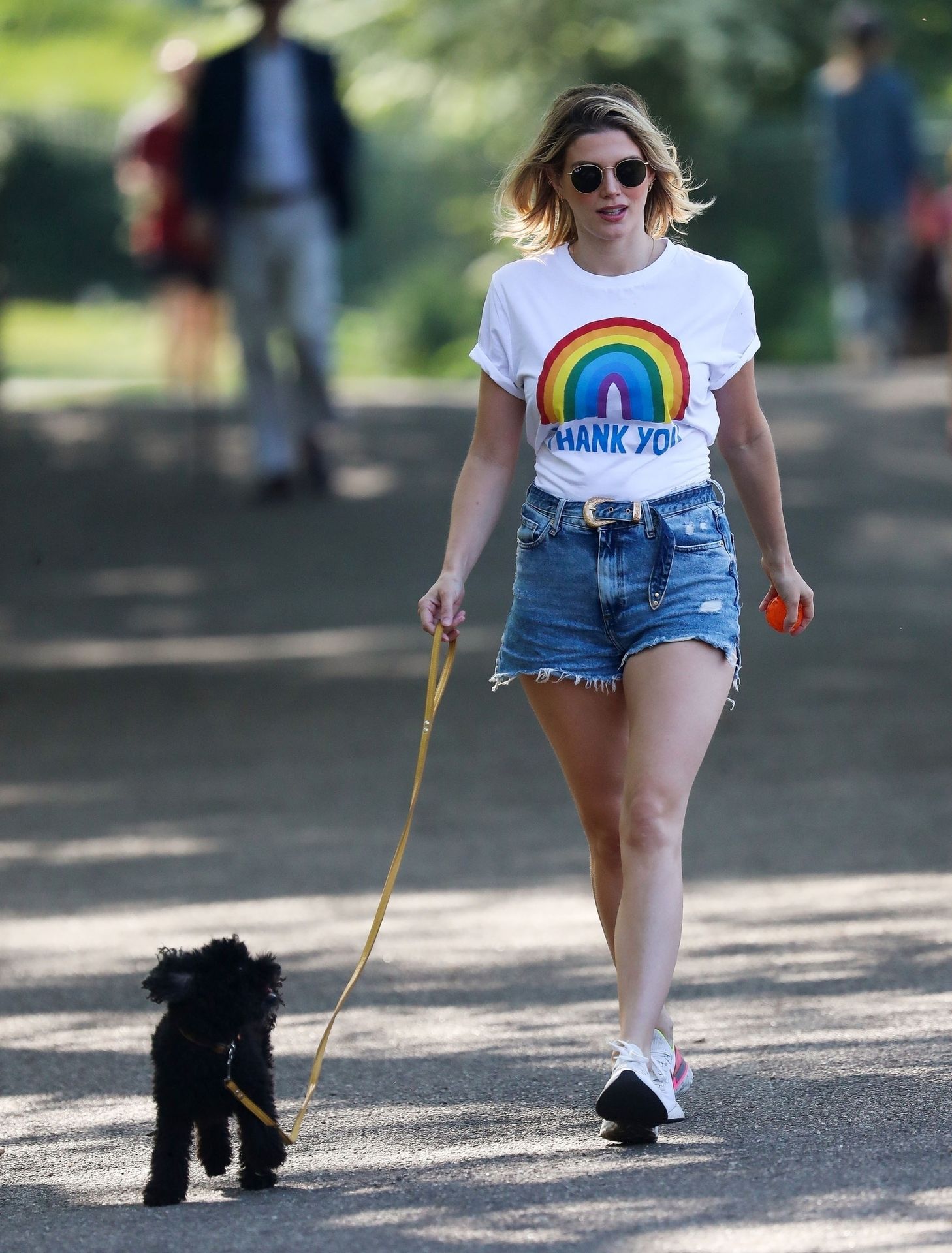 La presentadora de televisión y DJ Ashley James fue fotografiada luciendo genial con los shorts de mezclilla estilo ‘Daisy Duke’ mientras apoyaba al NHS con una camiseta, disfrutando de un paseo con su perro en un parque local de Londres, 24/04/2020.