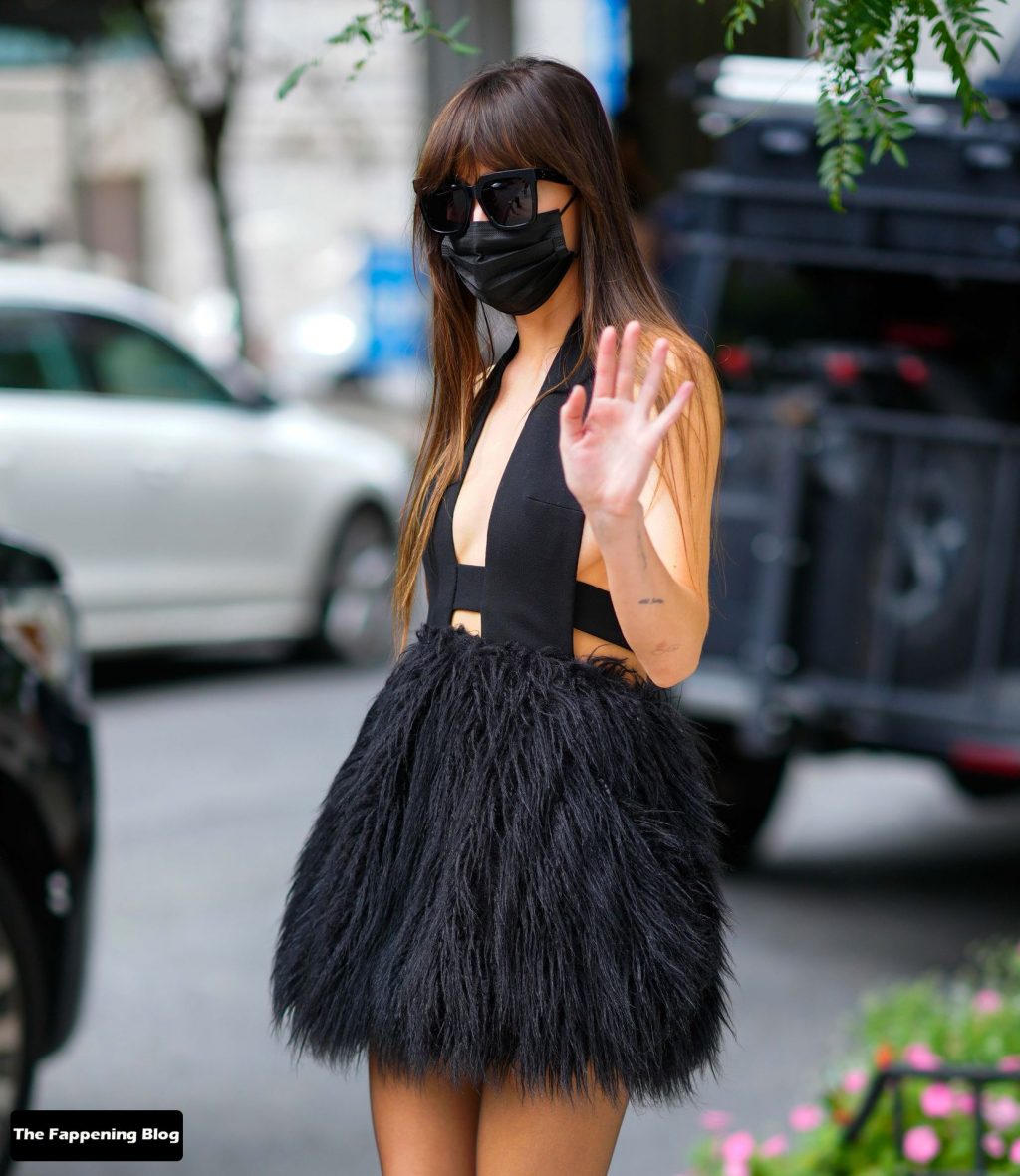 La actriz Dakota Johnson sale con un vestido revelador en la ciudad de Nueva York, 30/09/2021. La actriz de 31 años llevaba una mascarilla negra, un vestido a juego y tacones.