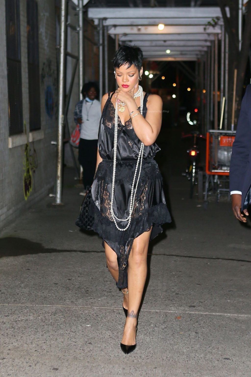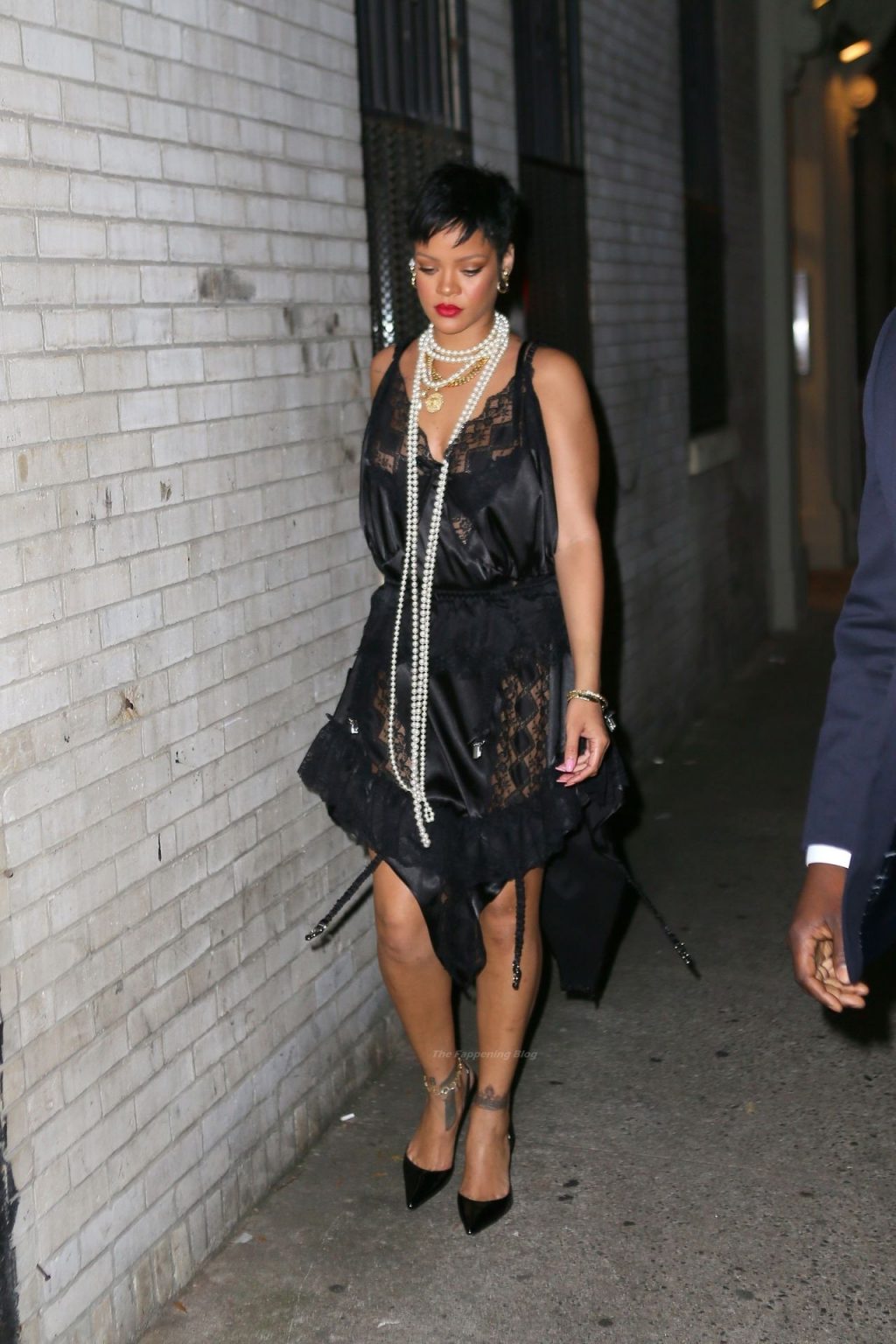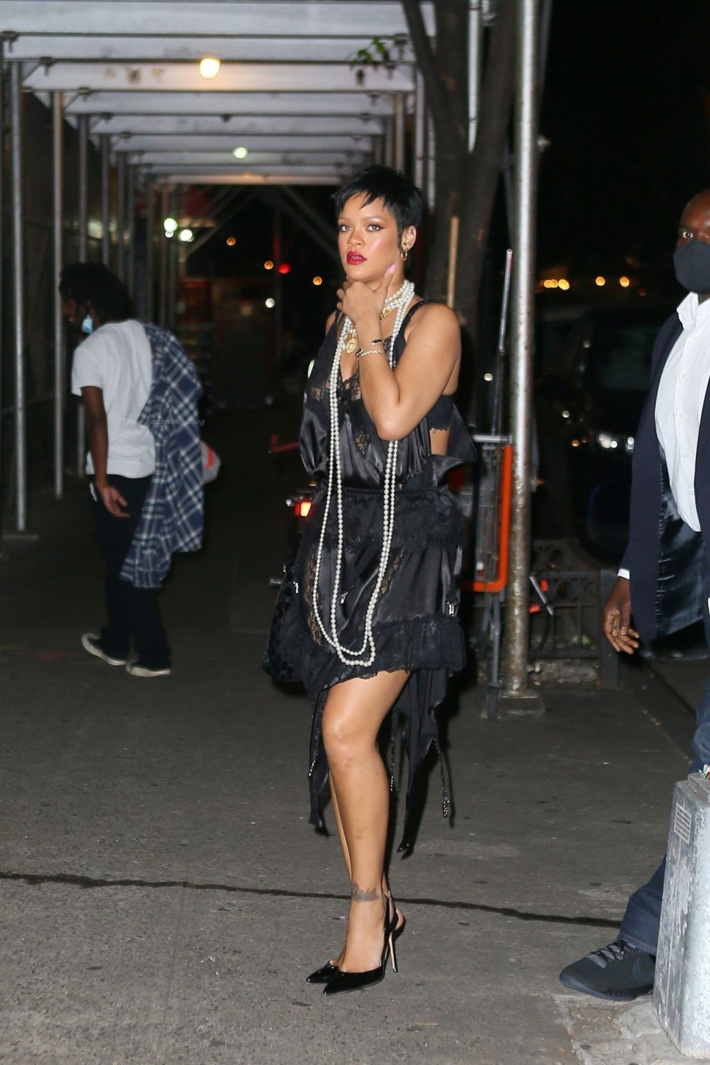Cantante y estrella de The Fappening Rihanna va a cenar al restaurante italiano Carbone con un sexy vestido negro de encaje y tacones – Nueva York, 07/05/2021.