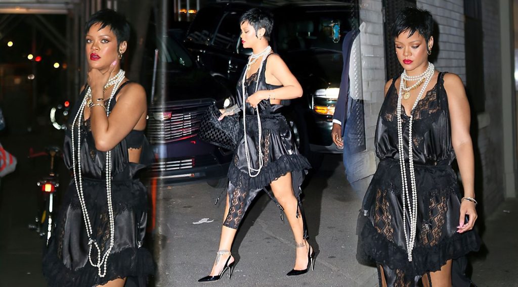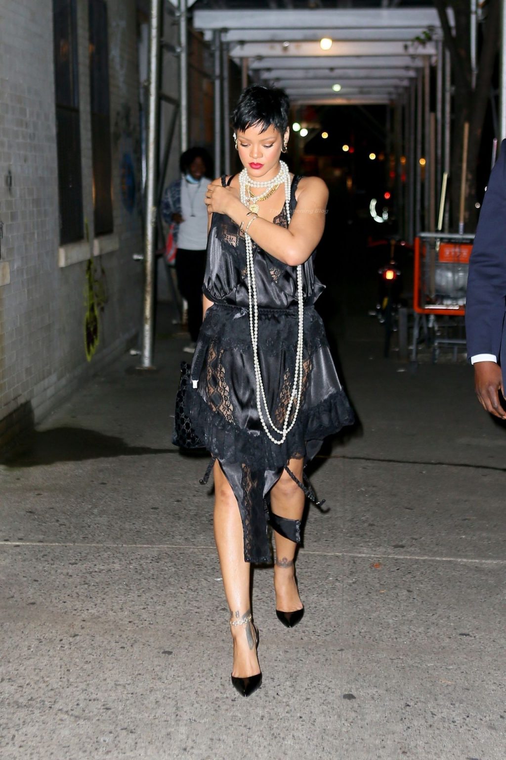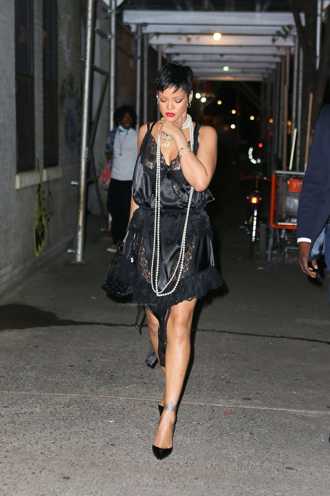 Cantante y estrella de The Fappening Rihanna va a cenar al restaurante italiano Carbone con un sexy vestido negro de encaje y tacones – Nueva York, 07/05/2021.