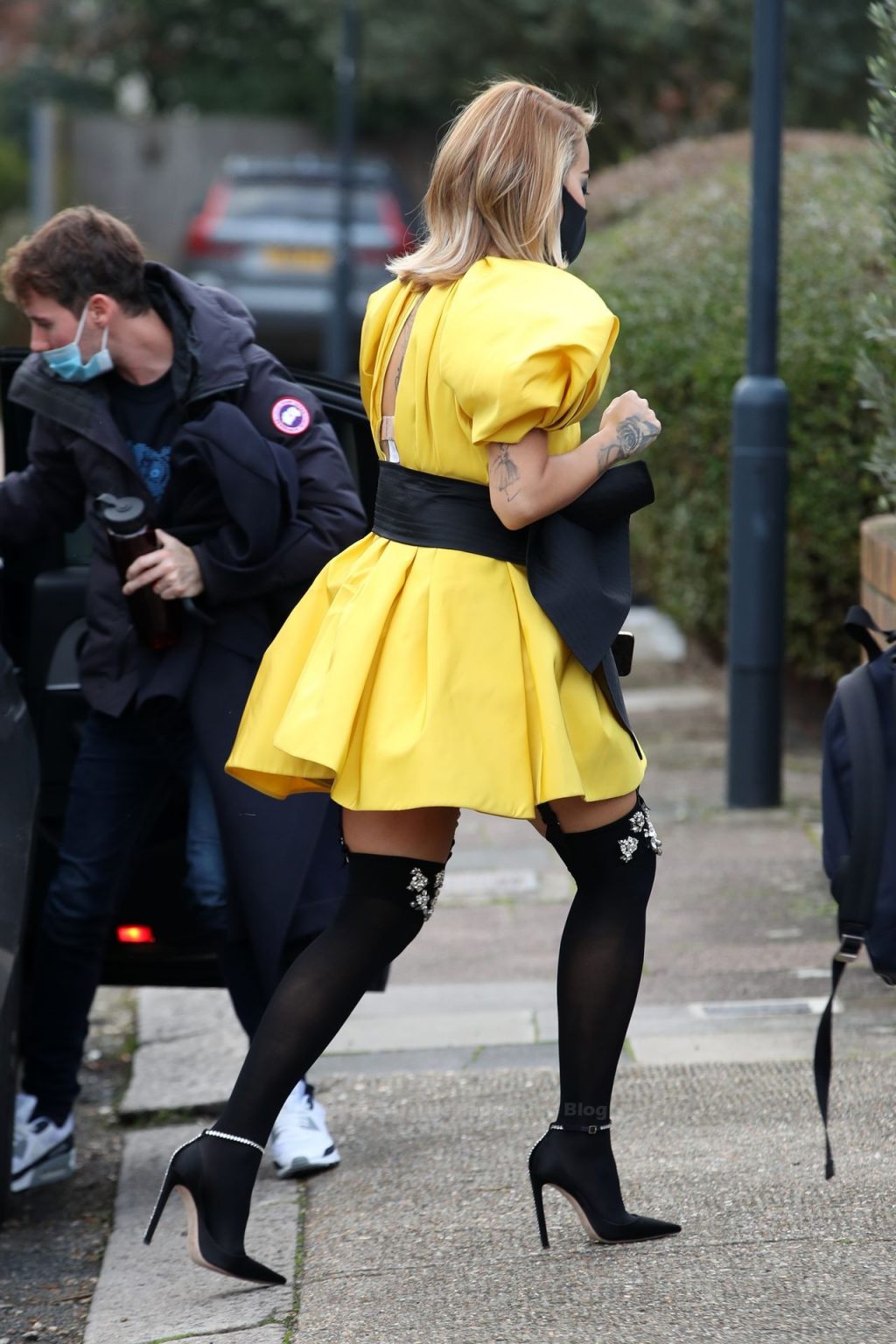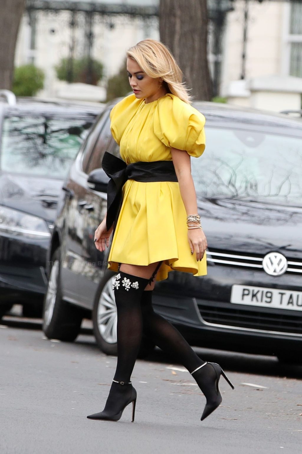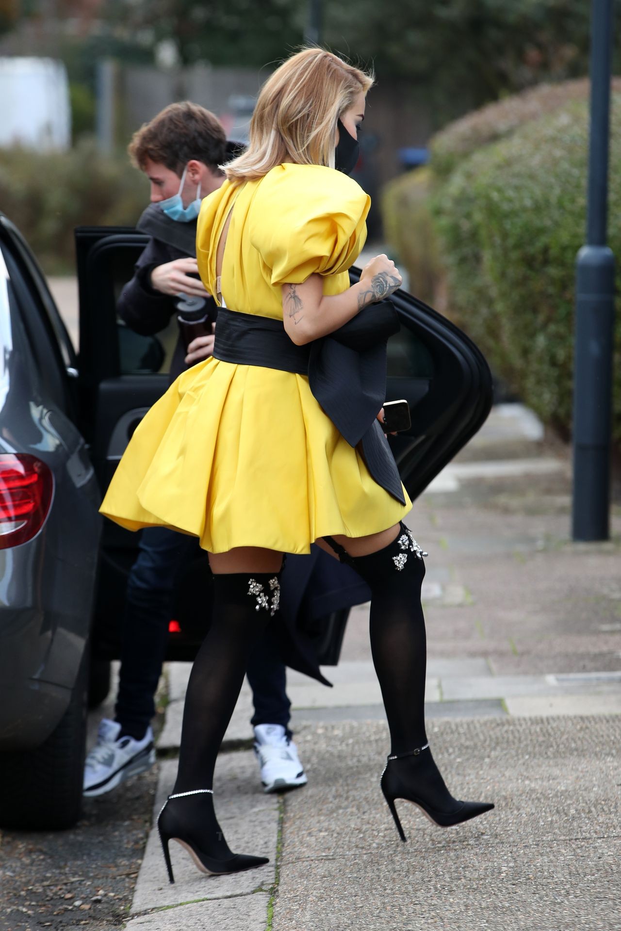 La cantante Rita Ora muestra sus piernas sexys mientras es vista con un vestido amarillo en Londres, 23/11/2020.